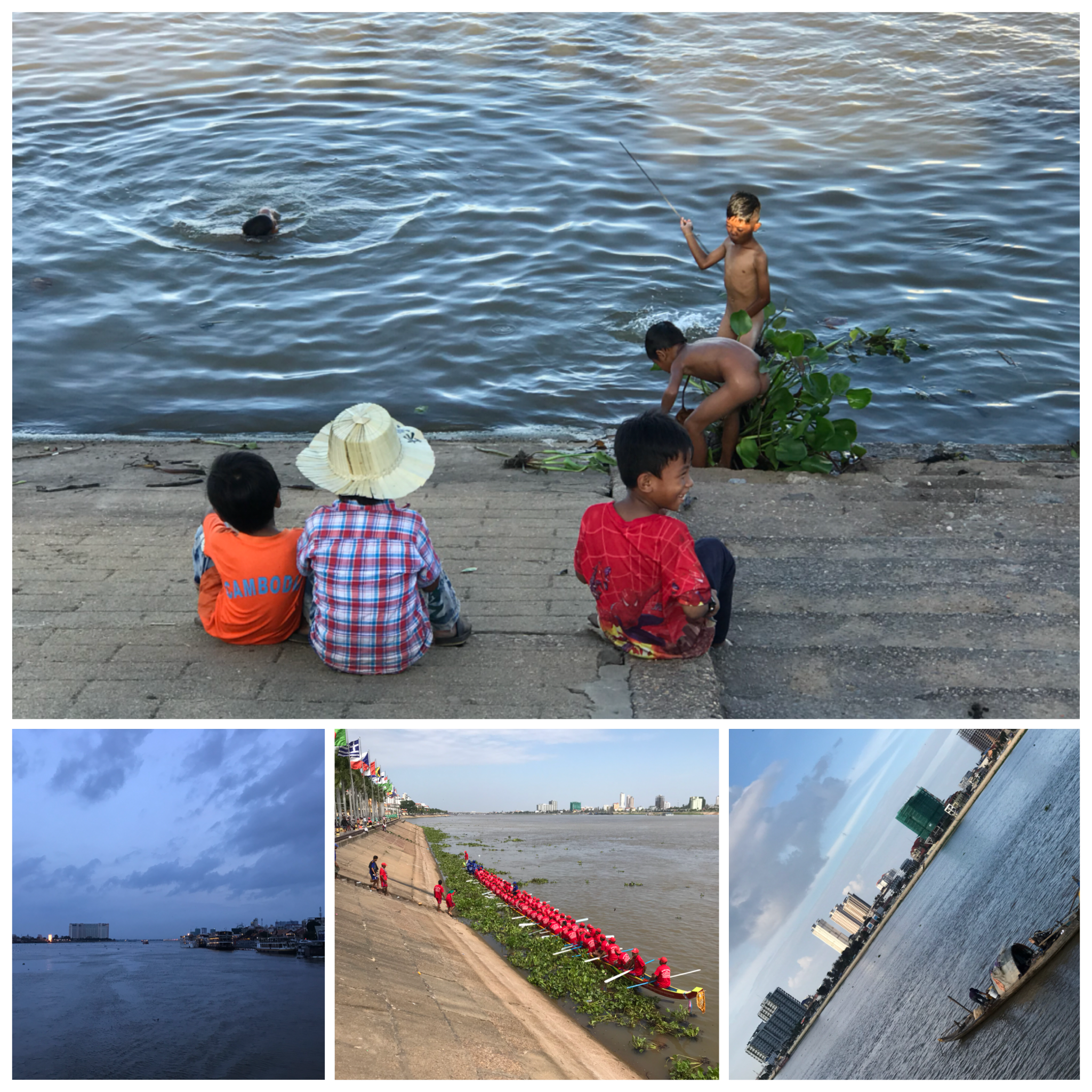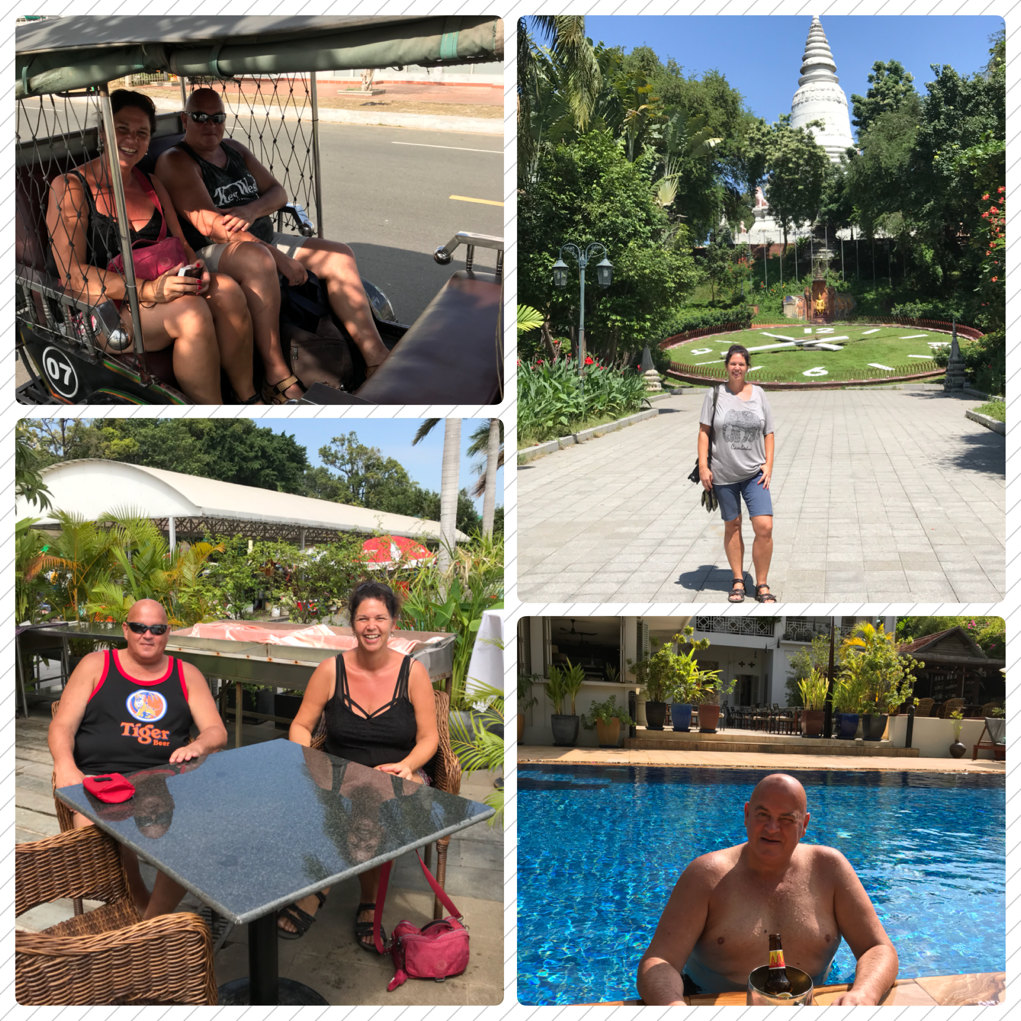 ‘S middags zijn we vrij. We worden bij het hotel er uit gezet. Daar staat altijd een groepje met een tuktuk. Tuktuk madam? Nee. Tuktuk sir? Nee. Maar wel altijd vriendelijk lachen. We gaan eerst even wat drinken en eten. We hebben een favoriet tentje Ying Yang. Een van de serveersters Vo Leak (we noemen haar WikiLeaks) wil Engels leren dus daar kletsen we altijd mee. Op een gegeven moment staat de gehele serveersterclub bij ons. Allemaal nieuwsgierig en willen van alles weten. We eten wat en huren dan een tuktuk die ons door de stad heen crost. We gaan naar het schiereiland waar we vanuit ons hotel opkijken. De enthousiaste chauffeur leidt ons vrolijk rond en wijst ons op verschillende dingen. De tuktuk is zo oud dat we bijna door de fietsers worden ingehaald. Je doet zoveel indrukken op. Brommers die je rechts en links inhalen. Stoplichten die er wel zijn maar geen betekenis hebben. Als voetganger ga je over het zebrapad zodra het groen is, maar dat zegt niks. Je wordt alsnog bijna aangereden. Door zowel motors, tuktuks en auto’s. Dus is het een zaak van midden op de weg ergens oversteken. Je begint tussen de brommers (auto’s stoppen niet) en laveert dan door het verkeer heen en doet een schietgebed. Het gaat gelukkig altijd goed. Afijn we zitten dus in de tuktuk. We dachten nog even toen we een brug overgingen we moeten de boel gaan aandrukken zo langzaam gaan we maar nee dat hoeft niet. Het laatste stuk rijden we door het drukke verkeer in de stad. Het is om te stikken. Van de uitlaatgassen. Na dit ritje eerst alle vuil maar afspoelen. Hapje eten bij onze vrienden, coctailtje, kletsen en de laatste avond Phnom Penh zit er alweer op.