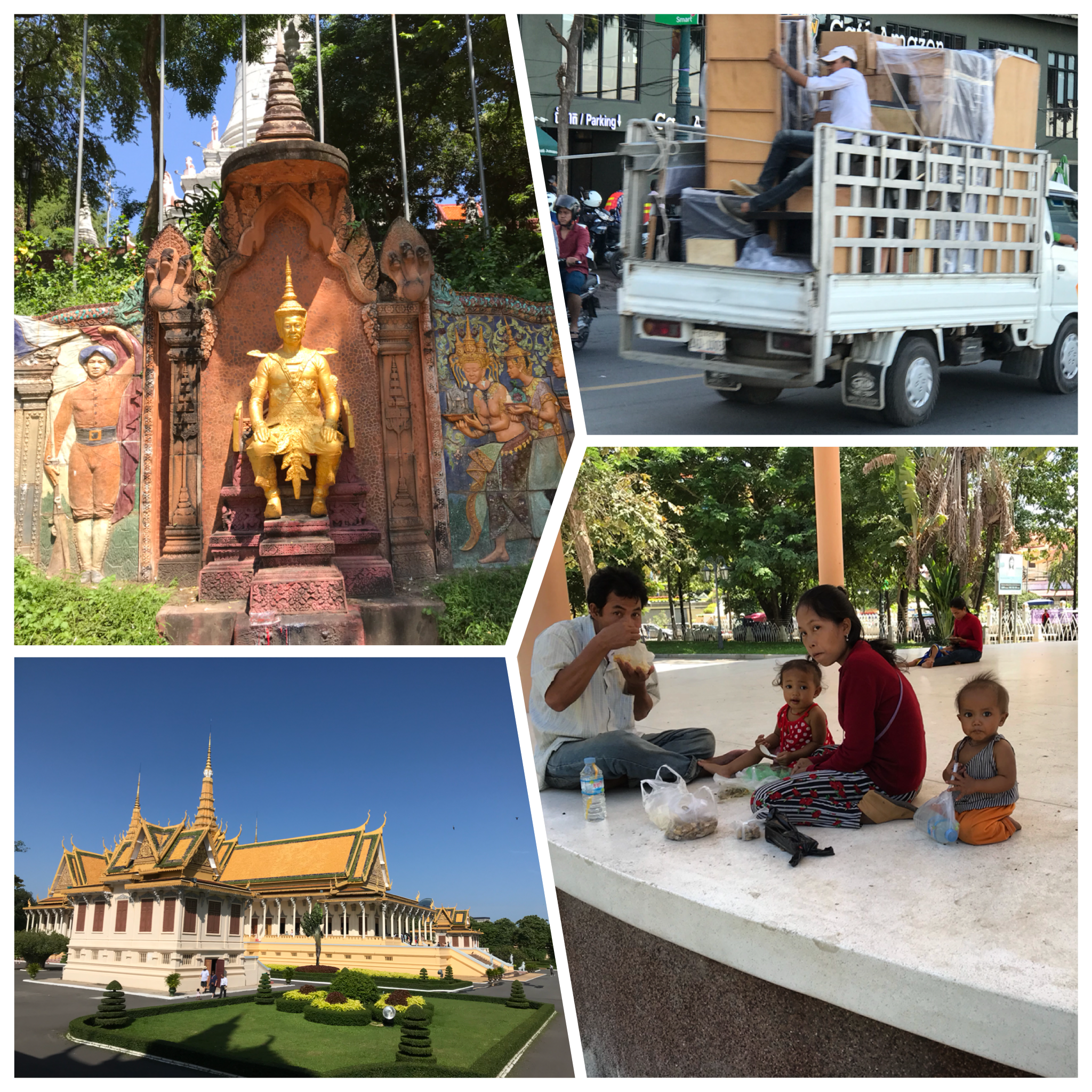Op koninklijk bezoek. We gaan naar het Koninklijk paleis, wat om de hoek bij ons ligt. Het is pracht en praal. De huidige koning, 64 jaar, singel en heeft een dansopleiding gedaan, woont hier. Hij is gekozen door een commissie nadat zijn vader in 2012 was overleden. Het is dus niet zo dat bij wet vaststaat wie de opvolger is. Het is een complex met meerdere gebouwen. Je ziet hier de Khmer architectuur in zijn puurste vorm. Toevallig komen we hier Britten tegen die in hetzelfde hotel in Battambang sliepen en die we tegenkwamen bij het maken van de vispasta. Zij waren op de fiets, stapten of, roken de geur en stapten gelijk weer op ;). Het is een mooi paleis met veel pracht en praal. Je mag binnen niet fotograferen. Dan lopen we naar de zilveren pagode. Zilver omdat de vloer van zilver is. Ook die mogen we niet fotograferen. Hier staat tevens een beeld van goud. En heel veel giften van gelovigen. Genoeg te bekijken dus.