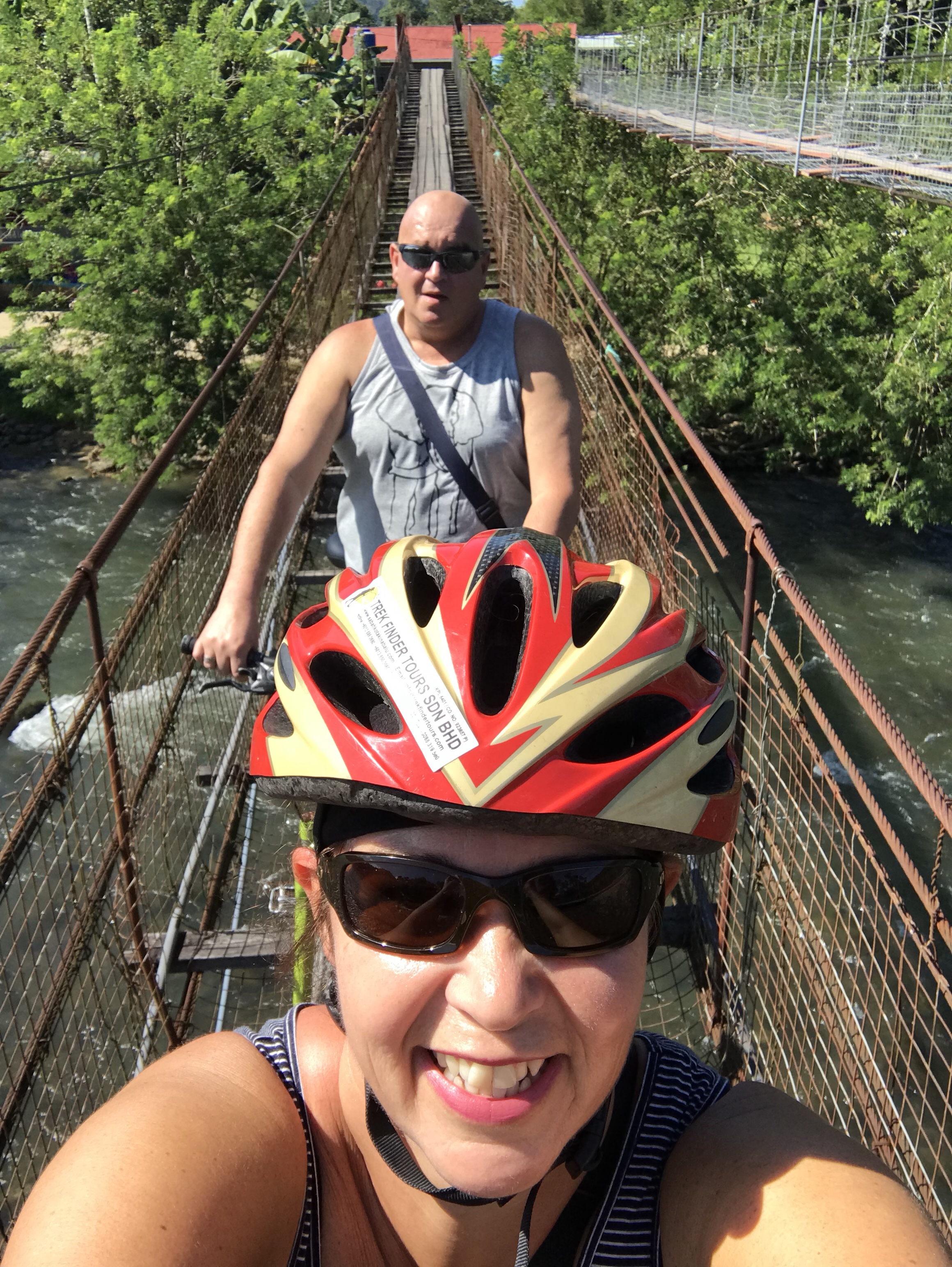 Om half 7 gaat de wekker. 8 uur worden we opgehaald. Omdat ontbijten de nodige tijd kost en we nu toch wel op tijd willen zijn, de wekker maar wat vroeger gezet. Mountainbiken gaan we. M heeft er veel zin in! R Ziet de bui al hangen zonder zijn electrieke motortje….. Alles is ingepakt. Zonnebrand, muggenspul, camera, selfistick (jaja het is zover … wij hebben er ook 1) doekjes voor het zweet enz. 1,5 uur rijden om aan de Kiulu rivier te starten met de tocht. We moesten gisteren ons gewicht 😦 en lengte 🙂 doorgeven. Het ene is wat hoger uitgevallen het andere wat lager :-))))))))))). Zodat een goede fiets kon worden aangemeten. Volgens mij hadden ze de boel omgedraaid, met als gevolg een kinderfiets met een grote helm. Gelukkig kennen ze me hier niet! Afijn na wat heen en weer gefiets om zo de fiets en versnellingen te leren kennen gaan we op pad. R roept bij de eerst hangbrug dat ie weer terug wil. Hij doet het voor M. Maar t zal zn hobby niet worden. Nu moet je ook geen hoogtevrees hebben en is die hangbrug ook niet echt A-kwaliteit dus blik op oneindig en lopen over de brug. Die dus heen en weer slingert. Kolkend water onder je (nou kabbelend water) en zo’n 200 meter lang. Kortom een heus avontuur.
