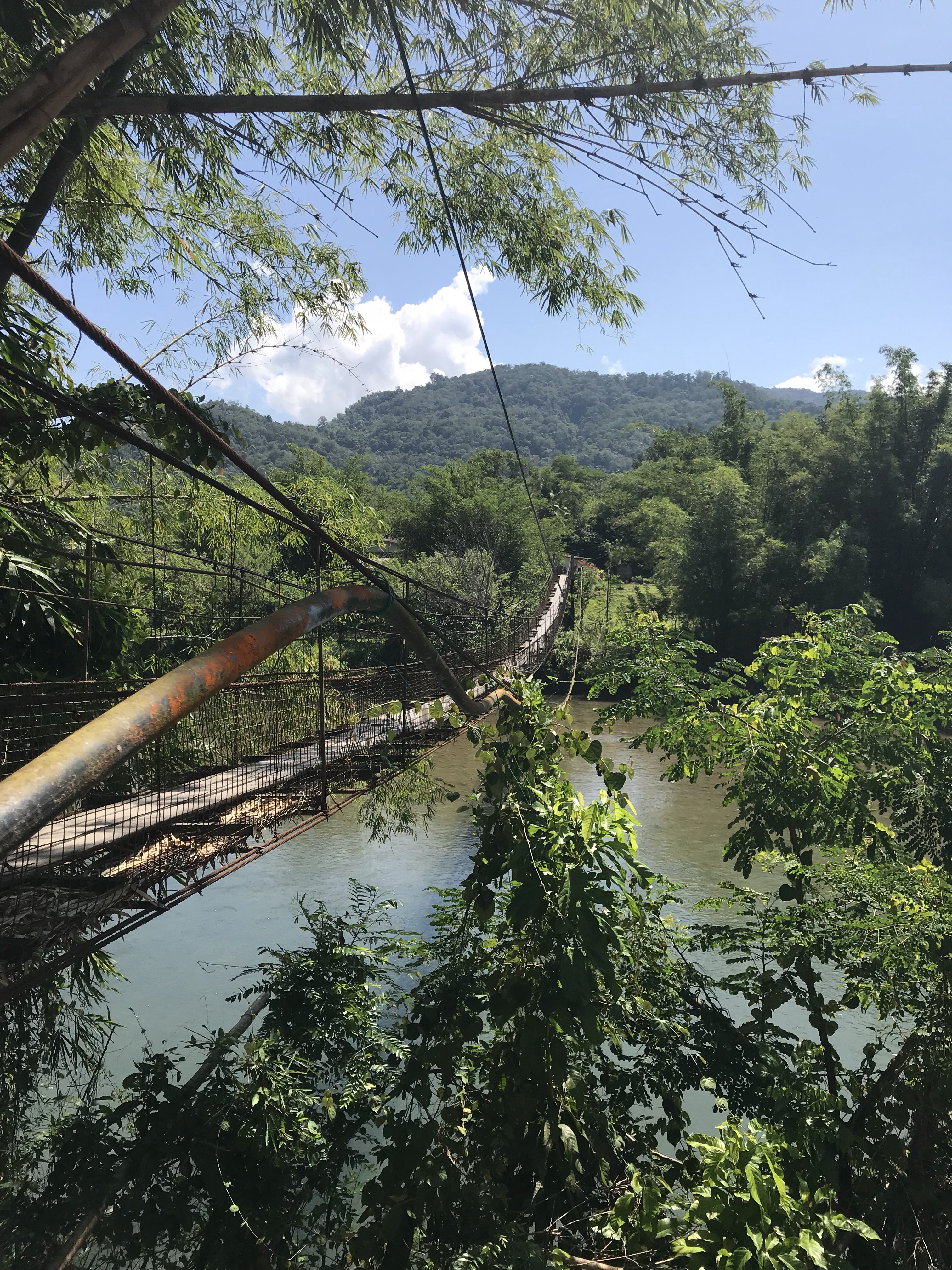 Dan fietsen we langs ananassen, durians, jackfruits, palmbomen. Echt prachtig. Bij een hutje wordt ons getoond hoe op authentieke wijze rijst wordt ontdaan van het vliesje. Met stof in ons binnenste gaan we weer verder. De luchtvochtigheid is hier 87%. Dus inmiddels is ons hemdje en broek doorweekt. Zit de helm achterste voren van het zweet maar we fietsen vrolijk verder. Brug nummer 2 is nog smaller. R gooit de fiets bijna overboord maar kan zich beheersen. Via een stukje weg (links rijden) duiken we weer het landschap in. Inmiddels zijn we overigens opgevroten door de muggen. Maar het is nog steeds leuk. Na de derde brug (weer iets breder) belanden we bij een vrolijke familie waar we even bij kunnen tanken nadat we uitleg hebben gehad over de rubberplantage en het verzamelen van het rubber. De familie woont met de katten Macau en Macai en hun waterbuffel genaamd Lap en een schurftige hond ver van de gewone weg. Superaardige mensen. We raken gezellig aan de praat en met handen en voeten en wat Indonesische woorden komen we een heel eind. Leuk! Dan nog even het laatste stukje. Bumpie, bumpie over een rotsachtige weg klauteren we naar de vierde brug. En stoer als we zijn, gaan we daar gewoon op fietsen (helaas zijn er geen beelden van). Dan nog 3 km over de weg en we zijn op de lunchplek. Ook idyllisch gelegen aan de Kiulu rivier. Het was echt supergaaf. ‘S middags is R nog mishandeld door een hardhandige masseur. En helaas konden we door een stortbui helaas niet bij ons heerlijke eettent van gisteren komen en werd het Indiaas (34 MYR = 7,10 Euro).