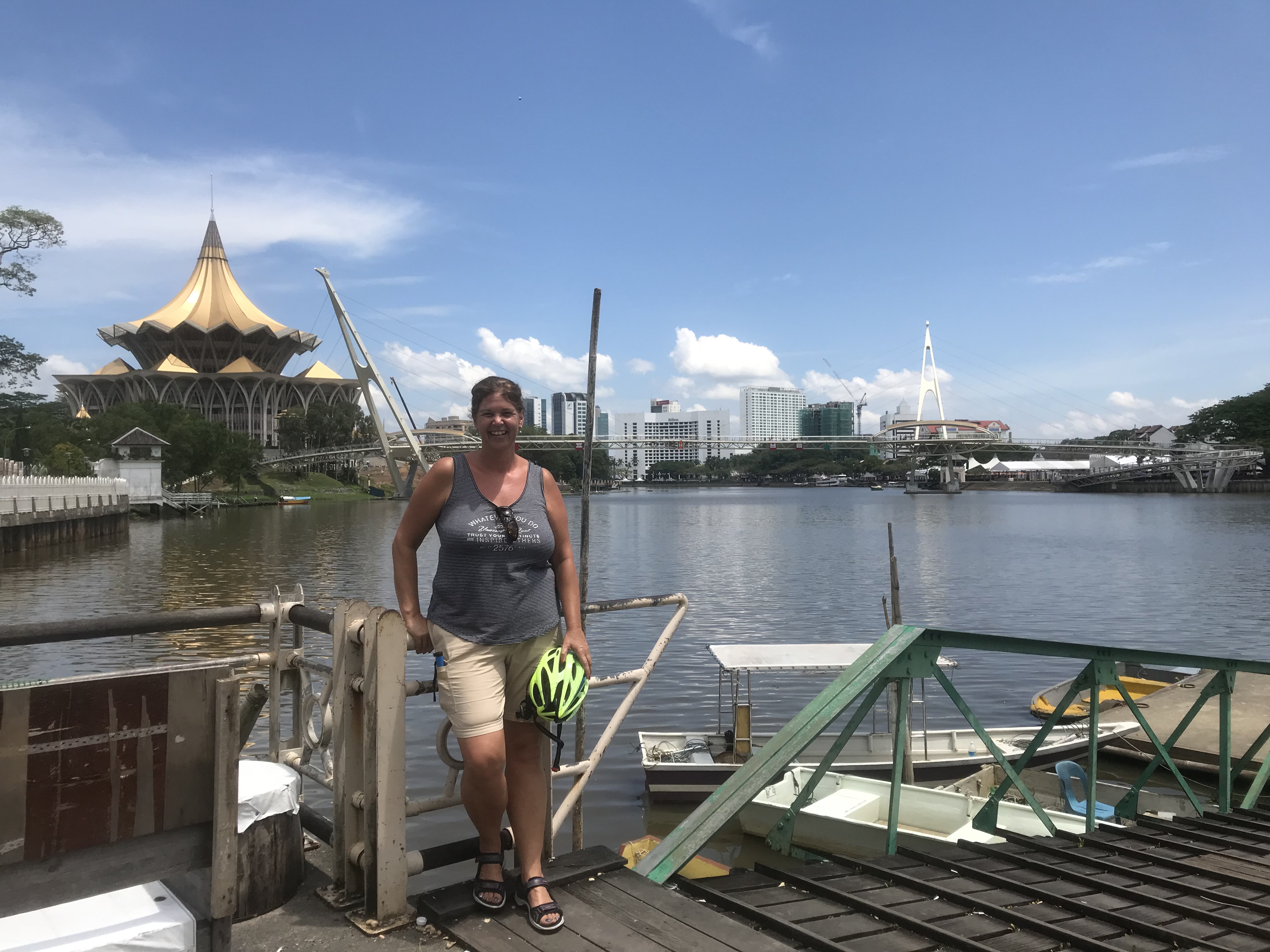 Fietsen en wandelen door Kuching en haar omgeving. En wat nog mooier is, de ZON schijnt. Heet is het gewoon. We komen aan Wayang Tours nr 1. M loopt naar de balie een vriendelijke jongedame vraagt welke tour we willen boeken. Nou zegt M, we hebben al geboekt. Die boeking stond niet in de boeken. Maar niet getreurd ze pakte haar boeltje bij elkaar en we gaan gelijk op pad. We starten vanuit het boekingskantoor. Onderweg proeven we van alles. We hadden echt niet te hoeven ontbijten pfff en dan moeten we ook nog op de fiets. We lopen een uurtje door de stad. Door de Chinese wijk, drinken Chinese thee, eten bi-pan, een puf, noodles, een soort spekkoek, een soort cracker, een drankje waar je tanden aan elkaar blijven plakken zo zoet is het, laksa (de Maleisische maaltijd die je moet proberen en die overigens lekker is) enz enz. We lopen door India Street, we fietsen langs de moskee, parlementsgebouwen, waterfront, gaan naar de markt. Steken de rivier over met een bootje. Kortom een superleuke ochtend.