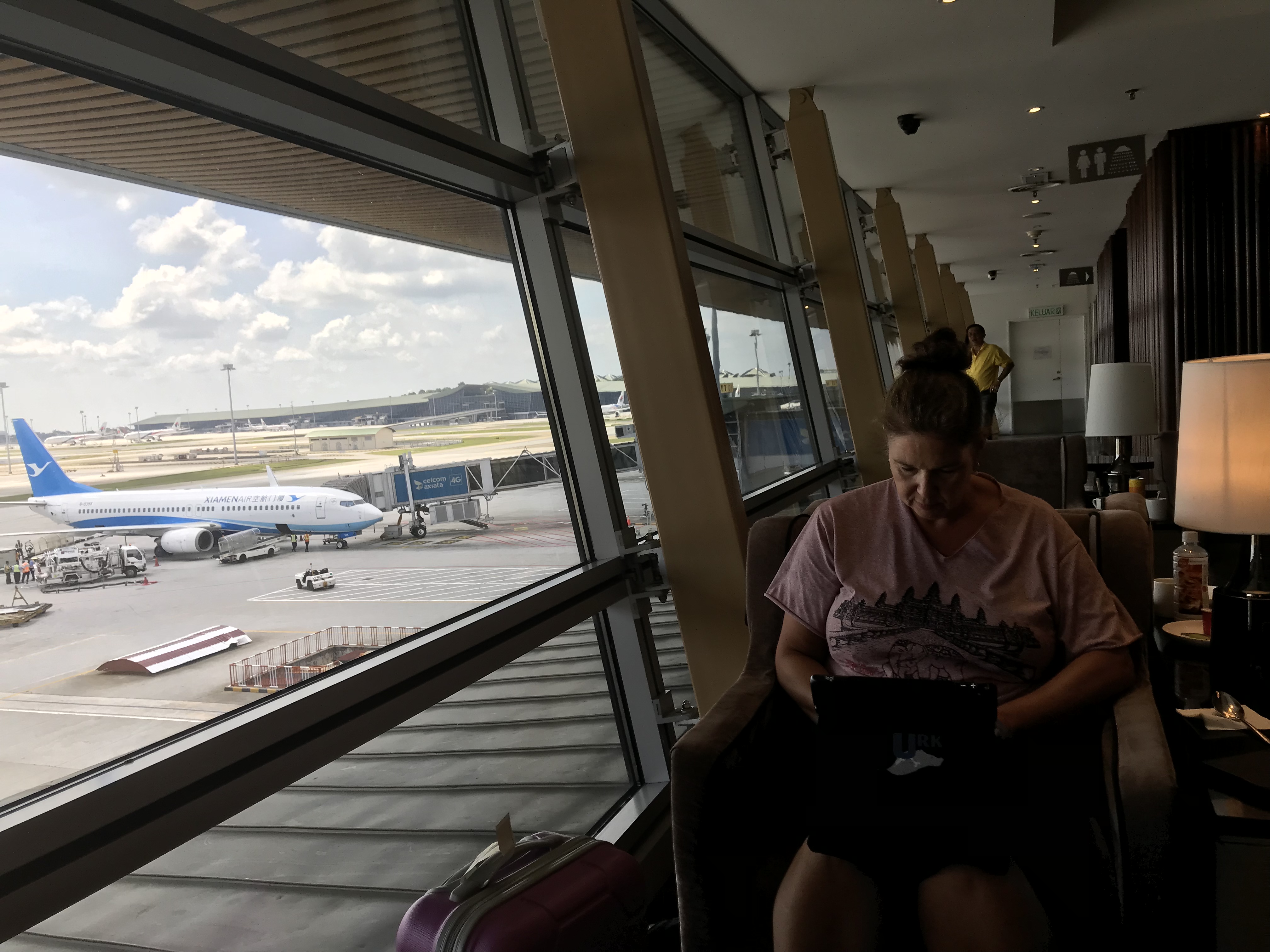 04:20 uur gaat de wekker. We springen gelijk uit bed. We worden immers om 5 uur opgehaald. Even voor vijven worden we gebeld op de kamer. Een onverstaanbaar gebrabbel aan de andere kant. We’re coming roept M. De chauffeur staat al gereed on de koffers te sjouwen. Helemaal verbolgen is ie als R ook een meeneemt. Hele verhalen heeft ie. Op t vliegveld roept hij al bij voorbaat dat hij het karretje gaat duwen. En dat doet hij. Maar hij rent gewoon over het vliegveld heen. Heeeeel raar vonden wij dat… Wij rennen hier maar achteraan. Als ik er niet bij was geweest had ik het niet geloofd. Nadat we het hele vliegveld zijn over gerend worden de koffers door de X-ray gestopt en dan stopt de chauffeur ook. Hij vliegt R om de hals, die verschrikt maar meedoet. M krijgt galant een handkus en dan staan we daar…., wat een malloot…We zijn al ingecheckt dus alleen de bagage afgeven. Een jong ding neemt onze koffers aan en zegt gelijk dat ze veel te zwaar zijn. Er begint er een heel hard te stuiteren. We zijn inmiddels een stuk of zes vluchten verder en het gaat altijd goed. Ze gaat even overleggen met de senior. Het is goed. Dus ze vult de boel verder in. Vandaag staan er vier vluchten op het programma allemaal met Malaysia Airlines. We vliegen eerst naar Bintulu en dan direct door naar KK. Volgens de grondstewardess moeten we in KK de koffers ophalen om vervolgens in te checken voor de vlucht naar KL en Bangkok. R zegt dat dit niet klopt, ze kijkt hem verbaasd aan. Ze gaat het maar even checken bij het hoofd. R loopt er achter aan. Nee, ze had het mis, het kan toch doorgelabeld worden. Ontslag dreigt, hihi, grapje. We lopen naar gate R. We moeten nog even wachten maar dan gaan we boarden. We mogen naar een verdieping lager lopen. We zien het vliegtuig al staan. We staan met zn allen netjes in de rij. En wachten, en wachten, en wachten, en wachten. Dan komt er een mededeling. De wc doet het niet. En de piloot vertrekt niet met een defecte toilet. Over een uurtje gaan we vertrekken. Dan eerst maar ontbijten want dat hebben we nog niet gedaan, maar dat is zo goor dat gooien we direct weg. Lang verhaal kort. De hele vlucht gaat niet door. Maar dat horen we rond half 9, toen zouden we dus oorspronkelijk al bijna in KK geweest zijn. We worden omgeboekt naar een rechtstreekse vlucht van Kuching naar KL. We hadden gehoord dat die overvol zijn. Als haringen in een ton zaten we helemaal achterin het vliegtuig. We konden geen kant op. Op de toilet zit je nog ruimer, die overigens achter ons zat met als gevolg dat R bont en blauw is van alle poepende en plassende gasten die bijzonder onbeleefd door het gangpad heen stappen. Gelukkig overstemt het geluid van het vliegtuig alle geluiden die uit de wc komen. Na anderhalf uur vouwen we ons uit het vliegtuig. Nu komen we bij in de lounge. Straks nog een vlucht van 1,5 uur naar Bangkok.