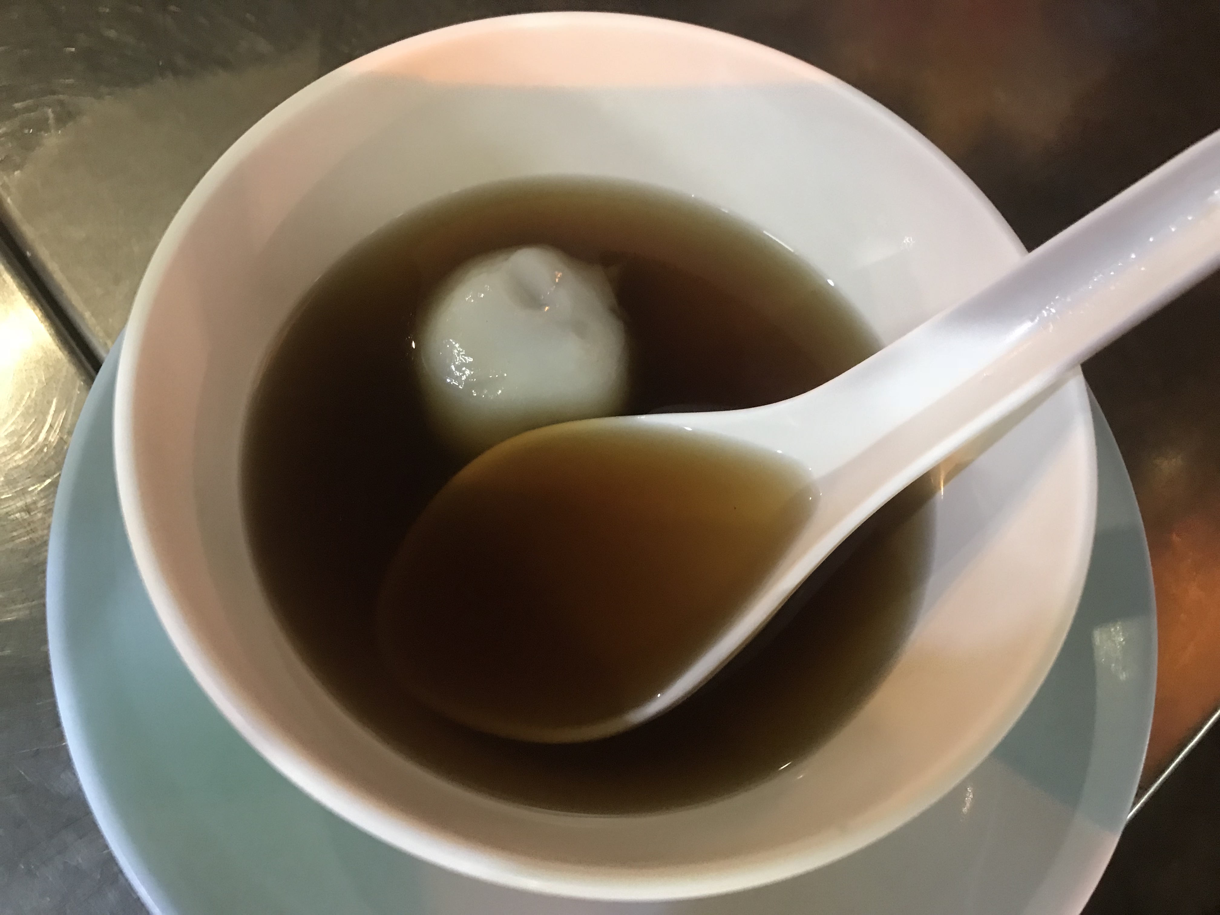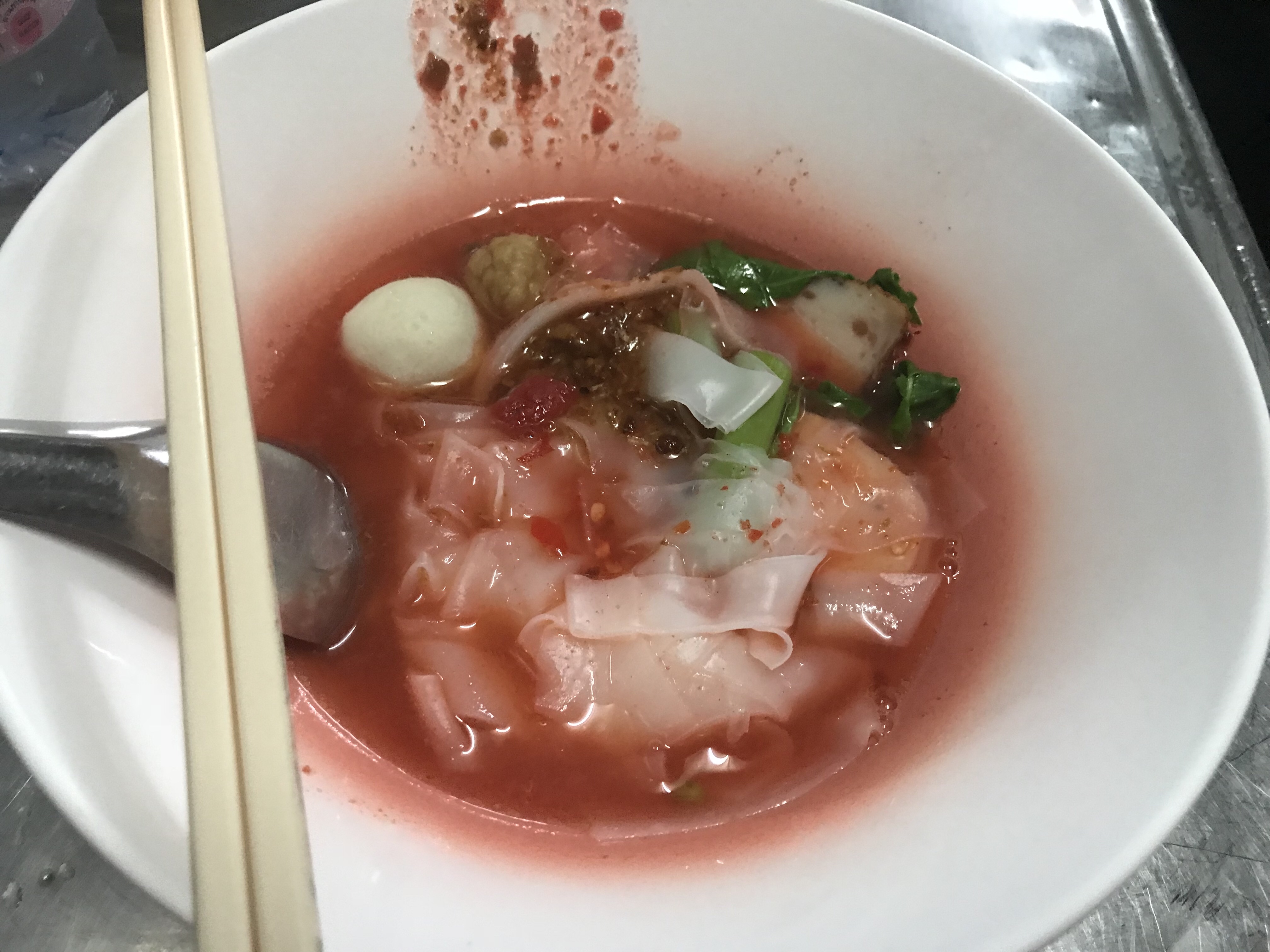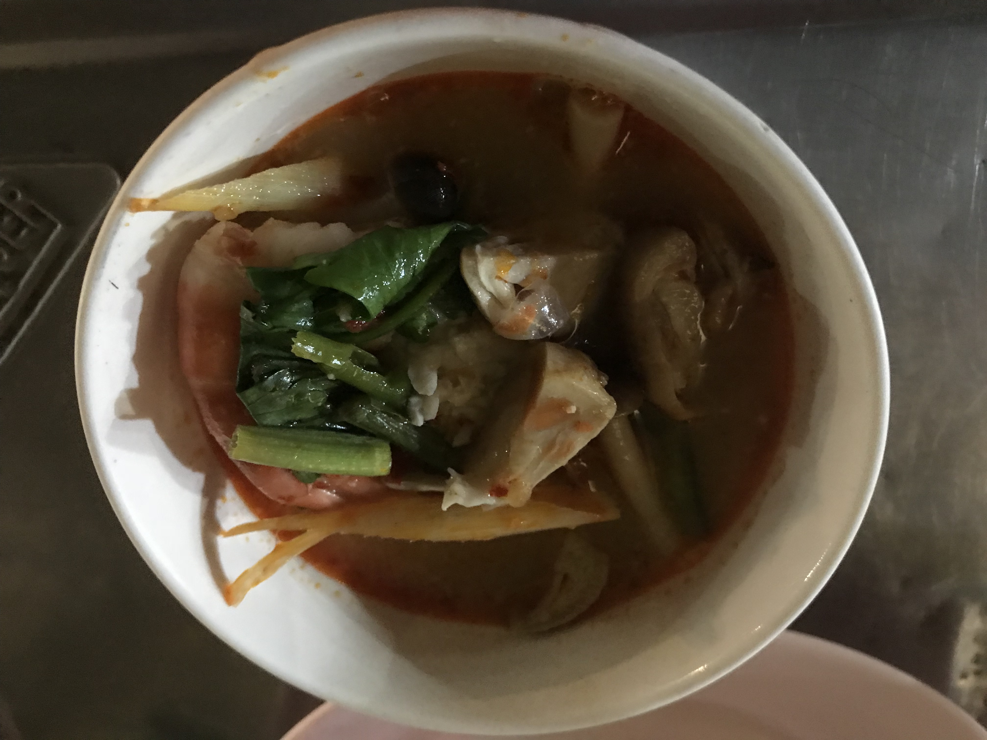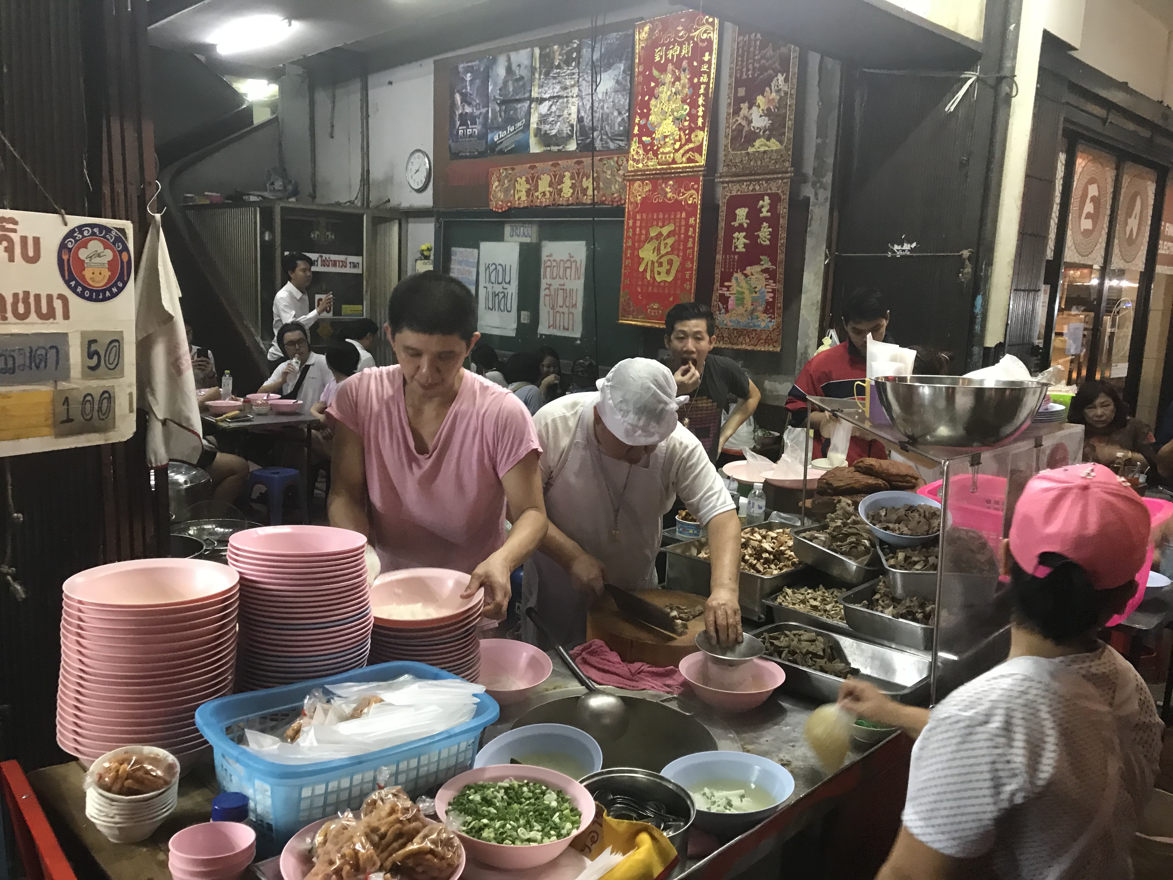 ‘S avonds hebben we een avondexcursie in Chinatown. Om 18.00 uur moeten we bij uitgang 4 van het MRT ondergrondse station Hua Lamphong zijn. Onze gids Lily staat daar ons al op te wachten. Het regent bah. We komen eerst langs een tempel. Dan lopen we verder de levendige, 250 jaar oude wijk in en zijn al gauw bij onze eerste stop: een authentiek eettentje. De komende uren lopen we door een wirwar van straatjes, zien vele winkels en mysterieuze kruiden en ruiken exotische geuren die ons tegemoet komen. We stoppen bij 7 verschillende, bijzondere eetgelegenheden om hun lekkernijen te proeven. Kleine hapjes, soms erg jammer want het smaakt naar meer maar soms ook prima dan is het niet te hachelen. M heeft een thee gedronken wat erg goed schijnt te zijn maar ze ging finaal over haar nek! We hebben Thai Rung Ruang Noodle (rode noodle) toen naar Canton House, heerlijk! Daar een balletje garnaal met tofu er om heen en wat groente.