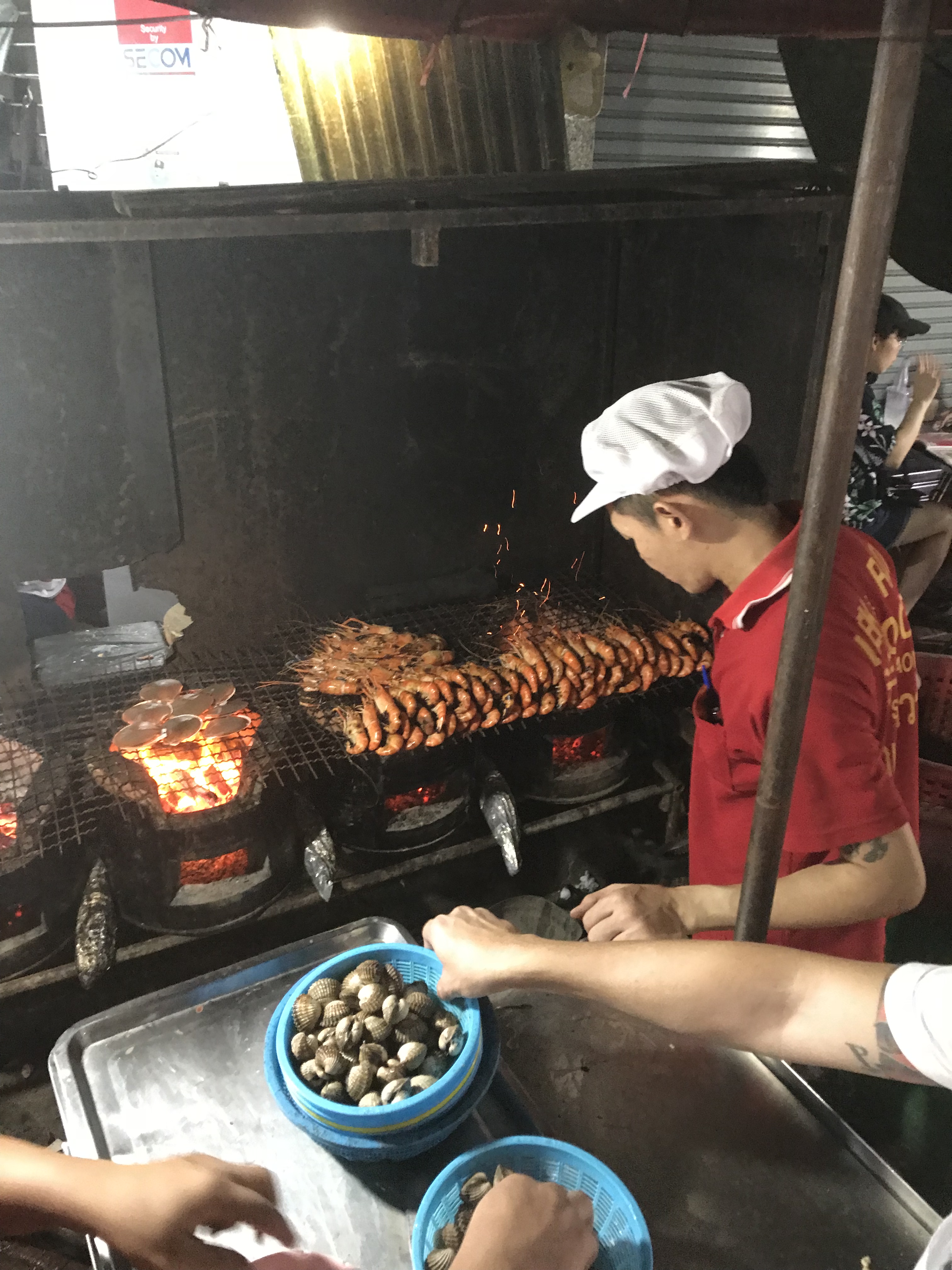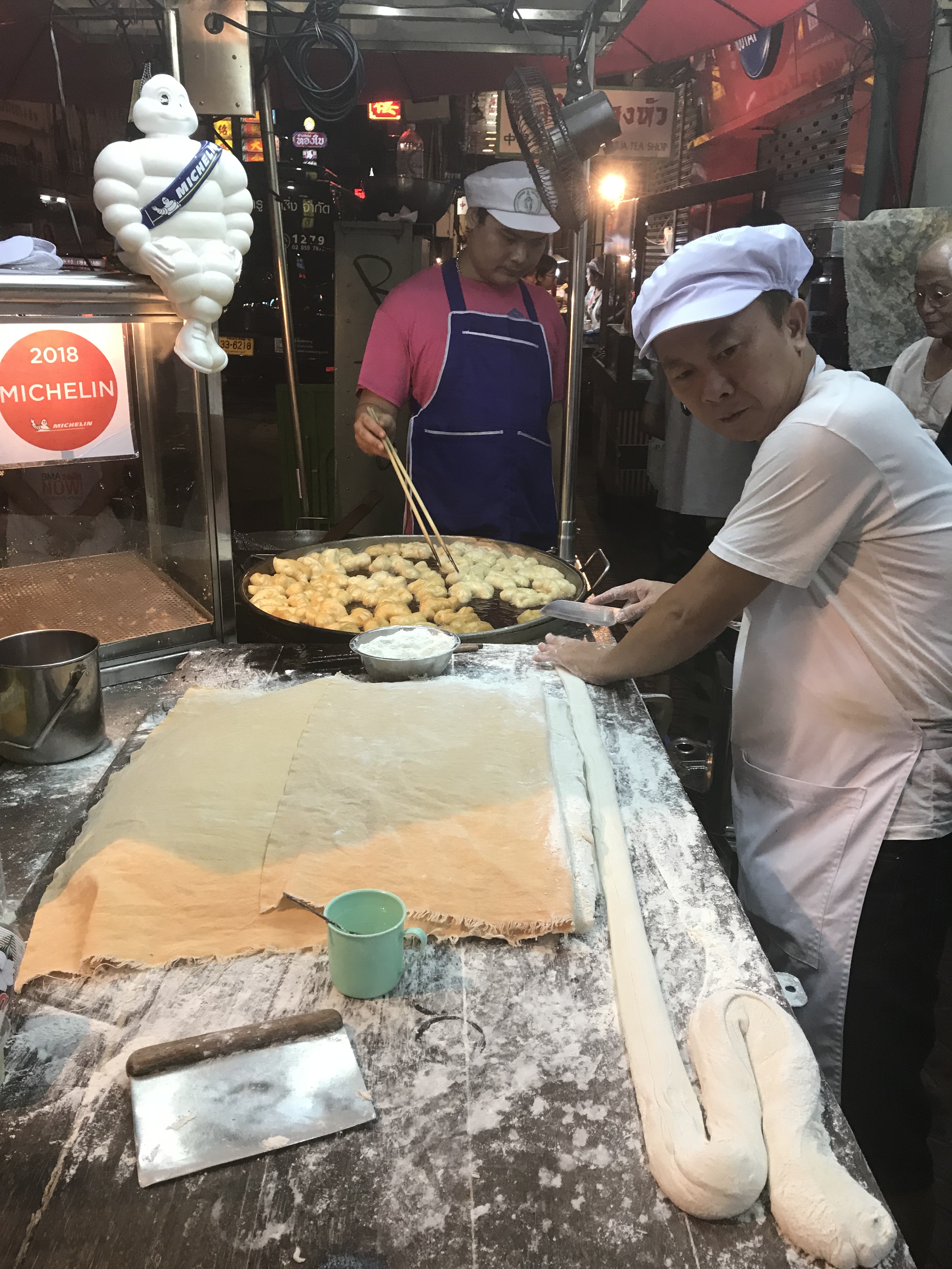 Toen die vreselijke thee. Daarna L&R Seafood (grote garnaal en iets met krab) Inmiddels kwamen we langs een stalletje die een soort oliebol maakt (michelinster!) dit was heeeerlijk. Er zat een veel te zoet dipje bij van groene (pandan) suikerachtig iets. Guey Jan Nai Auna (crispy varkersbuik in pepersoep. Ook een michelinster en erg lekker. Als laatste Tipparot ICE Cream, sticky Rice met mango en die oliebollen. DIt hebben we allemaal naar het hotel meegenomen. Het was veel te veel. Al met al een avond met vele indrukken en met de buik vol gaan we terug naar het hotel. R zegt geen voeten meer over te hebben van deze wandeltocht……..