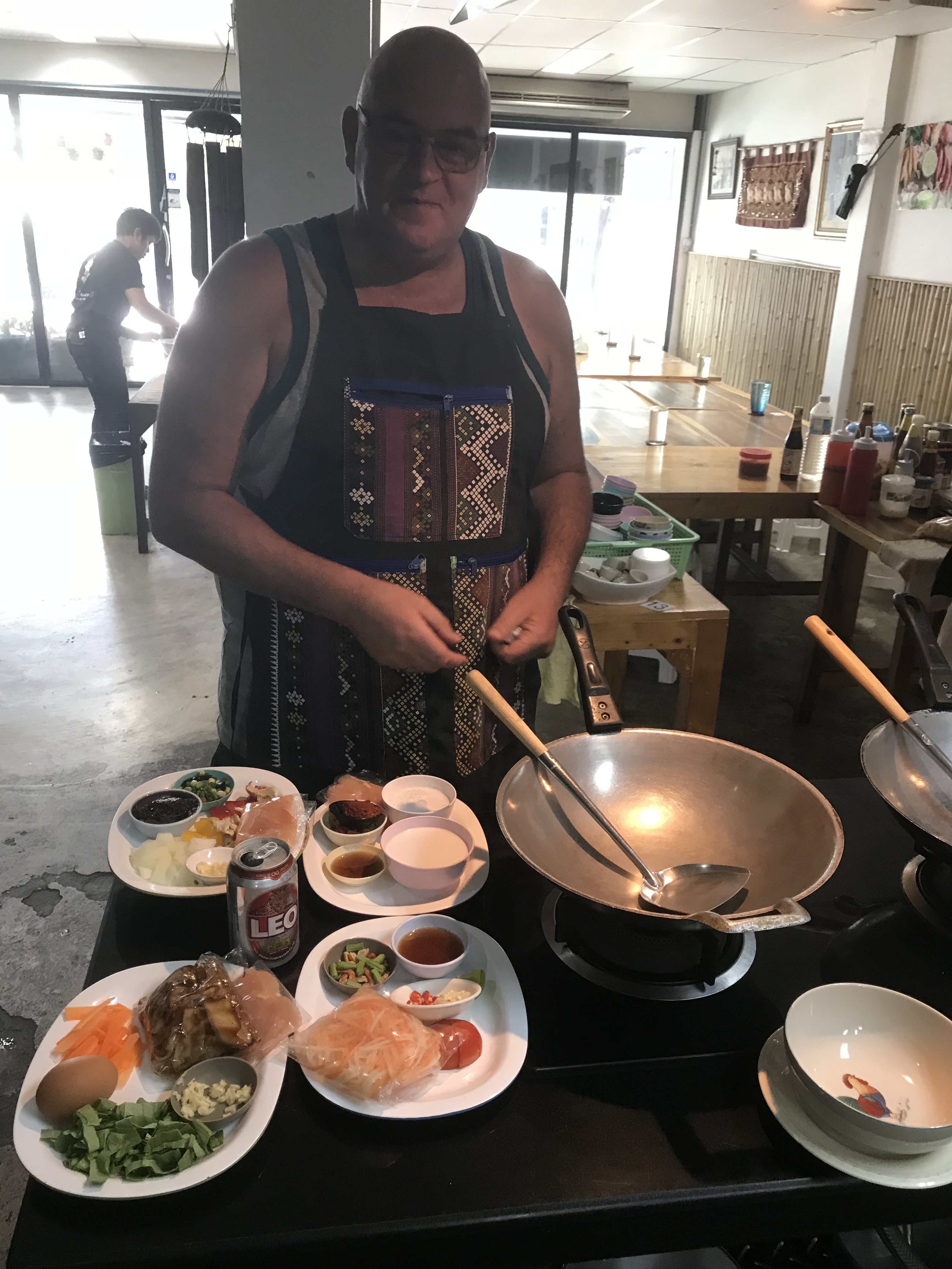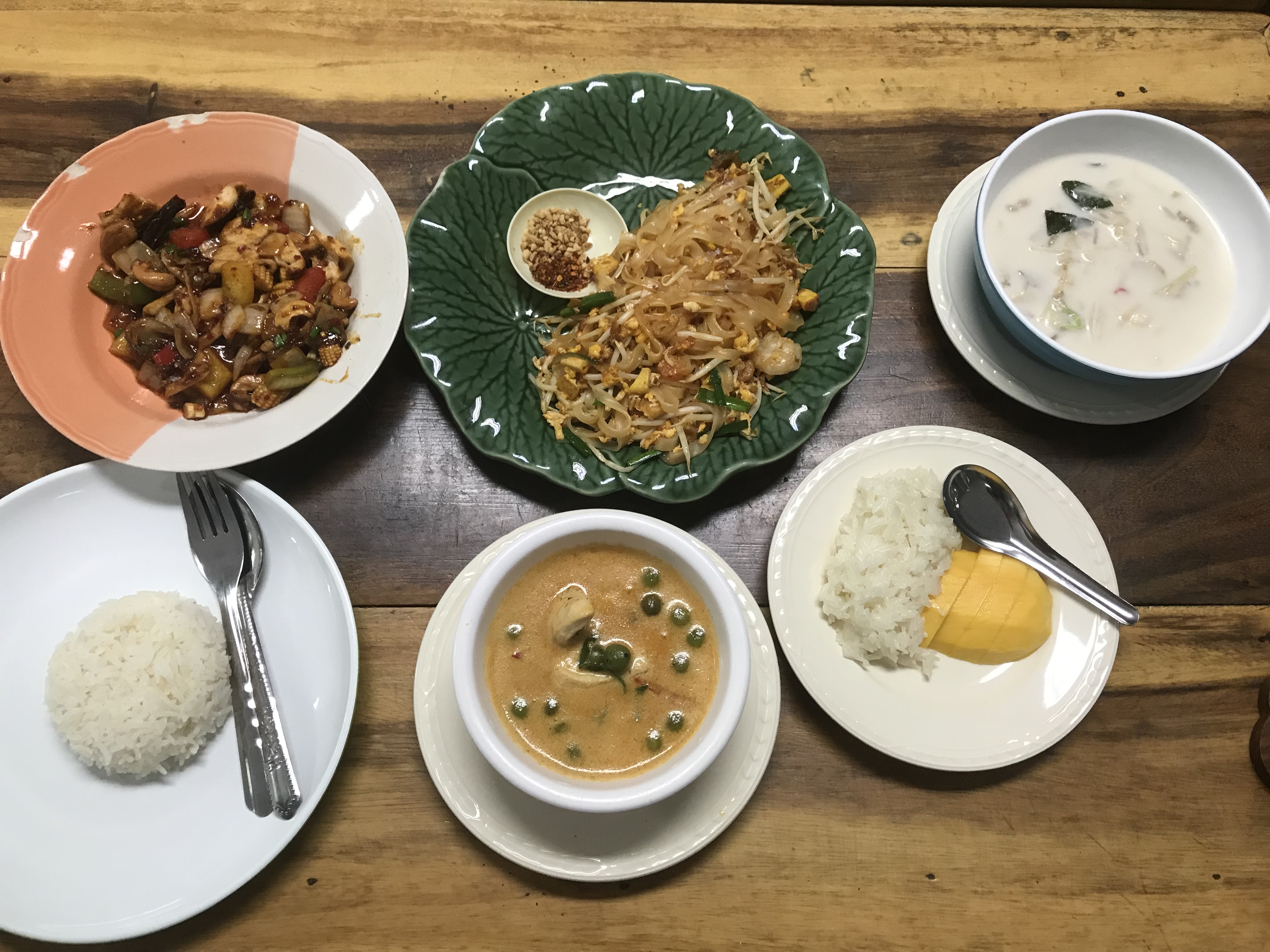 Het leek wel een soort quiz. Maar blijkbaar letten we steeds niet goed op. Want onze antwoorden waren niet goed! Omdat we dit al een aantal maanden geleden hadden gereserveerd hadden we geen idee meer wat we zouden maken. En dat was veel. Uiteindelijk vijf gerechten. Altijd weer onze Pad Thai, cashew chicken, een soepje, nog een soepje en sticky rice. R had gebakken banaan. Veel te veel allemaal. En we zijn nog steeds niet zover dat we dit thuis kunnen maken.