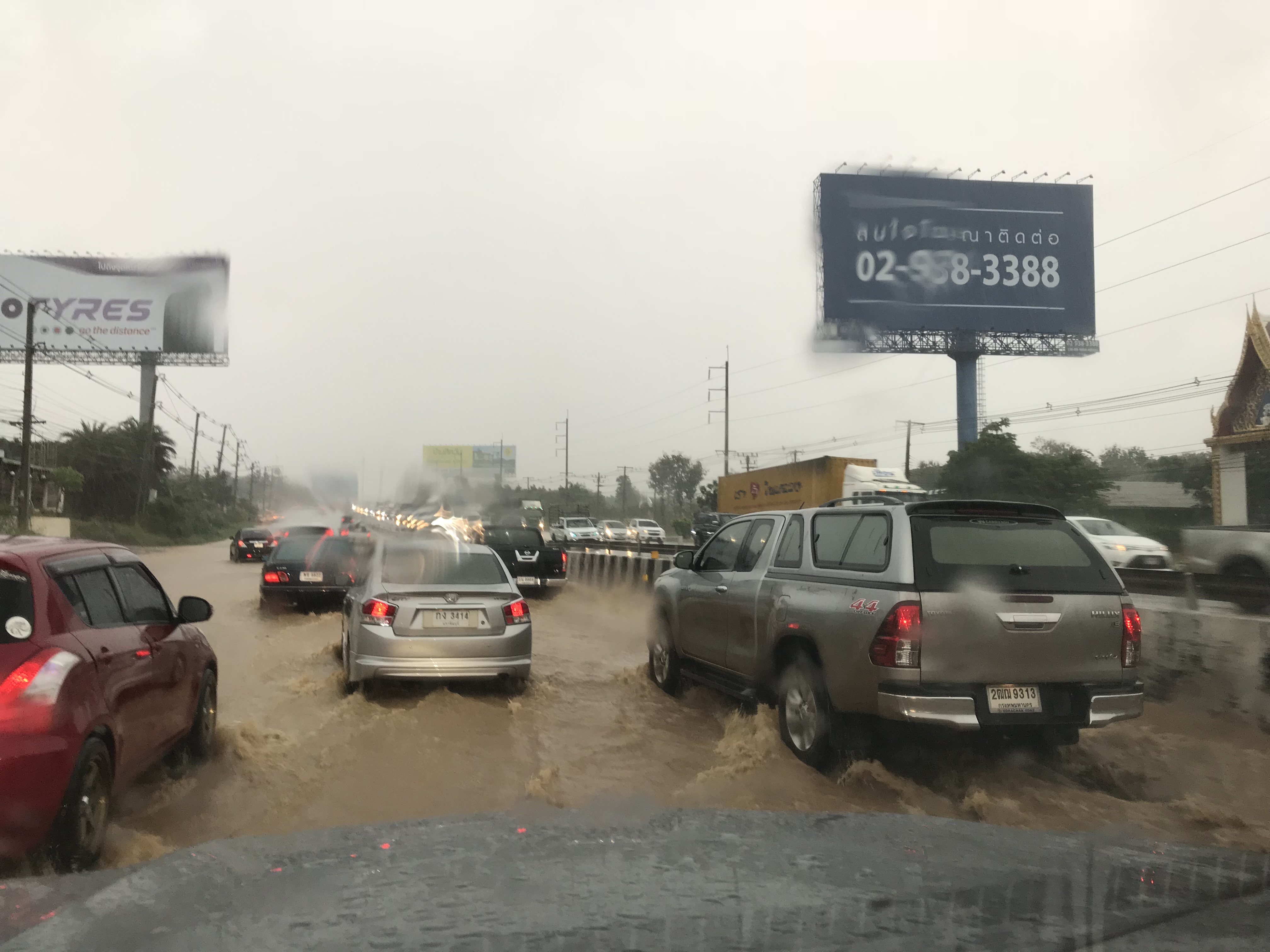 Eerst maar eens de auto leren kennen en de TomTom. De Thaise TomTom. Die van ellende aan elkaar hangt. Na een tijdje pielen met dat ding komen we er achter dat in het draad een breuk zit waardoor ie het niet doet. Na wat gehannes krijgen we hem toch aan de praat. En dus starten we rond 10 uur bij de tocht. Twee uur later reden we nog steeds door Bangkok. Het begin begon veelbelovend. Maar toen het apparaat maar bleef zeggen keer om keer om. En we deze weg toch zeker al 2x hadden gereden krijgen we toch wel flink de balen. We zetten de telefoon maar aan. We hebben nu een Thais nummer met internetdata dus via googlemaps worden we Bangkok uitgeloodst. We besluiten maar om direct naar Buriram te rijden. Dan begint het te regenen. Niet normaal meer. We zien geen hand voor de ogen. We rijden nog geen 20 en besluiten van de weg af te gaan. We wachten ongeveer een kwartiertje en besluiten om dan toch weer verder te gaan. We draaien de weg op en staan gelijk stil. Stapvoets rijden we verder. Op zich niet erg van het regent nog steeds. Na enkele km snappen we waren we in de file stonden. De weg staat blank of bruin.