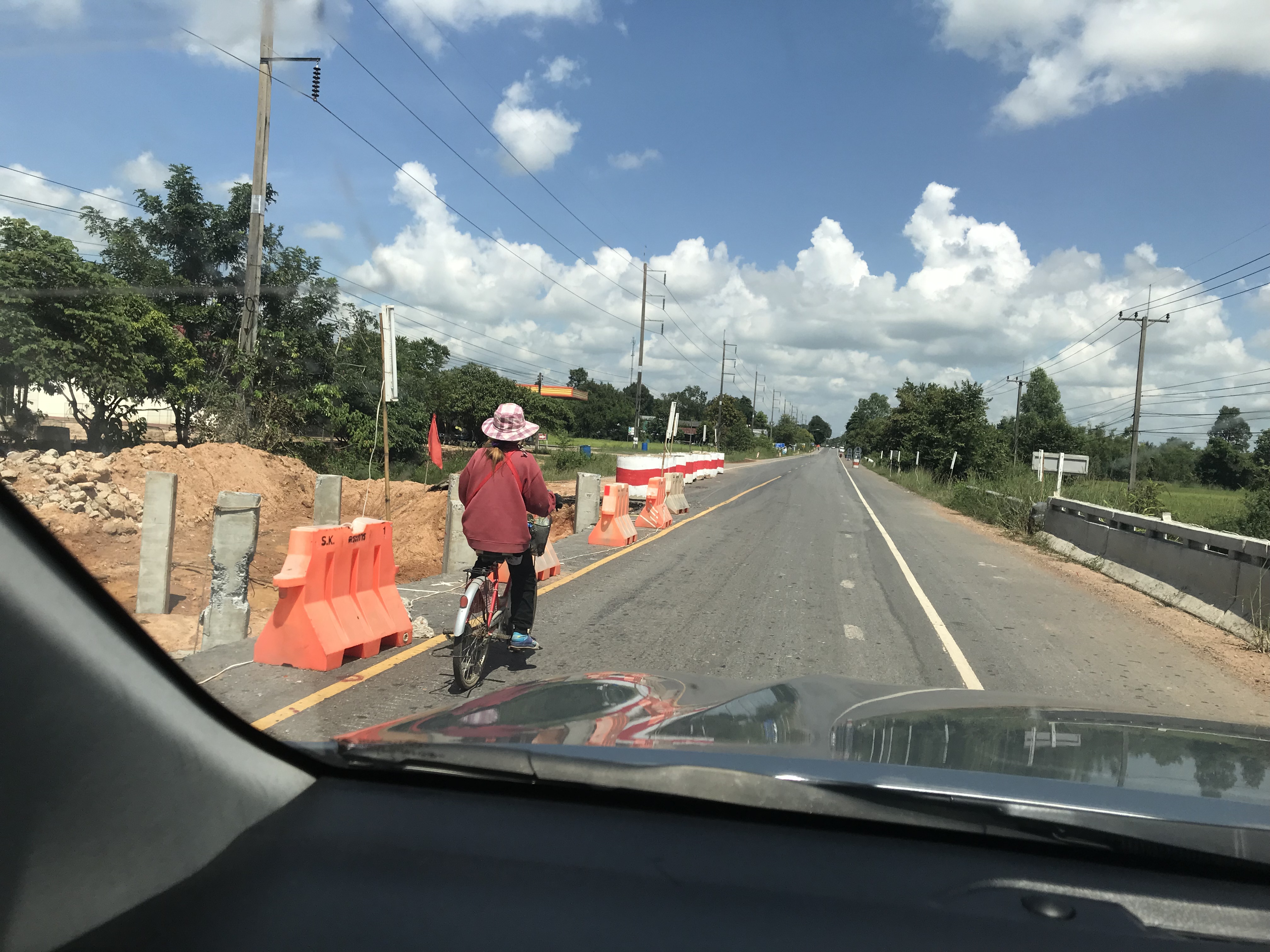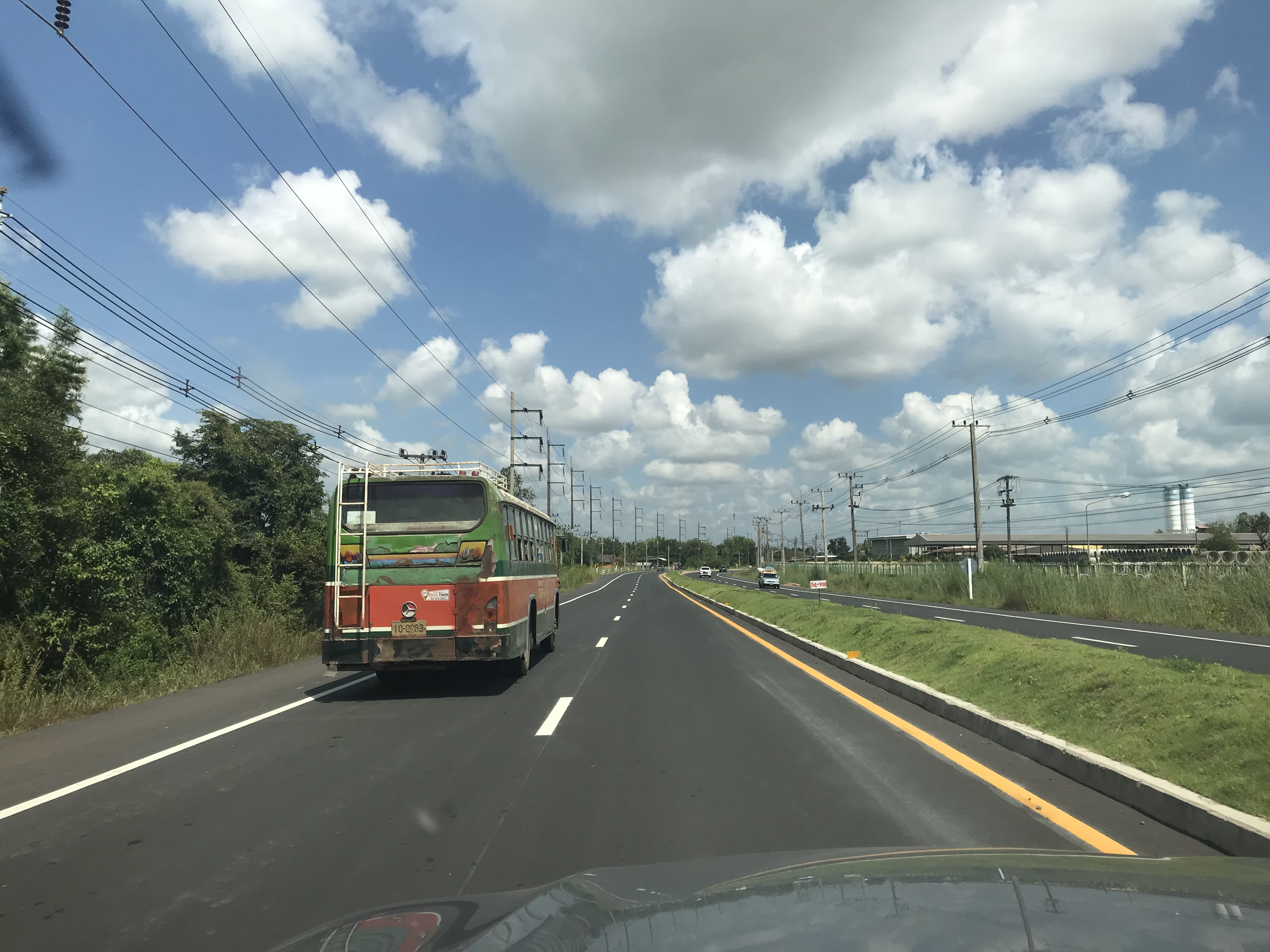 Het water is hier modderachtig en er staat een klein riviertje op de “snelweg”. Daarna kunnen we iets doorrijden. Het regent nog steeds dus wel met beleid. Dan gaat de zon schijnen, pff gelukkig want we moeten nog een uurtje of 2. Na een uur gaat het weer regenen. Uiteindelijk na een afmattende reis komen we rond 18.30 uur in Buriram aan. Het laatste stuk was in het donker. En dat is niet grappig. Sommigen hebben geen lichten aan.
