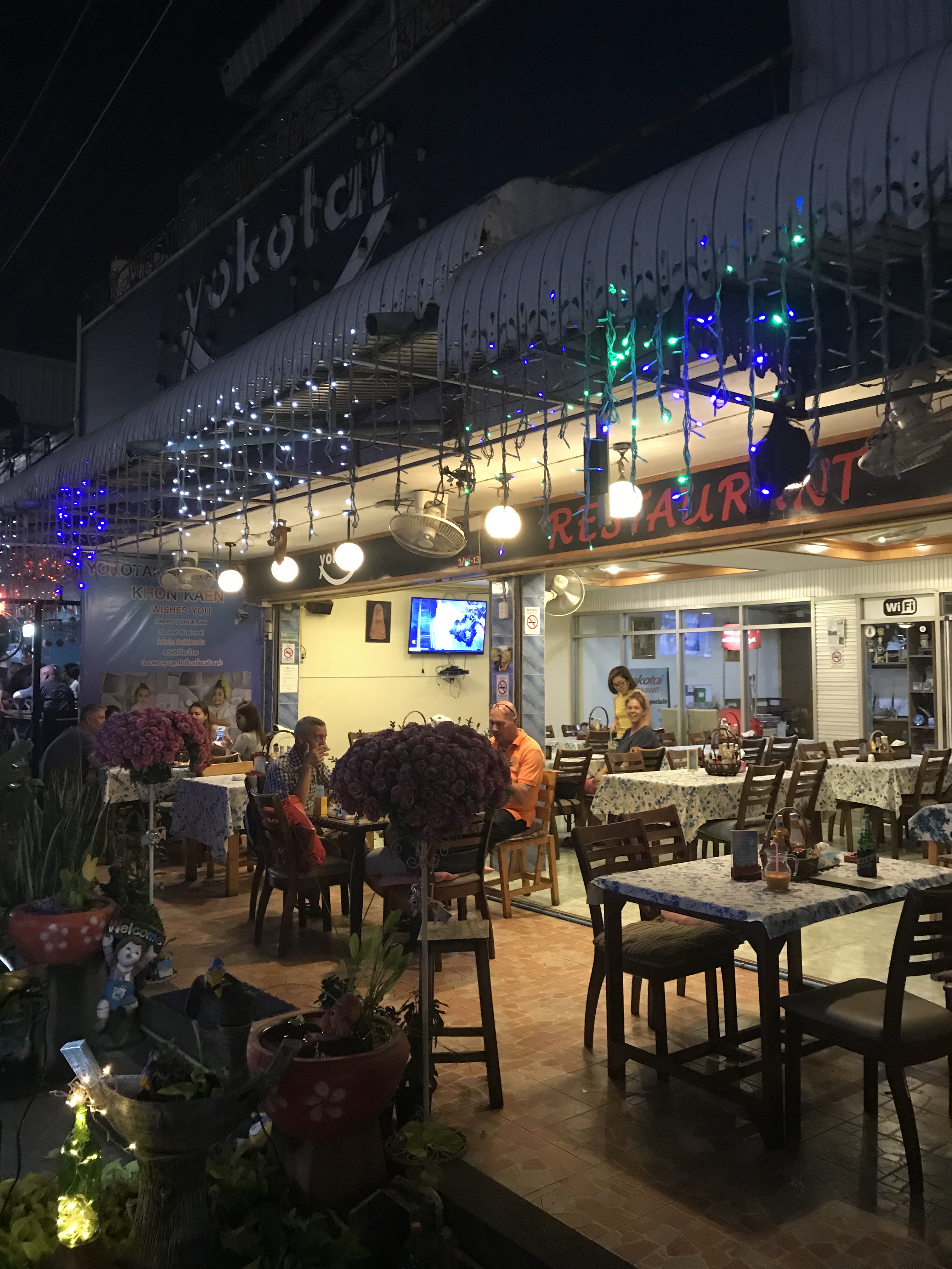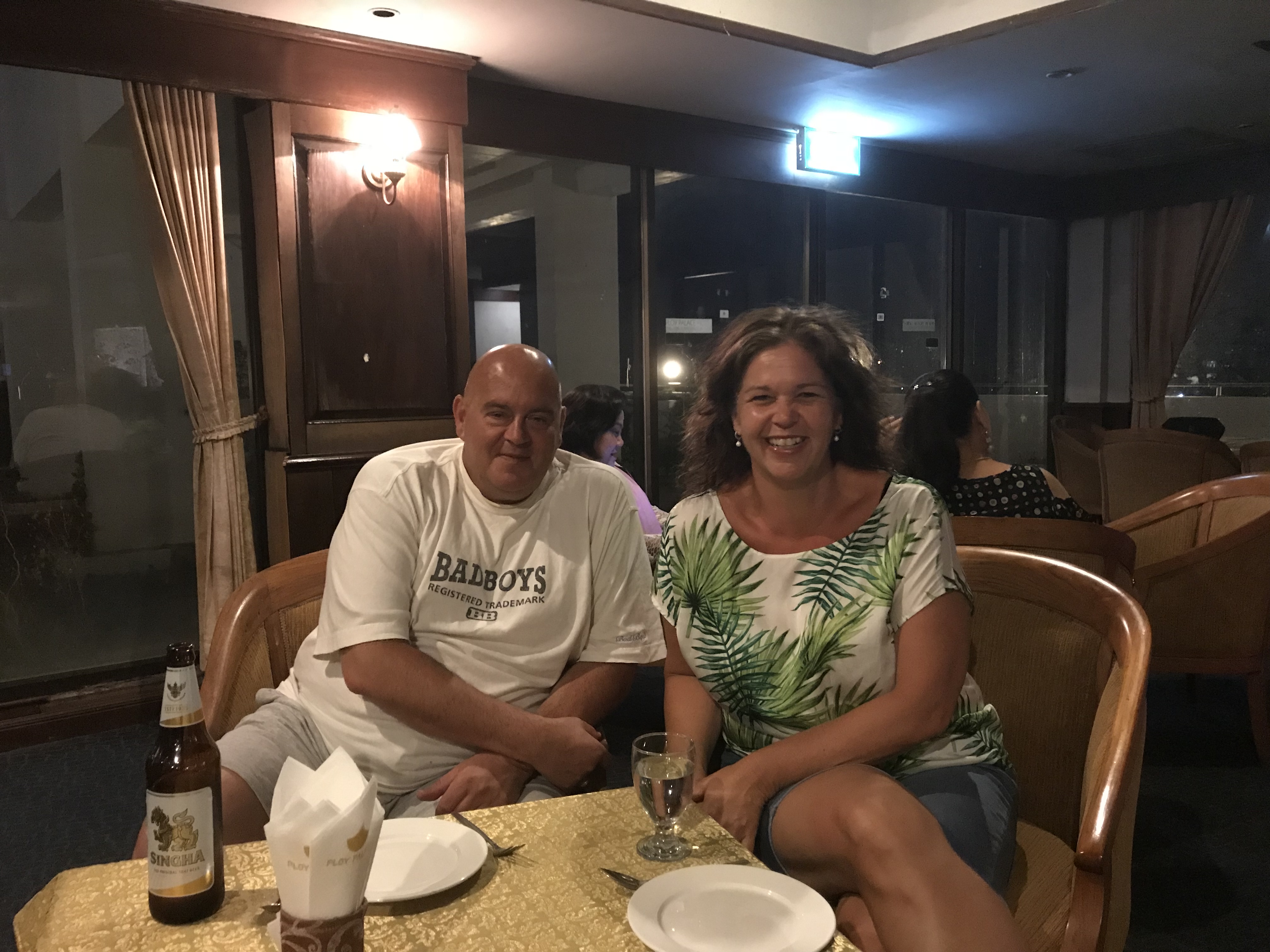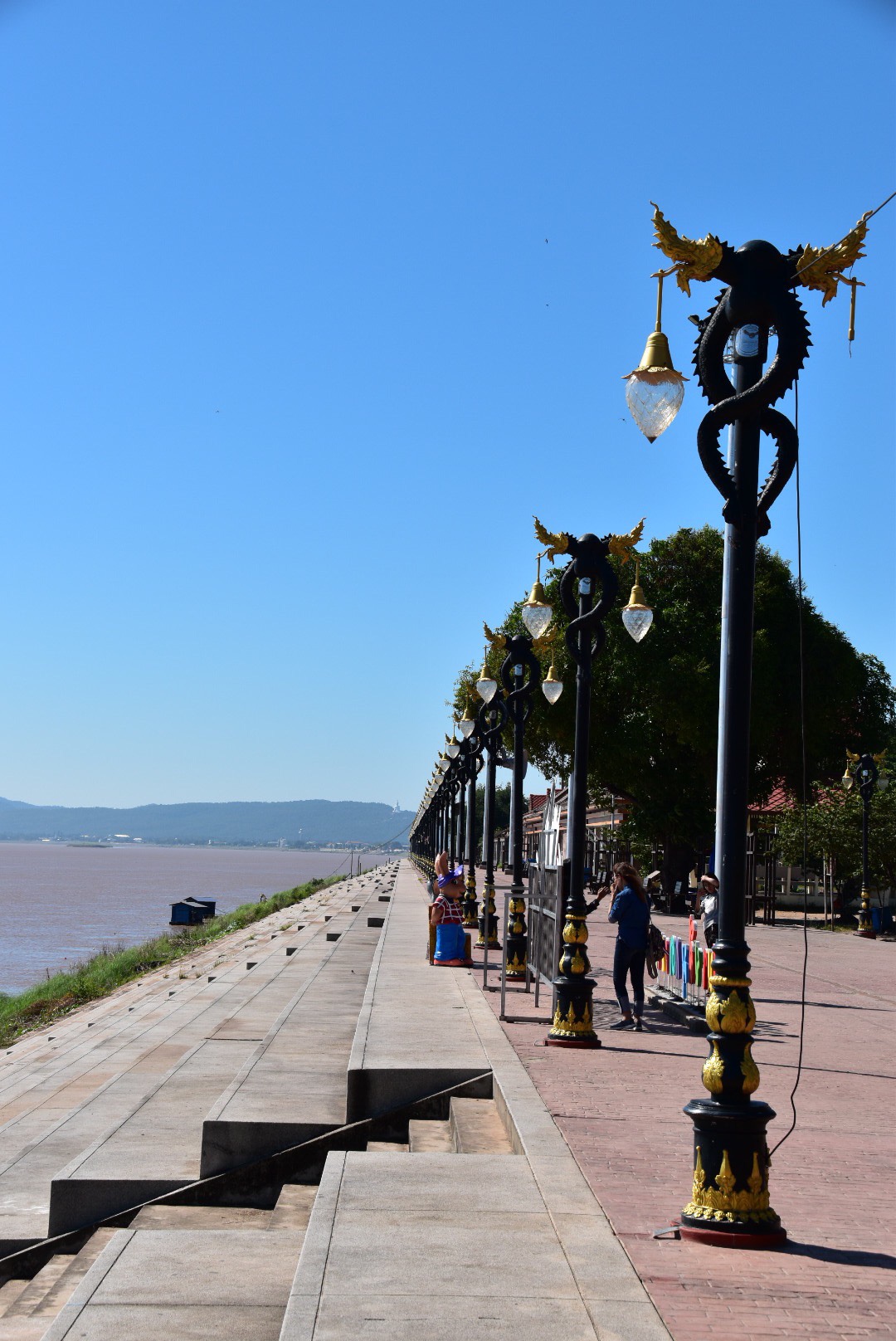 Hier staat de grootste gong van het land en het is omringd met allemaal boeddhistische tempels. Echt prachtig. We zijn de enige toerist maar er lopen allemaal Thai rond die komen bidden. Het is een heerlijke plek om rond te lopen en veel indrukken op te doen. Als laatste tussenstop hebben we nog een uitkijkpost bij de Mekong ingelast om daarna door te rijden naar Mukdahan. Bij aankomst in Mukdahan beklimmen (met de lift) we eerst de Ho Kaeo Mukdahan (uitkijktoren). Voordat we een kaartje hebben gekocht en snappen dat de schoenen uit moeten is er veel handen en voeten werk en vooraf gegaan. Over het algemeen spreken ze in de Isaan slecht Engels. Mooi uitzicht over de Mekong, de stad en een heel groot buddhabeeld: Big Buddha op de berg Manorom. Dan naar het hotel. Een heerlijke grote kamer in het Ploy Palace hotel. We gaan eerst zwemmen. Daar hebben we echt zin in. Je wordt toch plakkerig van dit weer. Een beetje afkoelen in het water. Het is een mooi zwembad, de bankjes zijn wat hard maar M ziet toch kans om weg te dommelen. Zo de plakkerigheid is er af, nu de knopen uit het lichaam laten halen. Dat heeft M geweten. Elke spier is onderhanden genomen. En niet al te zachtzinnig. Inmiddels had de masseuse ook nog ruzie met de airco. En in plaats van koelte werd het op een gegeven moment steeds warmer in de kamer. En M had het al zo warm door de stevige massage. De kreukels zijn er ook weer uit. Pfff we zijn er lui van geworden. We hebben niet zo’n zin om buiten de deur te eten en zo’n honger hebben we ook weer niet dus we besluiten om in het hotel te blijven. Eerst gaan we naar beneden. Een dame staat daar te zingen. Het is niet onze muziek en de zaal is ook heel ongezellig. We gaan naar de Sky bar. Nou dat klinkt toch goed, toch. Daar zit een meneer achter de keyboard te zingen. Ook niet heel mooi maar beter dan beneden. We hebben ook gelijk een serveerster aan ons snoer hangen. We gaan strategisch zitten, niet te dicht bij de muziek. Als voorgerecht nemen we loempia’s. En dan zien we wel verder wat we nog nemen. Maar voordat we duidelijk konden maken wat we nu wilden hebben we het met handen en voeten geprobeerd, met Google translate en uiteindelijk kwam een 1 of andere meneer helpen. De loempia’s zijn besteld, de drankjes staan op tafel. Het belooft wat te gaan worden. En dat werd het ook. Want dit was tegelijkertijd ook de karaokebar. De Aziatische gasten die volop aanwezig waren stonden in de rij om mee te mogen doen. Het was niet onze muziek en de oren hielden het ook niet droog. Toen kwamen de loempia’s en hielden wij het zelf ook niet meer droog. Koud en vies. Tenminste wij vonden er niks aan. Vlug betalen en wegwezen!
