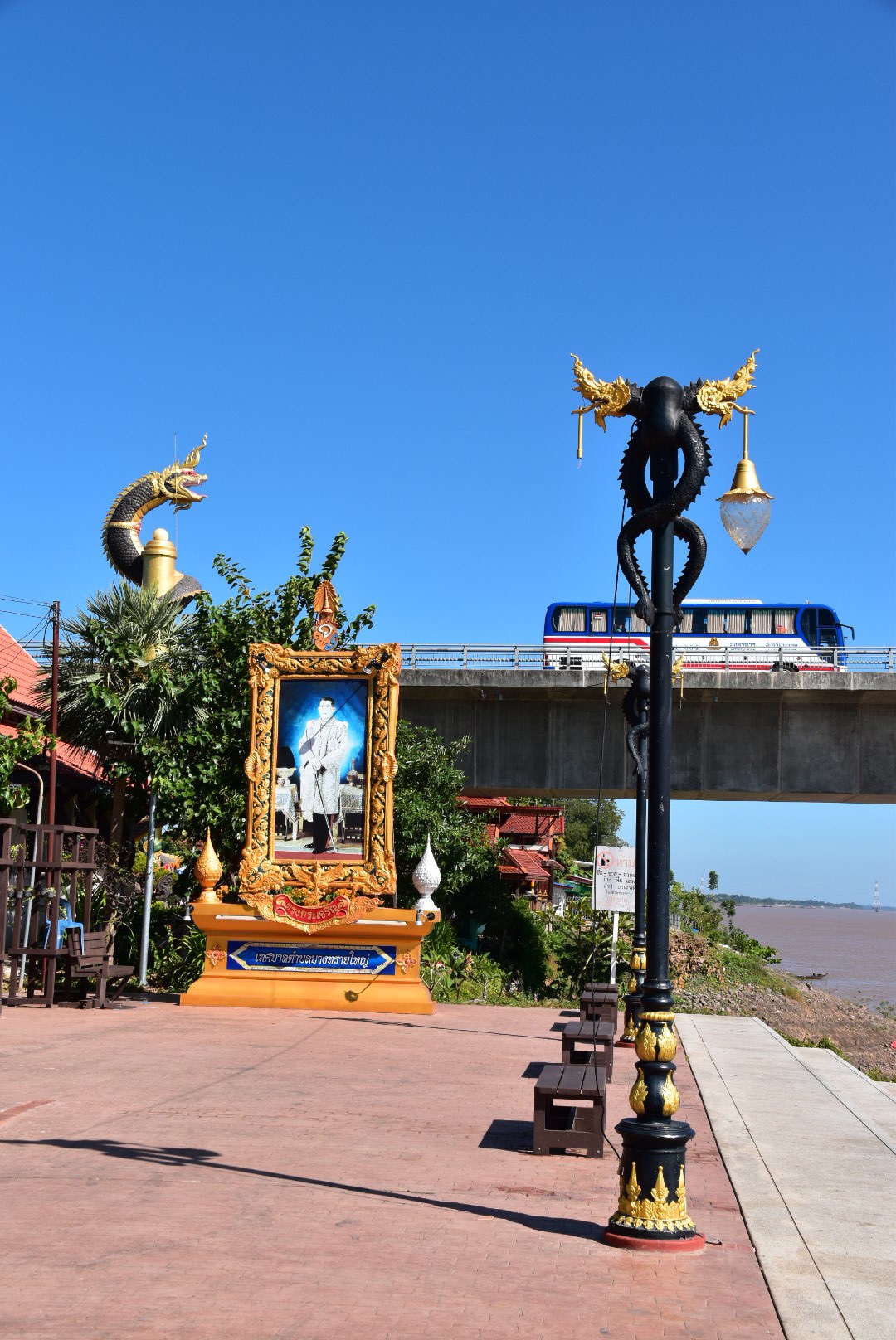 Maar we beginnen met een stukje Mekong. We zetten de brug naar Laos op de foto. Lopen een stukje over de boulevard en gaan dan met de tocht van een kleine 300 km beginnen. R begint met rijden maar als de weg wat rustiger is gaat M rijden. M zit achter het stuur en de eerste meters zijn vol bochten en diepe kuilen. Het begint eentonig te worden maar het is weer prachtig. Het landschap is hier heel anders. Veel heuvelachtiger, andere bomen/vegetatie. Het is een mooie weg maar met heel veel kronkels. En door al het verkeer maakt het een heel avontuur. Je zit niet echt relaxt achter het stuur, je ogen en oren moeten goed open staan. We rijden naar Khon Kaen, de provinciehoofdstad. Hier zullen we in het mooiste hotel Pullman Khon Kaen Raja Orchid slapen tijdens onze vakantie. We zijn dus zeer benieuwd. WOW het is geweldig. De lobby, je komt ogen te kort. En wat een heerlijke grote kamer en een lekker bed. Een badkamer waar je u tegen zegt. We gaan eerst weer zwemmen. Nu geen harde banken maar heerlijke ligbedjes en hele grote badhanddoeken. Heerlijk!!!