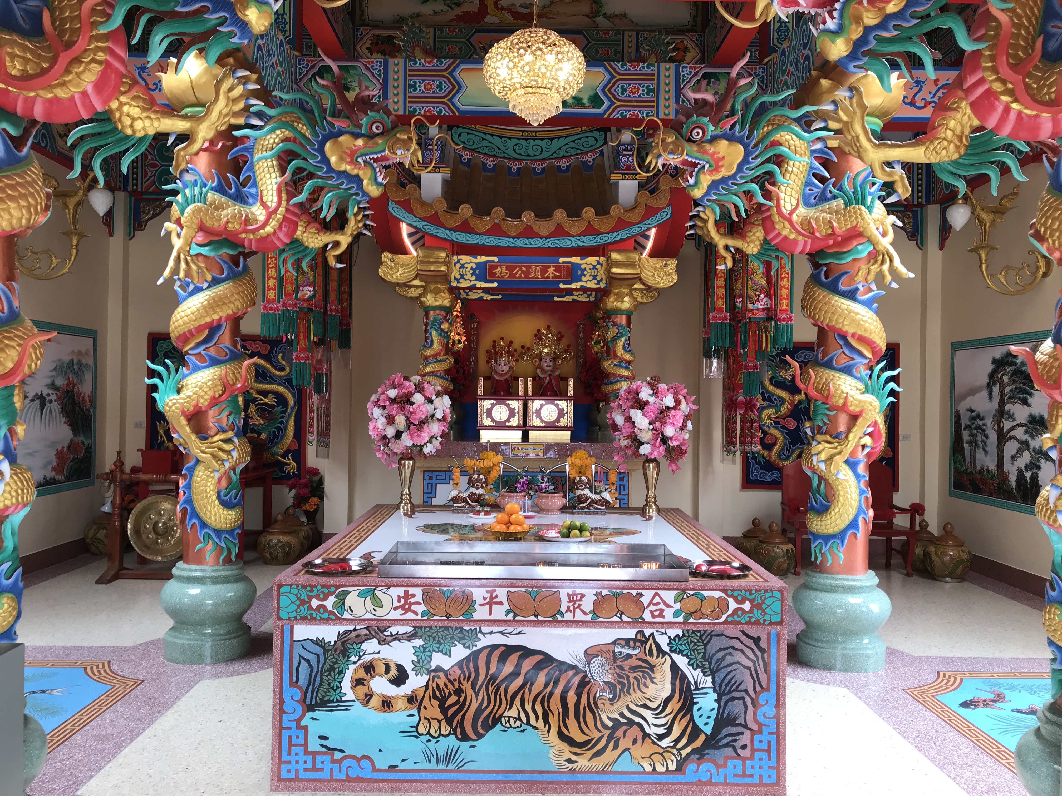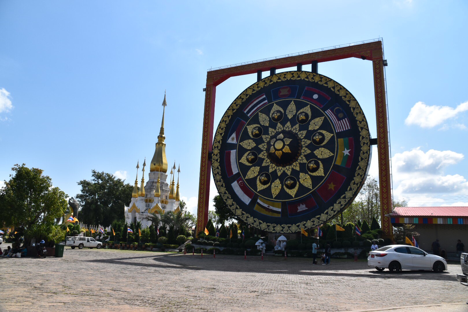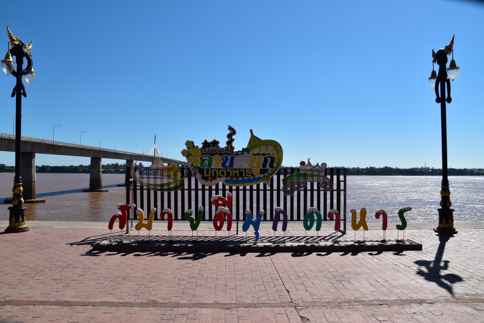Hier staat de grootste gong van het land en het is omringd met allemaal boeddhistische tempels. Echt prachtig. We zijn de enige toerist maar er lopen allemaal Thai rond die komen bidden. Het is een heerlijke plek om rond te lopen en veel indrukken op te doen. Als laatste tussenstop hebben we nog een uitkijkpost bij de Mekong ingelast om daarna door te rijden naar Mukdahan. Bij aankomst in Mukdahan beklimmen (met de lift) we eerst de Ho Kaeo Mukdahan (uitkijktoren). Voordat we een kaartje hebben gekocht en snappen dat de schoenen uit moeten is er veel handen en voeten werk en vooraf gegaan. Over het algemeen spreken ze in de Isaan slecht Engels. Mooi uitzicht over de Mekong, de stad en een heel groot buddhabeeld: Big Buddha op de berg Manorom. Dan naar het hotel. Een heerlijke grote kamer in het Ploy Palace hotel. We gaan eerst zwemmen. Daar hebben we echt zin in. Je wordt toch plakkerig van dit weer. Een beetje afkoelen in het water. Het is een mooi zwembad, de bankjes zijn wat hard maar M ziet toch kans om weg te dommelen. Zo de plakkerigheid is er af, nu de knopen uit het lichaam laten halen. Dat heeft M geweten. Elke spier is onderhanden genomen. En niet al te zachtzinnig. Inmiddels had de masseuse ook nog ruzie met de airco. En in plaats van koelte werd het op een gegeven moment steeds warmer in de kamer. En M had het al zo warm door de stevige massage. De kreukels zijn er ook weer uit. Pfff we zijn er lui van geworden. We hebben niet zo’n zin om buiten de deur te eten en zo’n honger hebben we ook weer niet dus we besluiten om in het hotel te blijven. Eerst gaan we naar beneden. Een dame staat daar te zingen. Het is niet onze muziek en de zaal is ook heel ongezellig. We gaan naar de Sky bar. Nou dat klinkt toch goed, toch. Daar zit een meneer achter de keyboard te zingen. Ook niet heel mooi maar beter dan beneden. We hebben ook gelijk een serveerster aan ons snoer hangen. We gaan strategisch zitten, niet te dicht bij de muziek. Als voorgerecht nemen we loempia’s. En dan zien we wel verder wat we nog nemen. Maar voordat we duidelijk konden maken wat we nu wilden hebben we het met handen en voeten geprobeerd, met Google translate en uiteindelijk kwam een 1 of andere meneer helpen. De loempia’s zijn besteld, de drankjes staan op tafel. Het belooft wat te gaan worden. En dat werd het ook. Want dit was tegelijkertijd ook de karaokebar. De Aziatische gasten die volop aanwezig waren stonden in de rij om mee te mogen doen. Het was niet onze muziek en de oren hielden het ook niet droog. Toen kwamen de loempia’s en hielden wij het zelf ook niet meer droog. Koud en vies. Tenminste wij vonden er niks aan. Vlug betalen en wegwezen!
