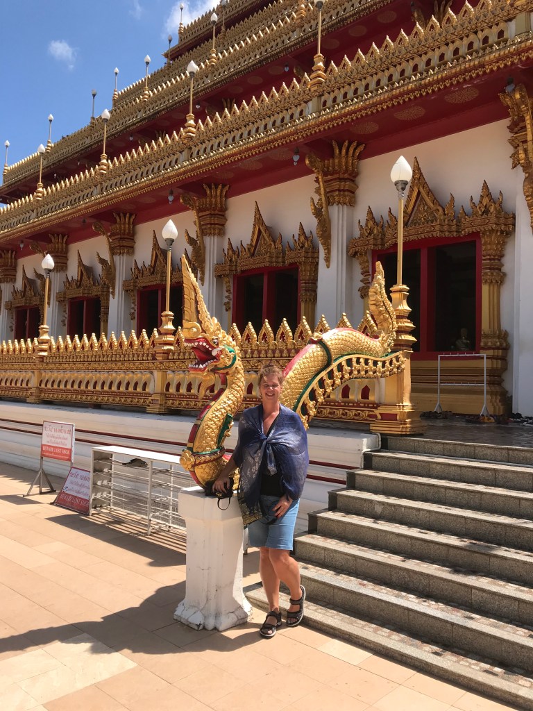 We gaan eerst langs de Wat Nong Wang tempel (Wat Phra Mahathat Kaen Makhon). Een negen verdieping tellende tempel. Wat een pracht en praal. De tempel wordt druk bezocht. In de tempel zitten tientallen monniken. Vele bezoekers bidden samen met een monnik. Er hangt een hele fijne sfeer. Na wat plaatjes te hebben geschoten gaan we lekker zwemmen bij het hotel. Het is zo’n 35 graden dus een beetje verkoeling is wel lekker. Gisteren waren we bij een eettent beland van een Nederlander (uit EIndhoven). Een katoey helpt ons. Eentje die zeer overdreven is maar wel gezellig. We bestellen ons eten en raken aan de klets met die Eindhovenaar. Hij heeft de zaak nu 3,5 jaar en het is heel hard werken volgens hem. Maar zit vervolgens wel de hele dag op zn achterwerk. De tijd verstrijkt en we hebben nog steeds geen eten. De masseuse van R staat op hem te wachten dus R ondergaat de massage op de lege maag. M eet in haar eentje. De Pad Thai van R is gecanceld. De eindhovenaar gaat verhaal halen bij zn vriendin. M hoort em mopperen. Vervolgens komt de vriendin langs bij M om zich te verontschuldigingen en een gratis Pad Thai aan te bieden. Nou zegt M is niet nodig. Ja dat was het wel. Nou heel lang verhaal kort. Die eindhovenaar ligt bij dezelfde massagesalon als R. Die stormt die zaak binnen, hè roept hij, ligt MEPPEL hier soms?, en gooit het gordijn zo open. Heeft ie een zakje Pad Thai bij zich. R voelt zich helemaal opgelaten. Hij geeft de Pad Thai stiekem aan de masseuse. Vervolgens ontwijken wij de volgende dagen de Brabander.