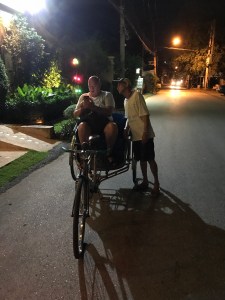 Met de fietstaxi (die voor de deur van het hotel staan) worden we er heen gebracht. Niet dus. We worden gewoon ergens anders afgezegd. Dit jaar is het echt pet met de taxichauffeurs. In Bangkok zijn we 1 keer met de tuktuk gegaan. Deze wilde even een extra tussenstop doen, bij zn vriend. (Gewoon een truc, zo’n tussenstop om je wat aan te smeren) Maar wij zijn ook niet van gister. Met harde bewoordingen heeft R geregeld dat hij in 1x doorreed maar de lol is er wat van af, voor de chauffeur ook. We zijn dan ook blij met grab. Alleen rijdt die nog niet in iedere stad. We eten daarom ergens anders, ook lekker.