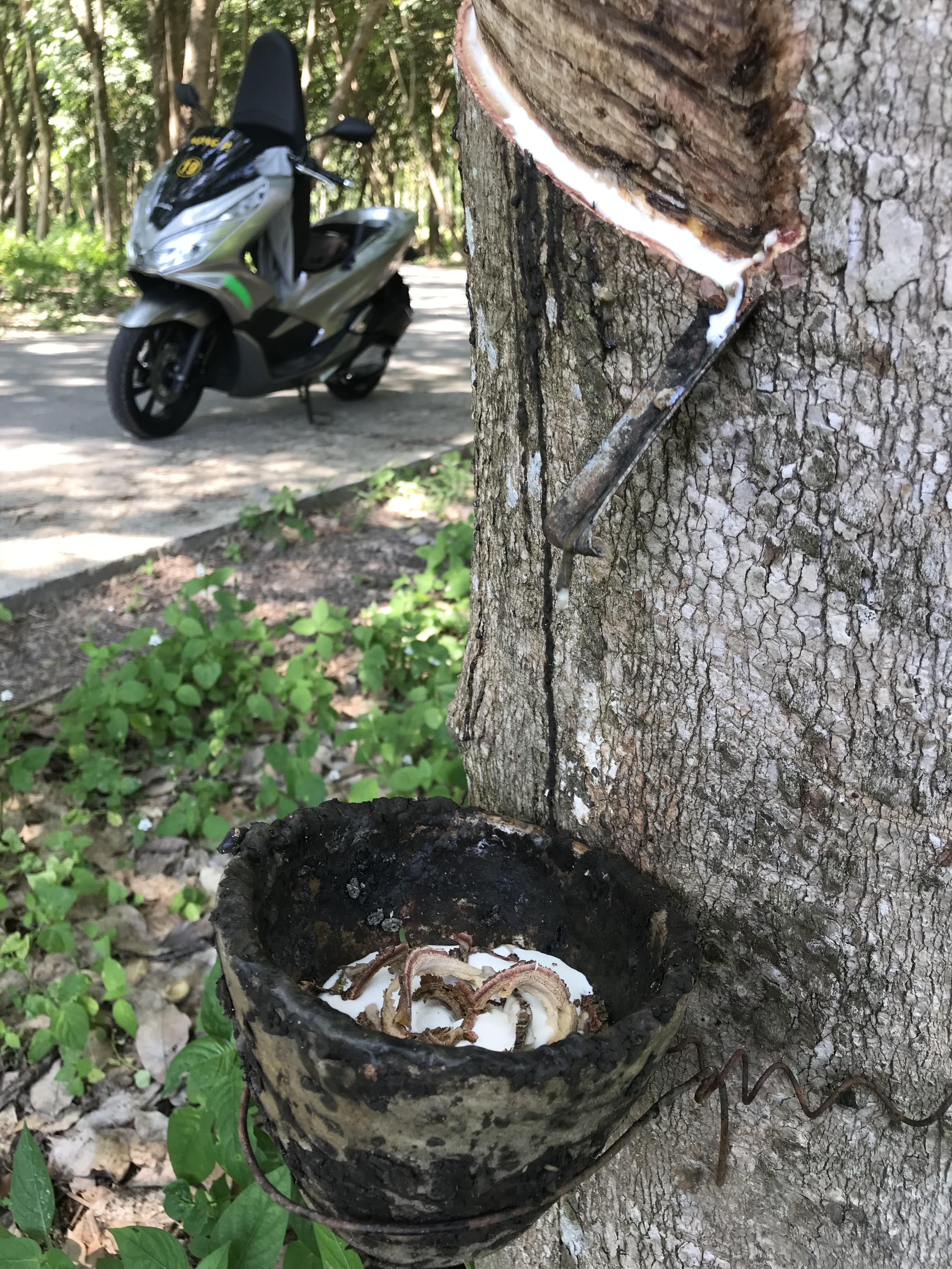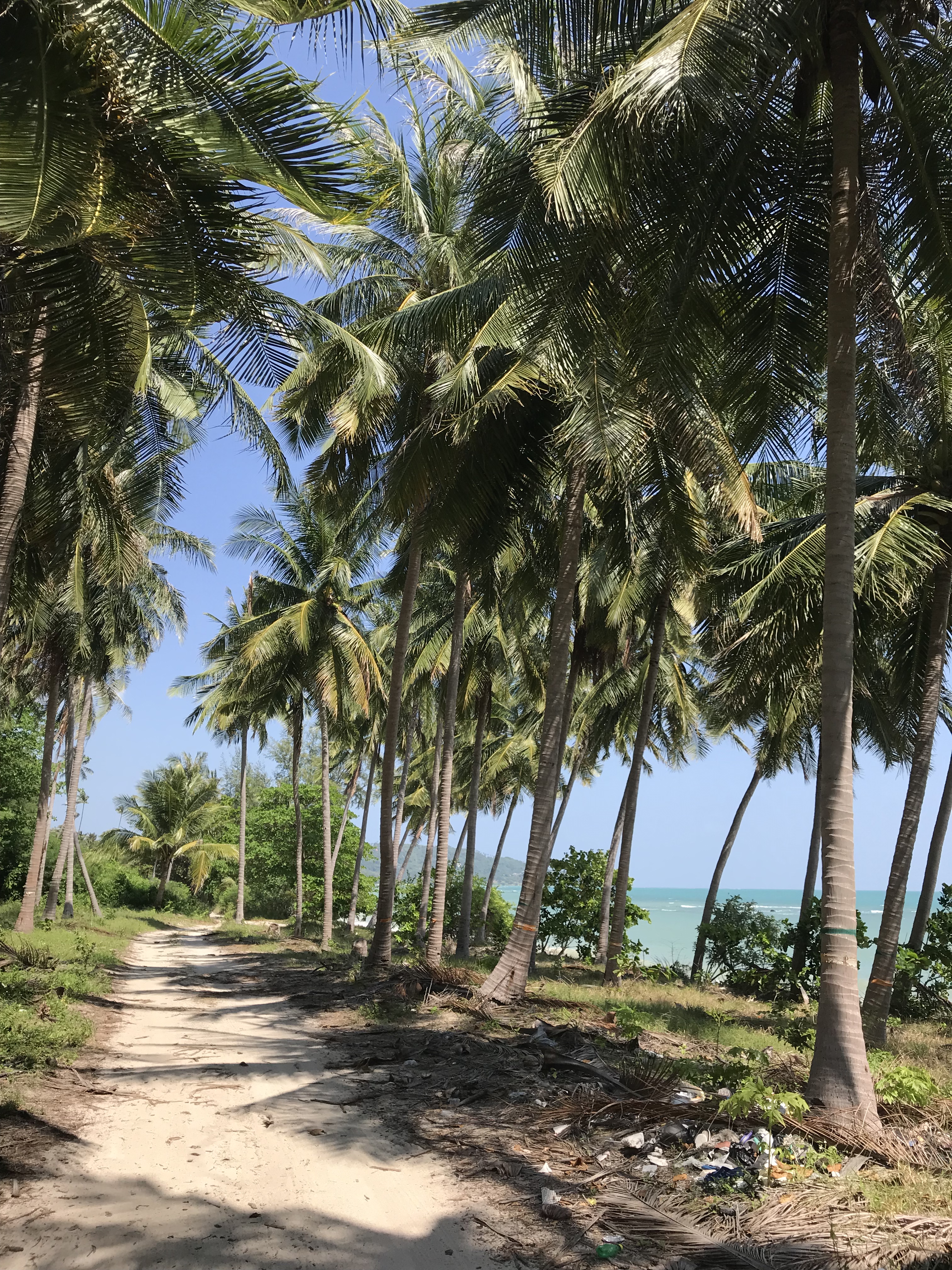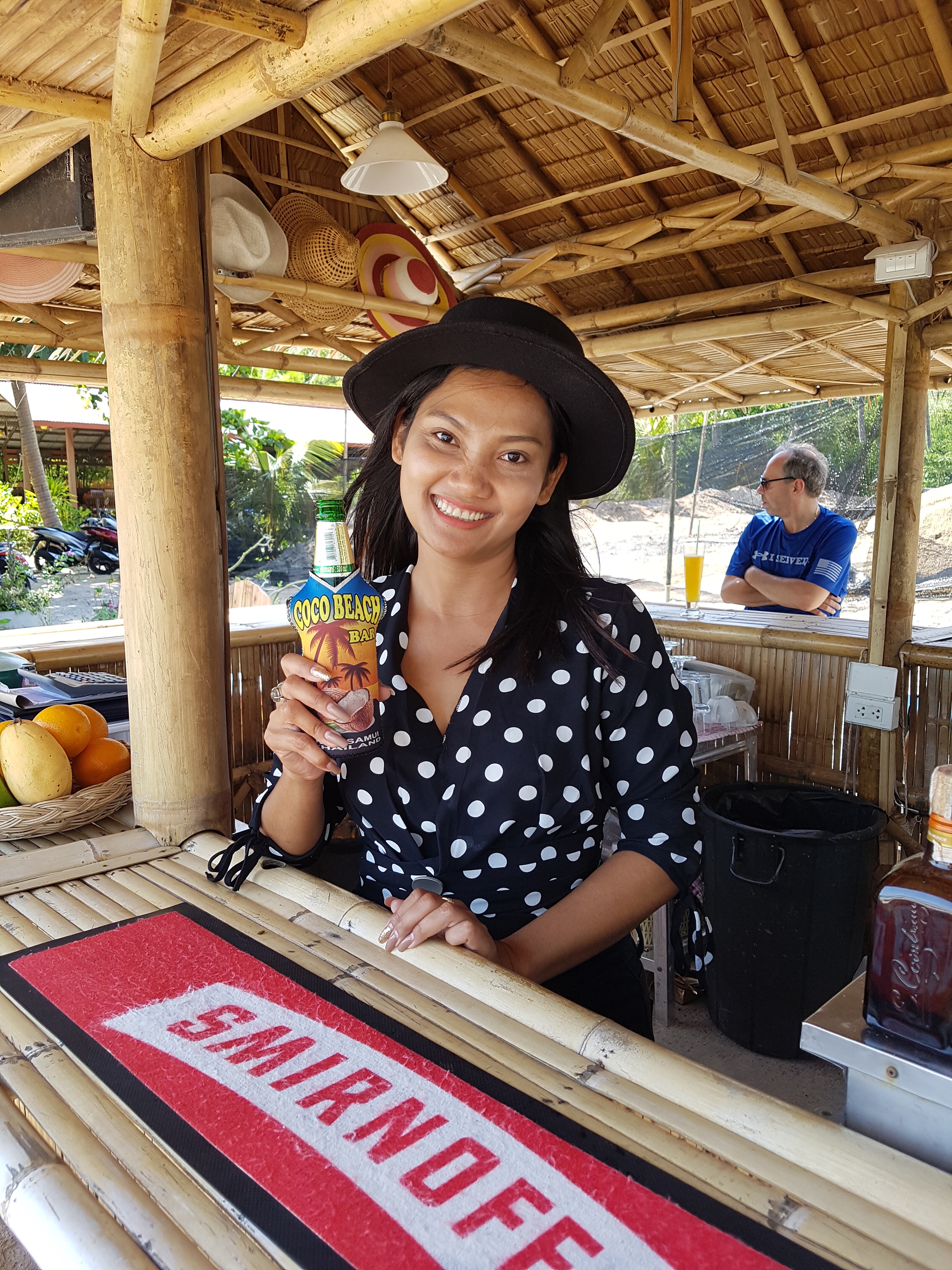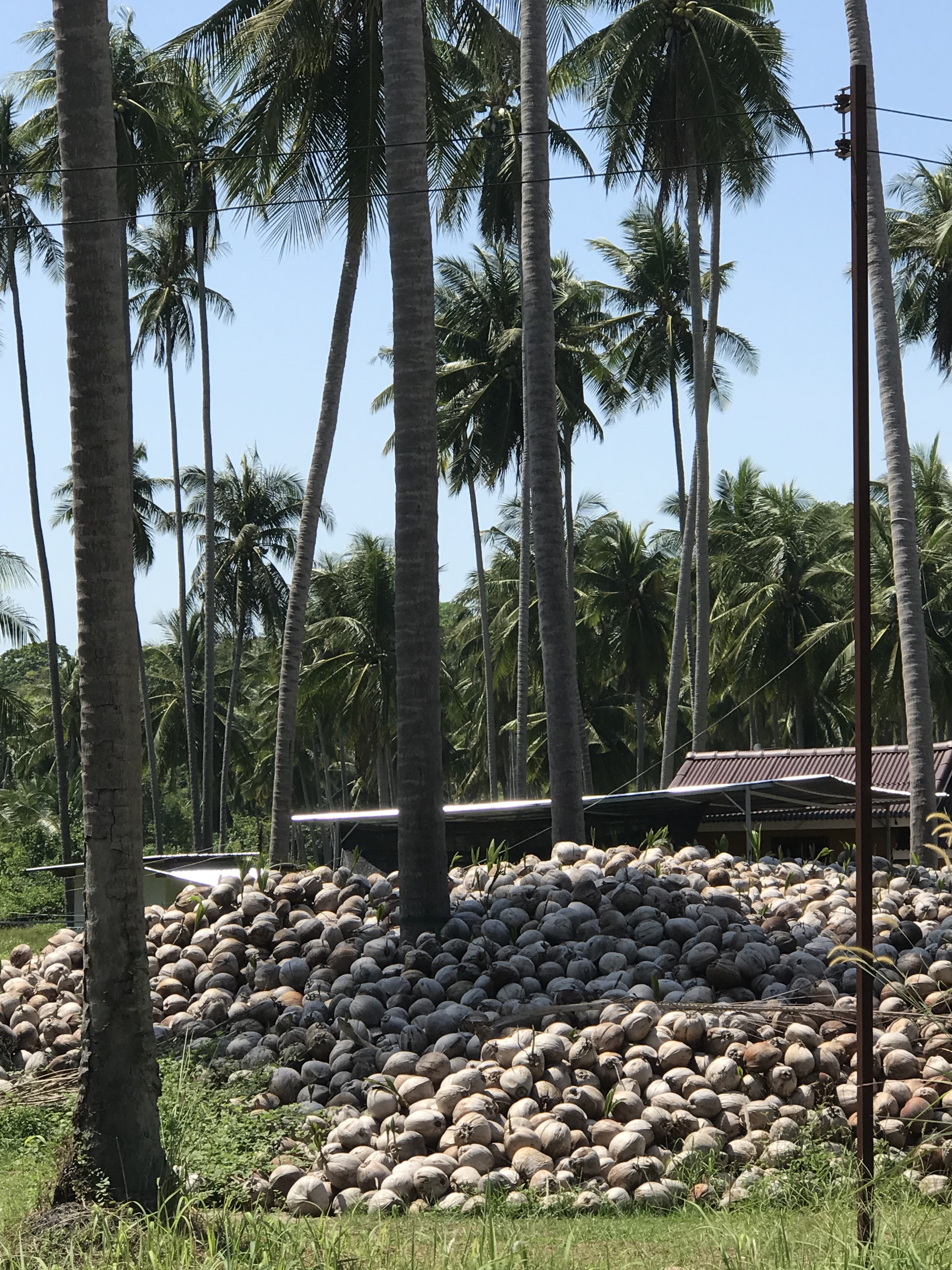 We rijden weer verder en komen op steeds smallere wegen. Prachtig! We rijden langs palmbomen, heel veel kokosnoten, rubberbomen en belanden uiteindelijk bij de Coco Beach bar. Echt een prachtige plek. Witte stranden, blauwe zee, strandtent. Een leuke Thaise dame achter de bar.