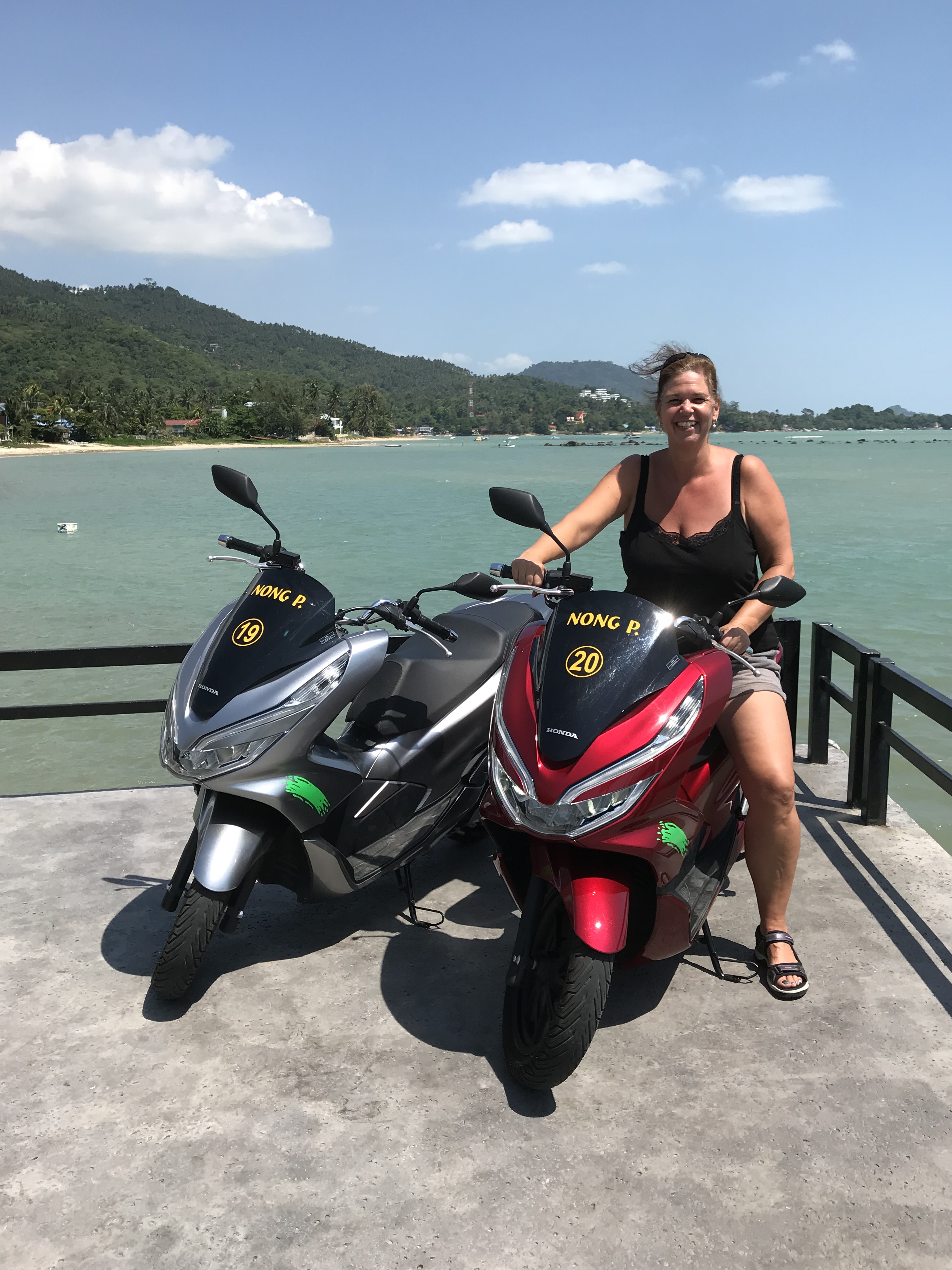 Op zoek naar scooters! Half 10 zijn we al onderweg. R heeft al uitgezocht waar enkele zitten. Uiteindelijk belanden we per ongeluk bij de verhuur waar we het geregeld hebben. Een grijze en rode bolide, 150 cc, waar we de heuvelachtige wegen prima mee kunnen trotseren.
