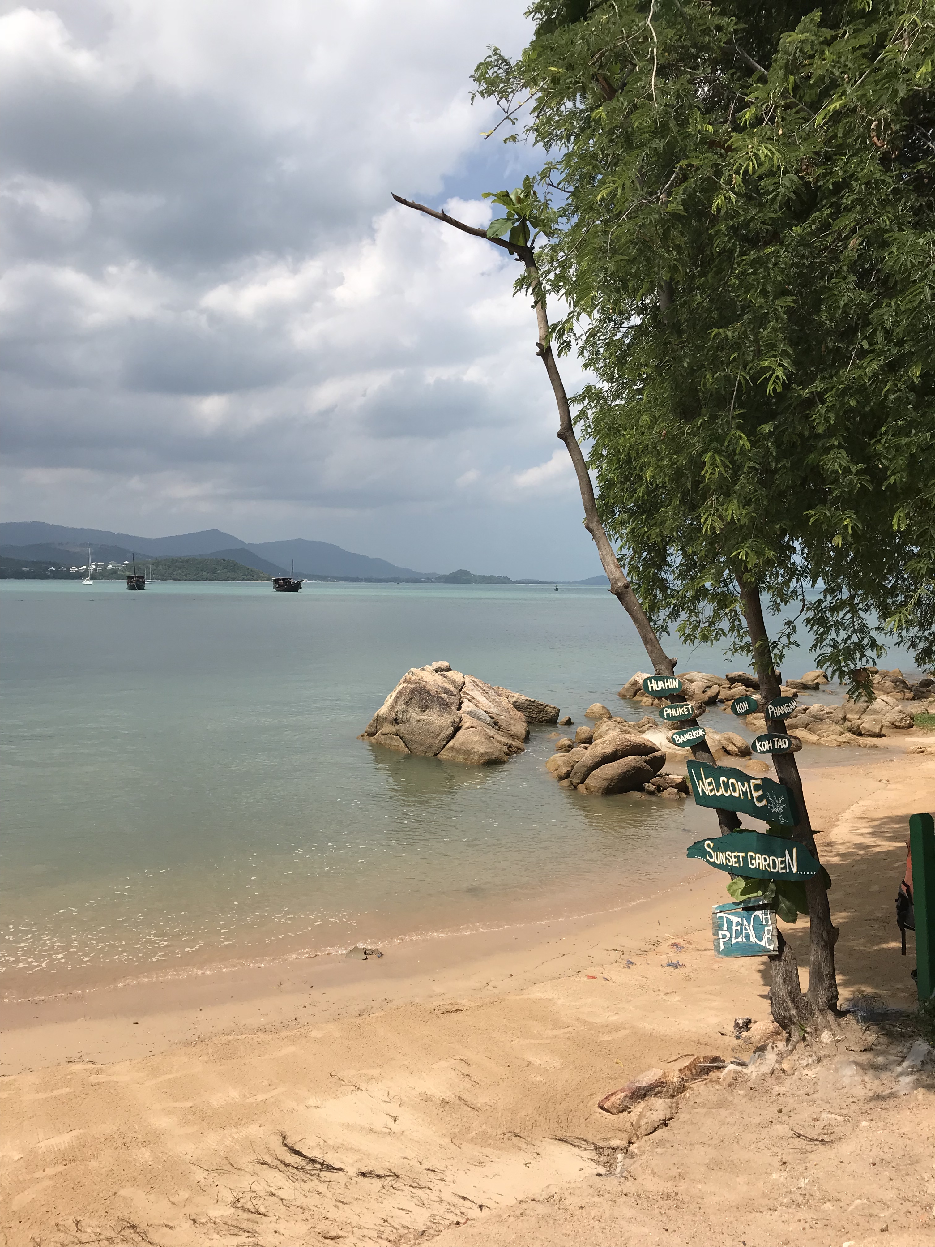 Half 9 worden we netjes opgehaald door de taxi om ons naar het vliegveld van Chiang Mai te brengen. Het is maar een kwartiertje rijden. Dan gaat R aan de slag om onze bagage doorgelabeld te krijgen tot aan Samui, we maken een tussenstop van een paar uur in Bangkok. Doordat het twee verschillende maatschappijen zijn maakt het erg ingewikkeld voor hen (?) Uiteindelijk lukt het na ongeveer een half uur lullen. Het is een relaxte dag. De vlucht naar Bangkok zit niet vol en het is maar een uurtje vliegen. In Bangkok verdwijnen we in de Blue Ribbon lounge, heerlijk genieten lekker eten en drinken op fijne hangbanken. En dan is het nog een goed uur vliegen naar Samui. Waar het regent. WTF regen???? Daar zitten we niet op te wachten. Chiang Mai mooi weer, Bangkok mooi weer en nu we plat op het strand kunnen gaan liggen regen???? Maar als we in het hotel zijn is het al opgehouden. We gaan gelijk “de stad” in. Wat is het veranderd. Veel nieuwe restaurantjes maar ook nog oldies. We belanden bij 1 van hen. Drankje en een hapje. En dan toch maar weer terug naar t hotel. Zo’n reisdag is toch altijd wel vermoeiend.