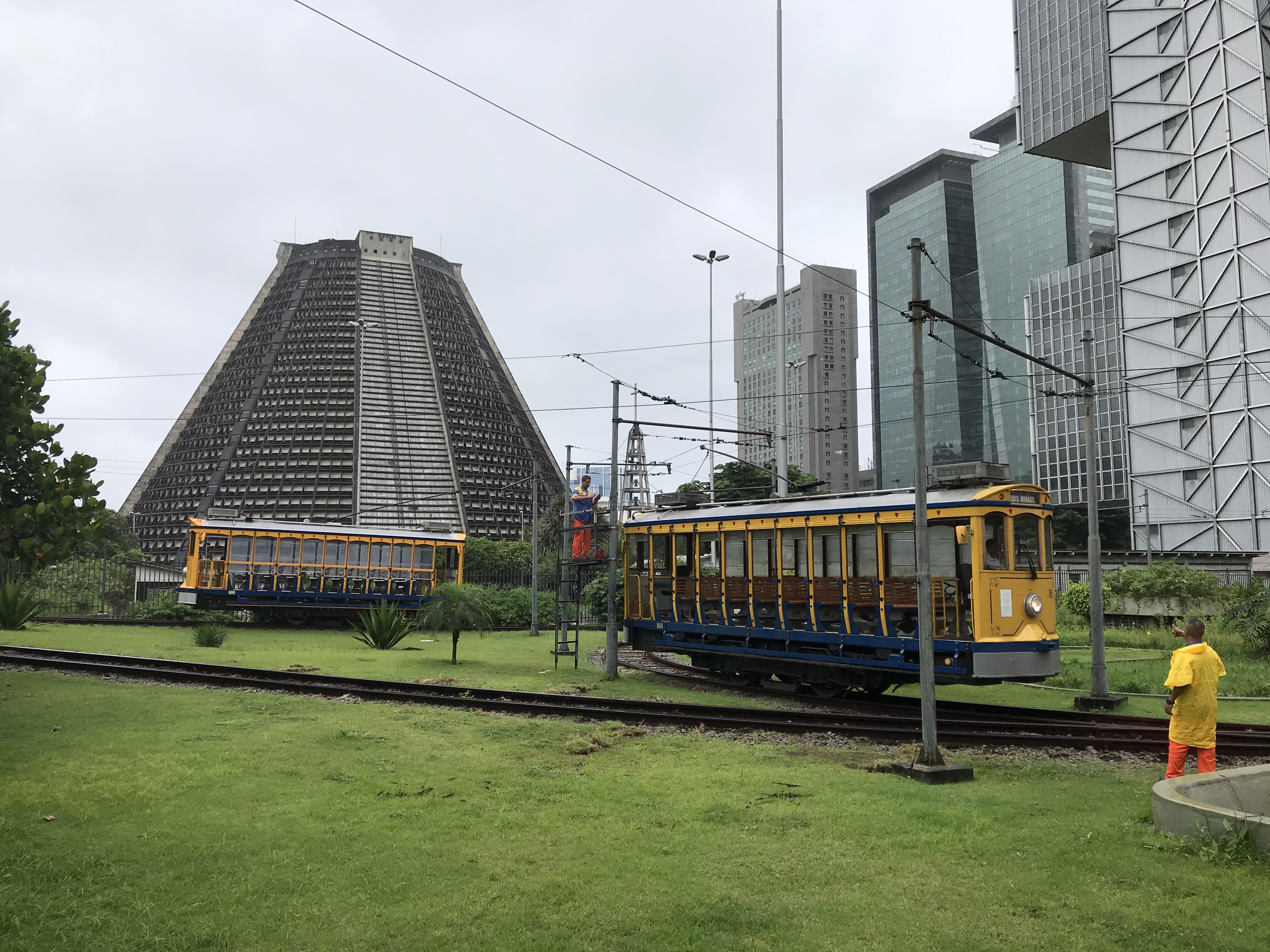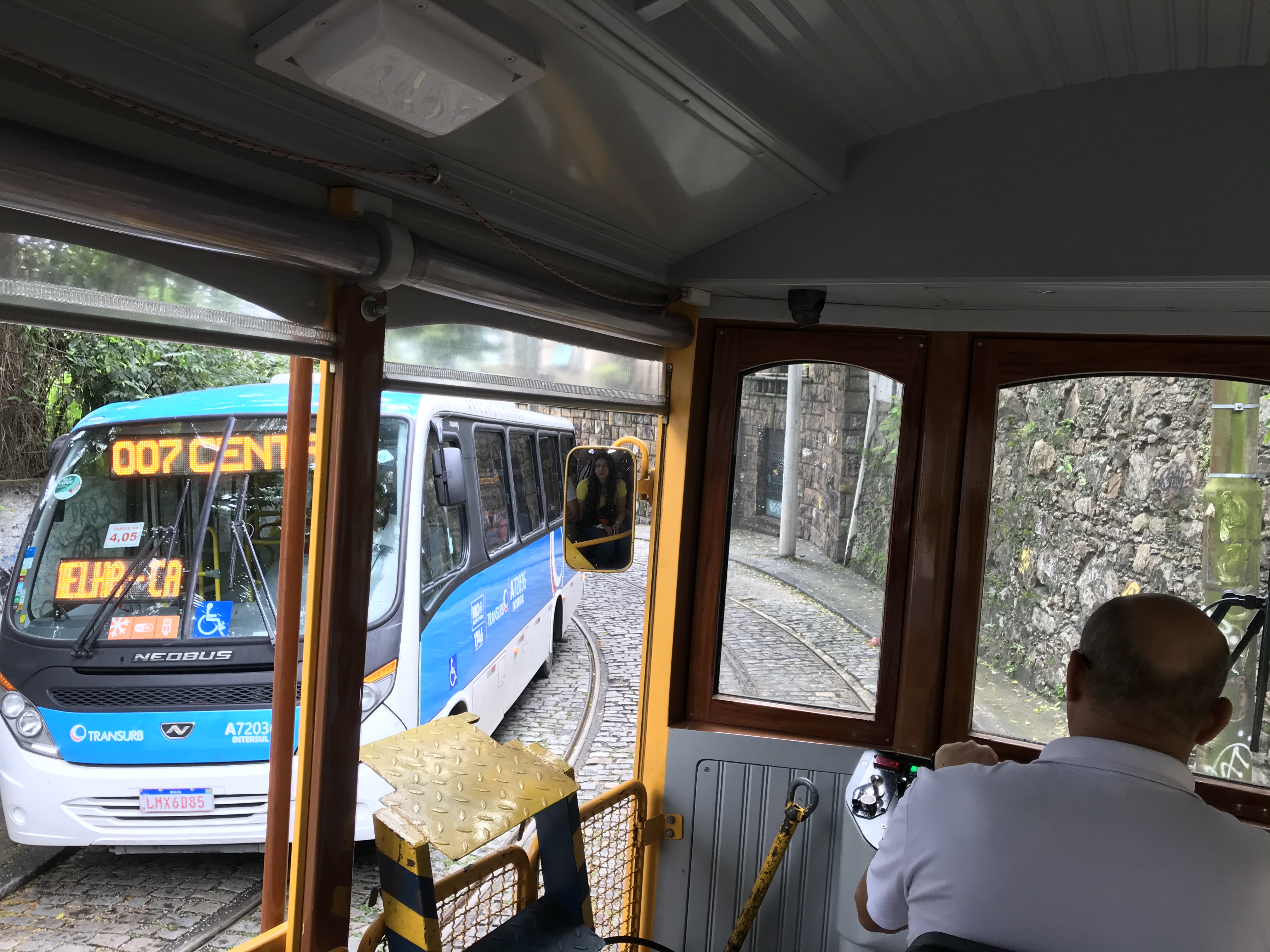 Maar eerst weer ontbijten. Omdat het zondag is doet M zich te goed aan al het zoete lekkers. Morgen weer op rantsoen! Moedig als we zijn vertrekken we in onze korte broek en t-shirt. We hebben onze vrienden van Uber geregeld om ons naar de tram Santa Teresa te brengen. We crossen een flink gedeelte door de stad. We gaan rijden door een tunnel en tot M’s verdriet komt het met bakken uit de hemel. Maar we zijn er nog niet. We rijden een stuk dezelfde route als gisteren zo zo via de tribunes van het carnaval weer bij de Cathedral te belanden. Het is daar in de buurt maar niet op dezelfde plek. Het handen en voeten gaan we het gesprek aan met de chauffeur. Over het algemeen spreken ze slecht/niet Engels. Met het Spaans van M en handen en voeten komen we er vaak wel uit. Deze meneer sprak nog een paar buurtpolitie mensen aan. En na 2x rechts waren we bij het beginpunt van de tram. Daar was het angstig stil. Rijdt hij wel. Jazeker wel maar pas over een uur. Er is al heel wat bedrijvigheid op het “ perron”. Het uur vliegt voorbij. Inmiddels is het al aardig druk geworden. We mogen in stappen. Het is inmiddels droog! Het is de bedoeling dat er vier mensen op een rij gaan zitten, zodat er 32 mensen mee kunnen.