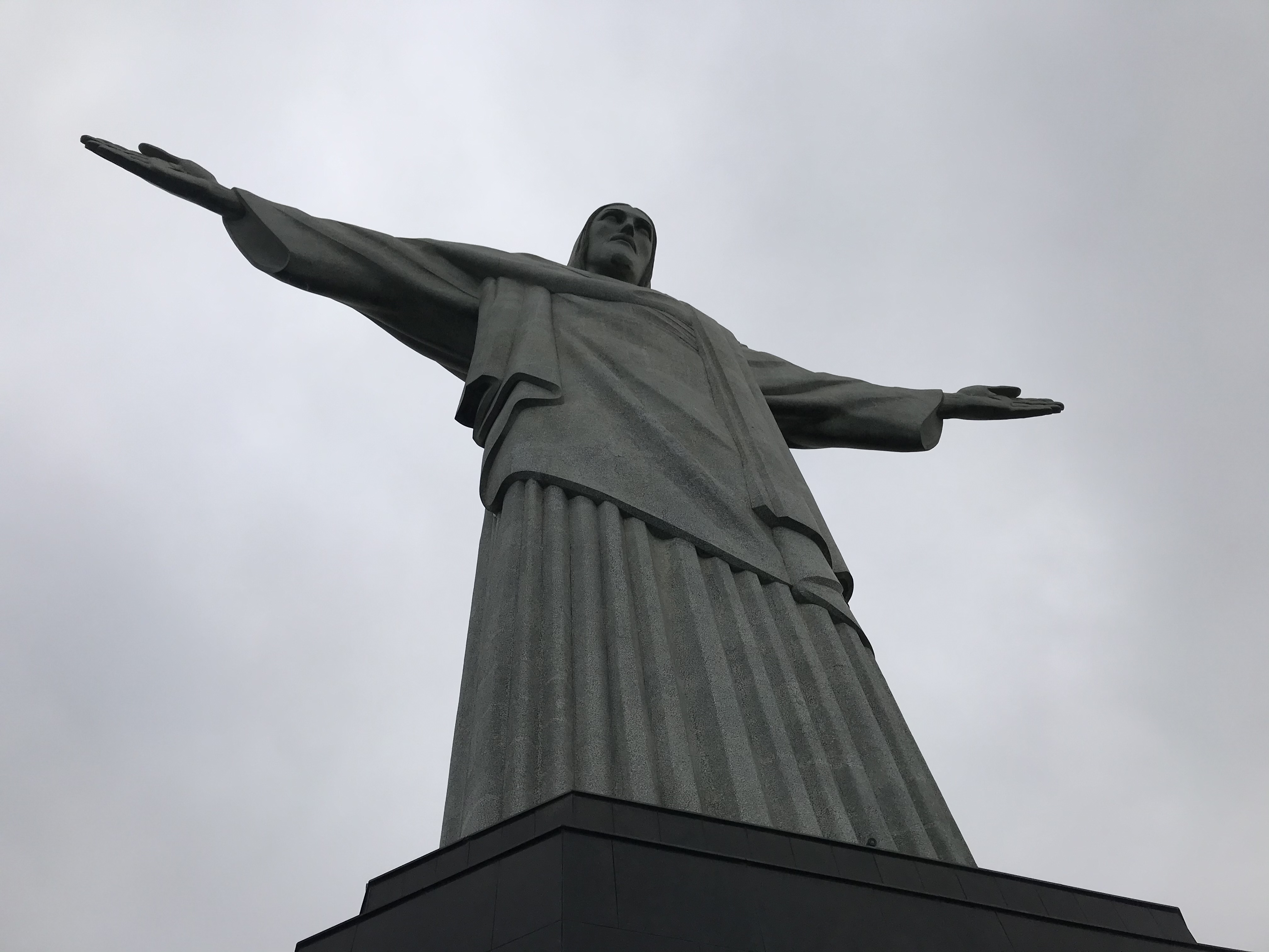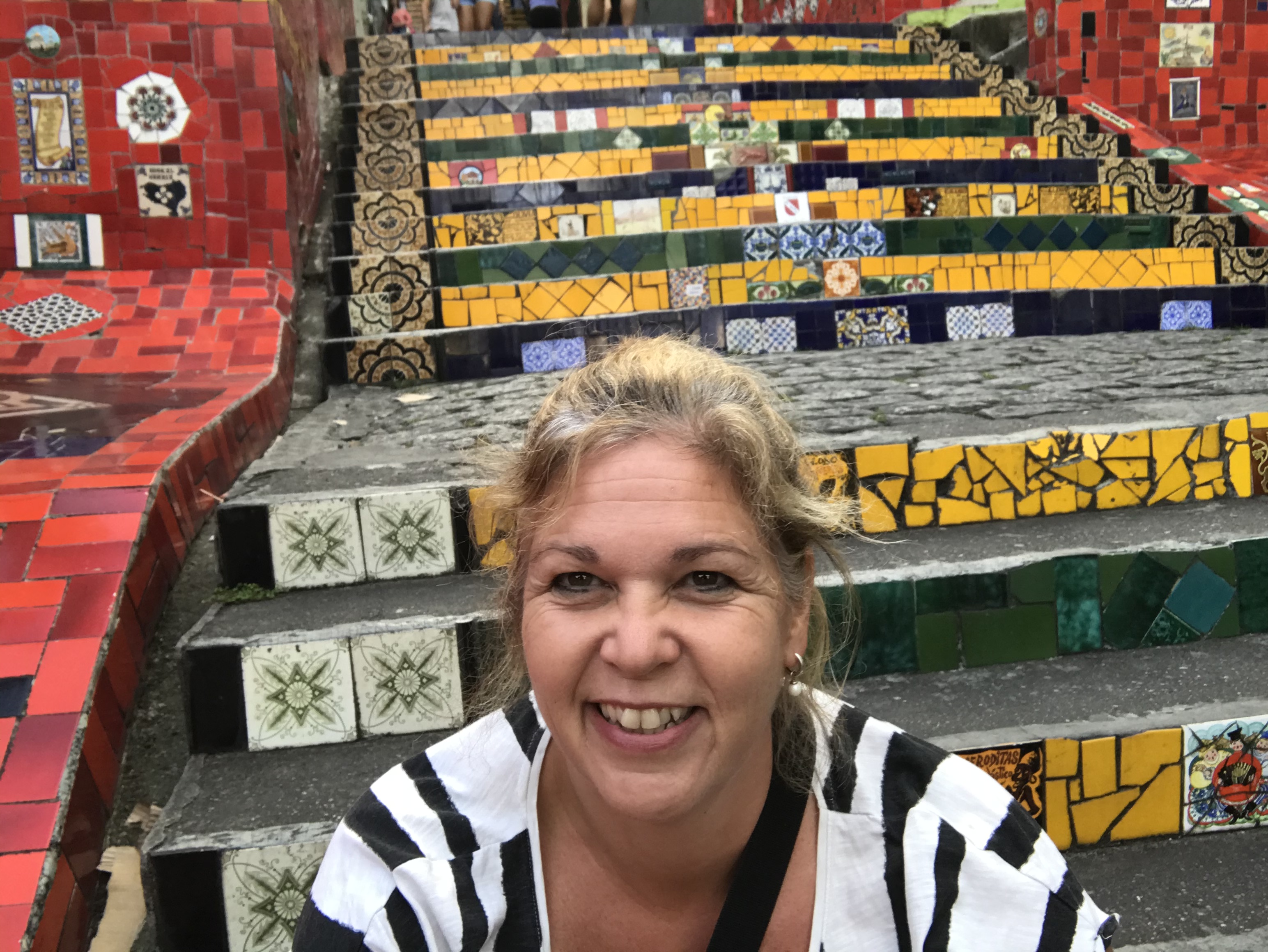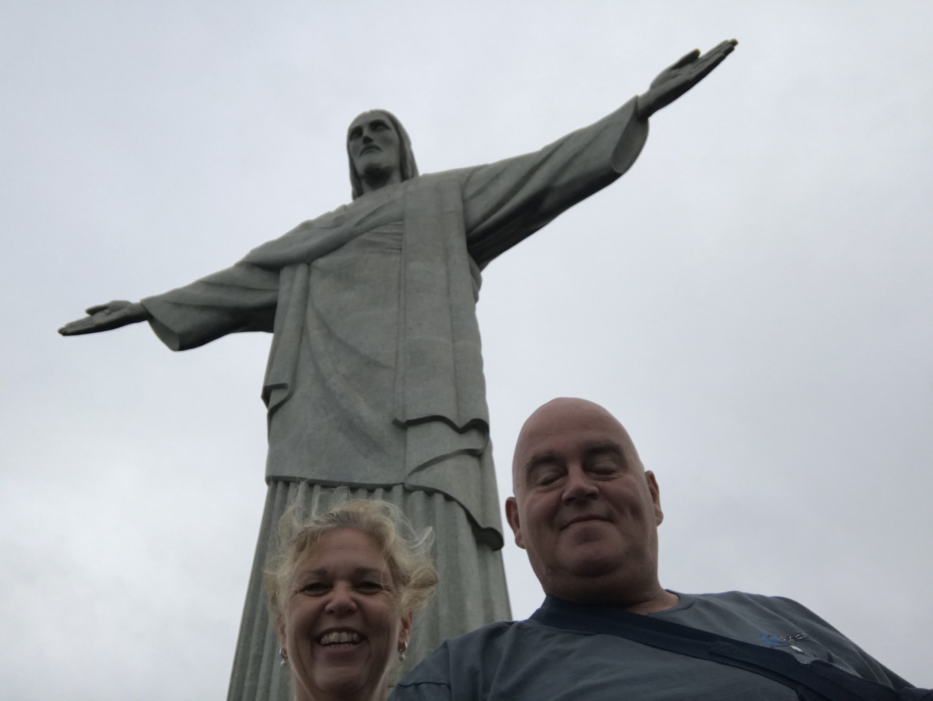 Om 14 uur worden we opgehaald voor de excursie naar het Christus beeld en de trappen. Wijs geworden van gisteren hadden we al niet verwacht dat er om 14 uur er iemand zou zijn. Het werd weer drie kwartier later. Het is nog steeds droog! Het busje zit vol. De mensen zuchten als we binnen stappen. Die waren het ook al zat. De gids een popiejopie waar we na 5 minuten al zat van waren. Er moesten nog meer mensen opgehaald worden. Het wordt later en later. M ziet het hele Christus beeld in rook opgaan. Want we gaan immers eerst langs de trappen Escadaria Selaron. De chauffeur is ook niet goed snik. We sjezen naar boven. De wegen zijn niet zo heel goed. We schudden allemaal door de bus. De een klapt tegen het raam, de ander stoot zn hoofd tegen het plafond. Echt onverantwoord. Maar goed, M laat de pret niet drukken. Met gierende banden staan we boven op de berg. Op naar Christus de Verlosser. Het miezert inmiddels. Het waait. Het is eigenlijk gewoon koud. M racet naar boven. Het is droog!!! Christus staat niet in de wolken!!! M is happy!!! Selfie hier een selfie daar. WoW hier staan we dan. Een geweldige ervaring. We worden weer in de bus gepropt. We racen door de straten, we halen in waar het niet kan, gelaten ondergaan we het.
