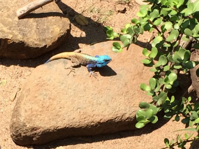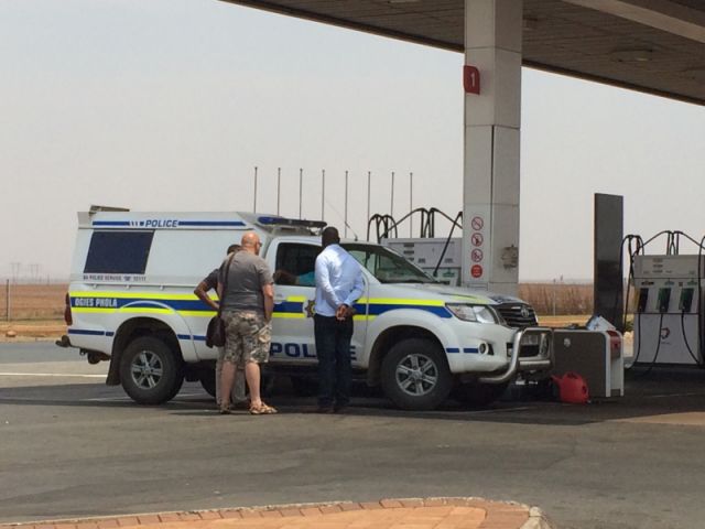 Wat een dag, wat een dag. Na een heerlijke, doch korte nacht zijn we benieuwd naar het ontbijt. Nou geweldig hoor. Alles dr op en dr aan. Dus na een goed gevulde buik vetrekken we uit ons hotel. Met het hotelbusje gaan we naar het vliegveld om daar onze auto voor de komende 1,5 week op te halen. We hebben een SUV en meneer wil een witte en die krijgt ie. Een Toyota RAV4 (@Andre), bijna gloedje nieuw en maar 2300 op de teller. Spik en span dus. Een klein uurtje later is het niet meer spik en span. Na een kleine omweg in Johannesburg zaten we al snel op de snelweg naar Dullstroom. We gingen voor een kleine pitstop. Dit werd ruim een uur. We hadden de auto net geparkeerd, we zaten nog in de auto dat een of andere onverlaat die naast ons stond de deur open smeet zo tegen ons aan. Nou het donderde en het bliksemde…. Gegevens uitgewisseld, foto’s gemaakt, op de politie gewacht en toen uiteindelijk maar weer verder gegaan. Al snel verandert het landschap. Het is heuvelachtig, gelig, met toch wel vegetatie. Marianne geniet. Rudy is al snel gewend aan het links rijden, soms gaan de ruitenwissers ff aan als we af willen slaan……. We stoppen toch nog maar een keer bij een groot tankstation. Dit doet zeer Amerikaans aan. Er zit altijd (vr)eettenten bij. En belangrijk… een schone wc. Marianne is als een kind zo blij. Ze ziet haar eerste neushoorn. Rudy is niet onder de indruk. Deze zitten achter een hek…. Foto gemaakt die zwarte vlek is em. Na een kleine 3,5 uur komen we in Dullstroom aan. Toeristisch met heel veel restaurantjes. Het ligt op 2100 meter hoogte en het is er gezellig druk. We rijden toch door om wat tijd in te halen. In de volgende plaats Lydenburg stappen we toch even uit. Rudy heeft dit wel nodig :). De afgelopen kilometers heeft Marianne gereden…….vandaar. Na doodsangsten te hebben uitgestaan is ie toe aan een drankje. We drinken wat bij een wel zeer blije homo die wel erg gezellig is. Hij had ook een Hollandse achternaam, maar die zijn we vergeten. Wat ons opvalt is dat de “Boeren” zeer geïnteresseerd zijn als ze horen dat we uit Holland komen. Onderweg zijn we idd allemaal Nederlandse plaatsnamen tegengekomen wat heel apart is. We luisteren naar een Zuid-Afrikaanse zender, met nieuws en muziek, grappig is dat. We kunnen het Zuid-Afrikaans aardig volgen. We vullen elkaar aan. Het laatste gedeelte van deze reisdag is echt prachtig. We rijden de Long Tom Pass. Prachtig. De natuur verandert. Scherpe bochten, dennenbomen, prachtige vergezichten. Genieten! We hebben overigens een prachtig boekwerk gekregen van het reisagentschap. Aangezien de tomtom de weg niet kent rijden we via dit werkje. We vinden het in een keer. De laatste 4 km op weg naar onze Lodge is een zandweg vol gaten en stenen. Een grote stofbende. Aan beide kanten vd weg bananenbomen, wijngaarden. Een lust voor het oog. Maar in het donker zien we deze weg niet zitten! Vanavond gaan we nergens meer heen en eten bij de Lodge. Een driegangenmaaltijd waar het voor- en nagerecht onze toppertjes waren. Tis wel weer ff wennen voor Rudy om tijdens het eten van alle kanten te worden gadegeslagen te worden door de Tsjiktsjaks en Gekko’s. Brrrr, hij houdt er niet van. Het is niet laat geworden, we lopen met de ledzaklantaarn(!) aan terug naar het huisje. Nadat Rudy nog ff het huisje van binnen heeft nagekeken op ongedierte, ging het licht toch uit.