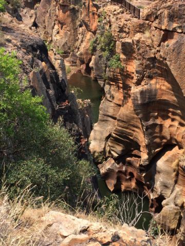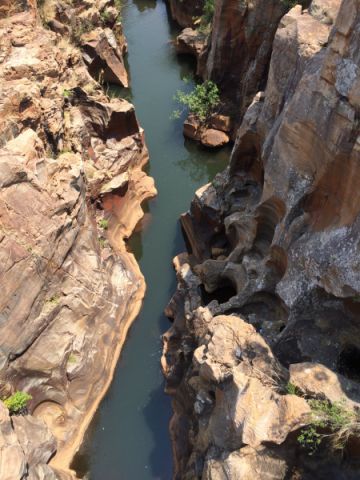 Vandaag dus de panaromaroute. Maar voordat we daar aan konden beginnen moest eerst de auto door de wasstraat. Het rode zand moest eraf. Maar ja vind er maar eens. En die dan ook nog eens open is op zondag. Maar Rudy zou Rudy niet zijn als we na een half uurtje bij de Zuid-Afrikaanse wasstraat staan. Een handwasstraat waar 2 negertjes de spuit erop gooien, een sopje er overheen en schoonwrijven maar. Een half uurtje later blinkt ie weer aan alle kanten. Voor een habbekrats. De supermarkten zijn hier wel op zondag open maar je kunt bijvoorbeeld geen drank kopen. Daar staan provisorische hekken voor. Maar goed de route. Prachtig. We rijden eerst naar het eindpunt om vervolgens terug te rijden om zo de drukte te mijden. Dat lukt aardig. We starten bij de Drie Rondawels. Doordat het zeer heiig is vallen de kleuren wat weg. Maar toch mooi om te zien. Het is vergeven met stalletjes koopwaar. Maar ze zijn niet opdringerig. Dit was een vlugge stop. Nu naar de Blyde River Canyon en de pothole. Dit vond ik echt het mooiste. Superkleuren. Echt een lust voor het oog. Op de weg zelf zitten ook allemaal (potholes) gaten dus je laveert de hele tijd door/langs de gaten. Maar de wegen zijn tot nu toe over het algemeen best redelijk te noemen. Wel gek is het dat je wandelaars, fietsers en andere weggebruikers op de snelweg tegenkomt.