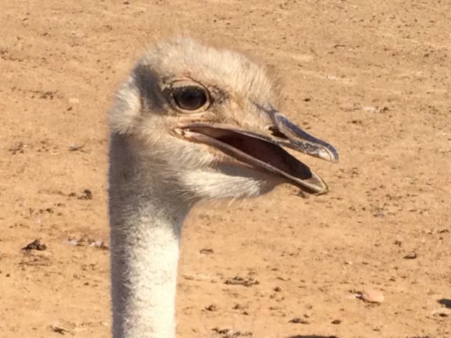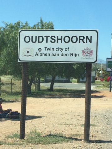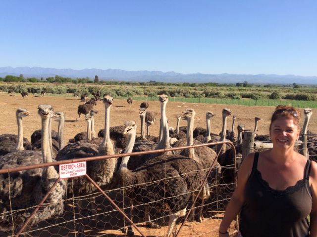 Helaas 😉 moeten we alweer afscheid nemen van de Britse dames. We gaan het hete binnenland in. Er wordt 40 graden verwacht. Inmiddels kijken we nergens meer van op. Alles is inde Jeep gestouwd en karren maar. Eerst richting George, een stuk van de tuinroute, 1x rechtsaf slaan, dan immer gerade aus en je bent in Oudtshoorn. Het landschap is totaal verschillend. Van de groene kuststrook veranderd het in een dor, woestijnachtig landschap met veel struiken met van die enorm grote stekels. Op zich is het, met die zon erbij, bijzonder mooi. Ik zie op een gegeven moment een kudde koeien (van die friese) later nog meer, maar Oh, nee dat waren struisvogels. We zijn nu in het gebied met grote boerderijen en hun landerijen staan vol met struisvogels. Wij zelf zullen ook op een farm bij de struisvogels gaan slapen. Ze hebben daarbij een Guesthouse gebouwd. Oudshoorn zelf is niet zo heel veel. Een paar oude gebouwen, kerken en wat winkels. Inmiddels is het ruim35 graden en we puffen en hijgen nu toch wel wat af. In de zon proberen koffie te drinken maar dat was echt veel te heet. Dan eerst maar naar onze slaapplaats. Ruim 12 km buiten Oudshoorn. Dat wordt geen ommetje om vanavond ;). Het ligt werkelijk prachtig, tis gewoon een grote villa met blokjes van 3 bungalowkamers, onze kamer mag er wezen hoor. Wat een geweldig mooie en sjieke nederzetting in het mooi landschap. De rest van de middag doen we het rustig aan, dat moet ook wel met deze temperaturen, tis echt bloedheet. Dus ff wezen lunchen in de stad en daarna heerlijk dobberen in het zwembad. De klapper komt s avonds. Omdat we, zoals Rudy zegt, een tyfus eind vd bebouwde wereld zitten, eten we vanavond bij La Plume (zo heet het Guesthouse) Geweldig mooi is het restaurant en Wow, wat was dat goed en lekker. Rudy smikkelde bijna zijn bestek er bij op, zo lekker mals was de struisvogel biefstuk. Het etentje was de perfecte afsluiting van deze relaxte dag.