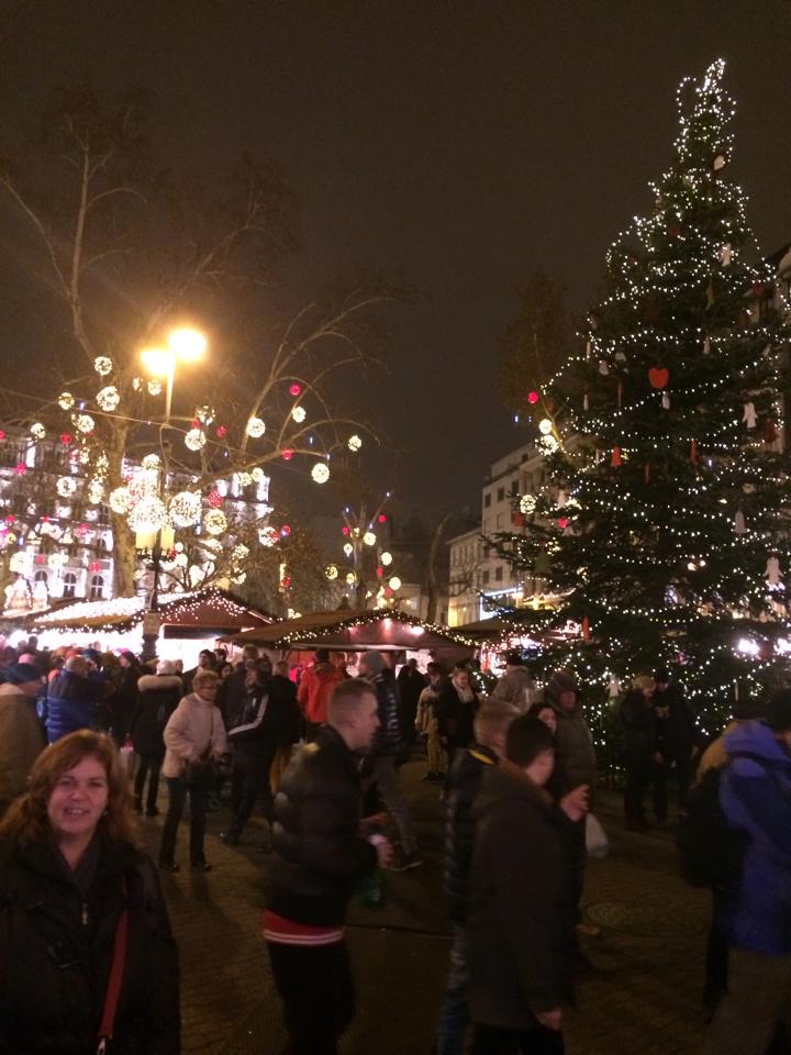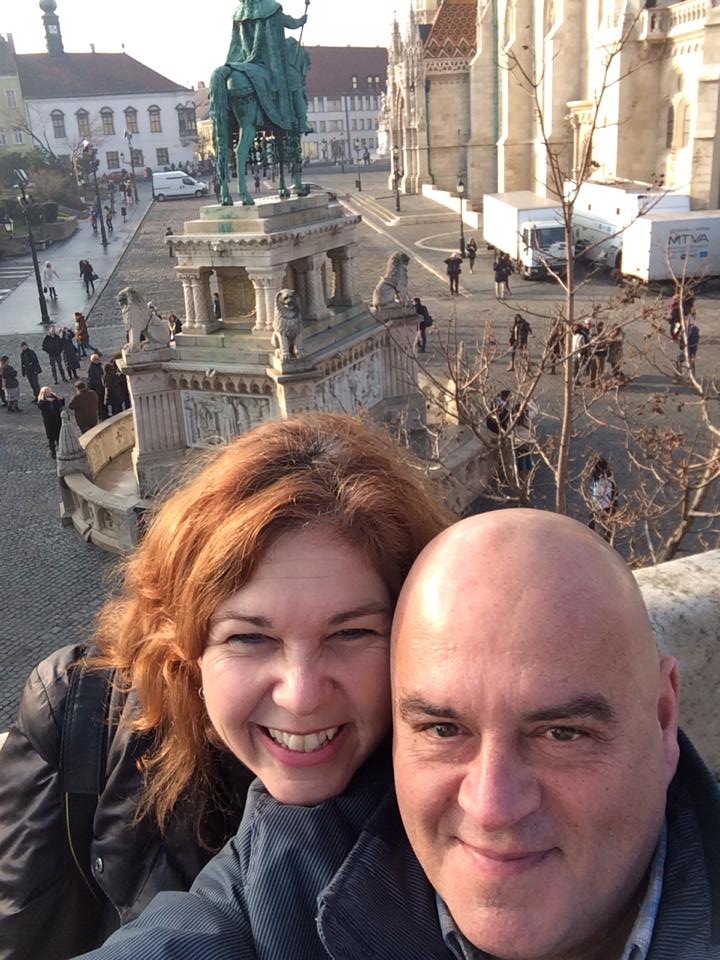 We zullen het gelijk maar zeggen… Het was een rustige week. Niks geen gekkigheid. Maar wel gezelligheid. Maandagochtend mooi op tijd vertrokken. Zo hebben voldoende tijd om nog ff te shoppen. Het vliegtuig was proppie vol. We hadden nog hoop dat we royaal konden zitten ,maar helaas …. M zat naast een Hongaar die al 28 jaar in de USA woont. Nou we zijn begonnen met praten en toen we gingen landen waren we nog steeds aan de praat. Aardige man. Als toegift kreeg M zelfs nog zijn stroopwafel :-). Na de koffer (jaja maar 1-tje) gevonden te hebben gingen we met een minibusje naar het hotel. Zenit Palace, midden in het centrum. We reden eerst in de buitenwijken van de stad echt een oostblok gevoel. Grauw, naar, mistroostig, veel kapotte huizen kortom niet iets waar je snel naar toe gaat verhuizen. Nou ff dacht M dat we het hotel niet gingen redden. Onze chauffeur, die best aardig reed, reed af op een zebrapad. Daar stak ook iemand over, die compleet uit zijn plaat ging. Ik ga niet herhalen wat ie zei… Haha dat gaat ook niet. Van dat hele Hongaars is nl. geen chocola van te maken. Maar goed zelfs een dove had in de gaten dat ie zo ongeveer verrot werd gescholden. We bleven nu stokstijf staan… M was ff bang dat ie naar het busje zou komen en z’n maten er bij zou halen, maar dat gebeurde allemaal niet. We zijn heelhuids bij het hotel aangekomen. Ingecheckt en de stad in. Omdat we lekker centraal zitten de winkelstraat door, cafeetjes in en uit en de kerstmarkt over. Kei gezellig. Een mooie mix van spulletjes en heeeeel veel vretvret. De plaatselijke lekkernij is de chimney. Op een ijzeren deelroller rollen ze een rolletje deeg. Die gaan ze dan uitrollen en vervolgens boven een open vuur tja hoe moet je dat noemen .. Bakken? Rijen dik stonden de mensen er voor. Tot op heden nog niet geproefd dus geen idee of het een aanrader is. Kortom een goed begin van Budapest.