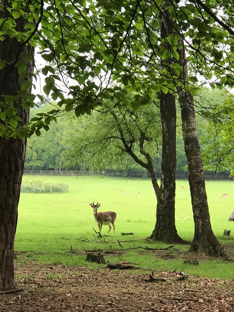 We hebben geluk. De vorige keer bestond de beestenboel die we onderweg tegen kwamen uit een schamele eekhoorn, een muis die we niet gezien hebben en de plaatselijke ganzen. Maar nu begon het gelijk goed. Herten overal. Ze stonden heerlijk te grazen en zo nu en dan het koppie omhoog en kijkend vragen aan: wat komen jullie hier dan doen. Dus een prachtige start. De route zelf is heel afwisselend. Via de achterkant van Het Loo en “het hertenkamp” loop je richting het oude Loo. Ook die tuinen zijn vandaag open. Dus die laten wij niet schieten. En voor we het wisten stonden we in de paleistuinen van het gewone Loo. Tja daar mochten we met ons kaartje niet in. Wij terug en via een andere afslag de tuin van het jachtslot het oude Loo bekijken. Na al die regen en lage temperaturen begint nu toch alles tot bloei te komen. De tuin ligt er dan ook prachtig bij. Het oude Loo overigens ook. Volgens mij ben ik hier nog niet eerder geweest. Het wordt een kort rondje want we moeten nog een km of 11.
