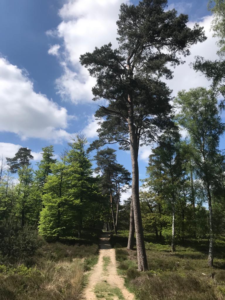 We pikken de witte paaltjes route weer op. We komen langs de begraafplaats van de dierenwereld van het kongingshuis. Je vindt er graven van onder andere paarden en poezen. Dan bereiken we het gedeelte wat vlak is en met veel ganzen en een stroompje meandert door het gebied heen. Dan komen we uit bij een grote vijver met een soort badhuizen. We zien een bankje en genieten van onze zelfgemaakte lunch. Het is nu lekker qua temperatuur. De ochtend begon toch nog fris. Dus de jas hadden we wel nodig. Nu kan hij los. Uitkijkend over het water, de schreeuwende eenden die ergens niet mee eens zijn kletsen wij er lustig op los. Na een klein half uurtje de spulletjes in de rugzak en weer verder. We waren inmiddels dezelfde eekhoorn als de vorige keer weer tegen gekomen (het was tenminste bij dezelfde boom) en de muisjes waren ook al gefotografeerd. Ik vind het volgende deel wat saaier. Ondanks een paadje voor met hele hoge bomen is het hier wat minder afwisselend. Maar het goede gezelschap maakt dit goed. Het wordt steeds warmer dus de jas kan ook uit. Na gebruik te hebben gemaakt van het buitentoilet was er ruimte om de laatste thee te nuttigen met de laatste boterham. We komen uit bij de uitkijkplaats van wilde zwijnen en warempel ze zijn er. Vorige keer noppes nada. Nu een hele familie met kleintjes. Wel heeeel ver weg. Maar we genieten er volop van. Inmiddels zijn er heren bijgekomen met fototoestellen met dikke teletoeters en we mogen even hun foto’s bekijken … aaaahhhhh prachtig. Dan nog het laatste stukje. Het glooit hier behoorlijk en het lijkt alsof het bos hier ouder is. Tussen de vele bosbessen, het prachtige groen, de prachtige blauwwitte luchten genieten we van de schoonheid. Dan komen we weer langs de stellage van houten balken. We ontdekken niet wat het is.