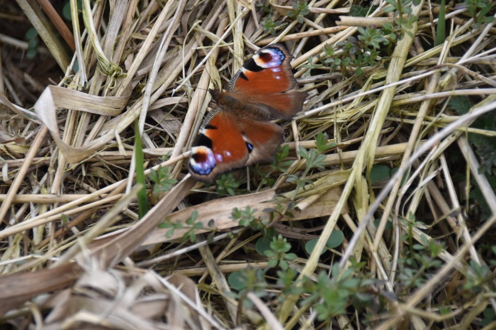 Dan lopen we de Oude Maden op. We hebben een flinke wind tegen. En trekker waait ons bijna van de weg af. Tot nu toe gaat het goed met de paaltjes. Maar dan gaan we bijna de bietenbrug op. Een eenzame fietser heeft ons ingehaald en we volgen hem hoe hij de wind trotseert. Dan zegt Har, we moeten hier in. Ik had niks gezien en het was (volgens mij 😊) ook niet echt duidelijk. Dus ik zeg, nou daar gingen we bijna de bietenbrug op. Har komt niet meer bij. Volgens haar was dat geen uitdrukking. We bakkeleien de komende kilometers over de uitdrukking. Dan lopen we weer het lange stuk langs het kanaal. Een vlinder ligt op ons te wachten. Hij blijft mooi zitten. Ik kan hem goed vastleggen. Intussen is google geraadpleegd en ja hoor de uitdrukking bestaat. Halverwege de veendijk nemen we nog even plaats op het bankje. Om een drankje te drinken. Sourcy cactus. Gatver. Niks voor mij.