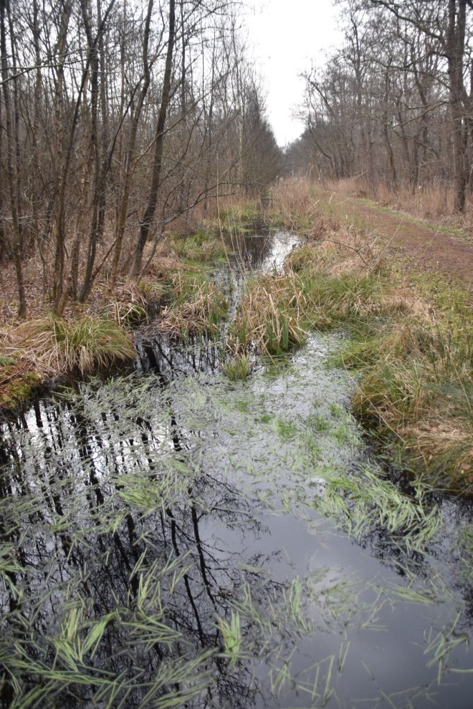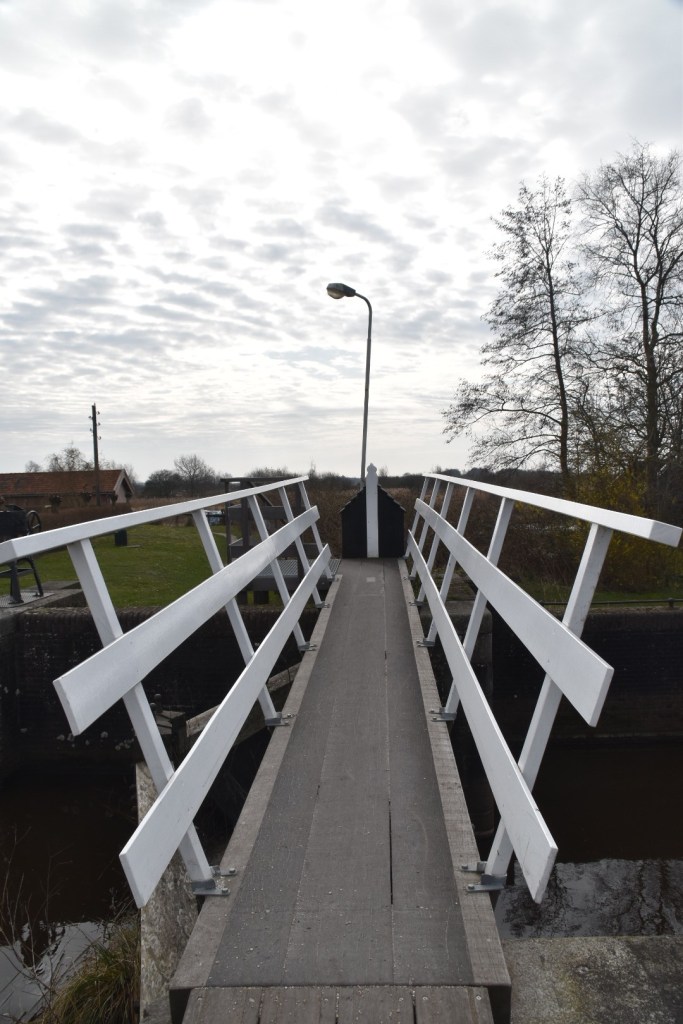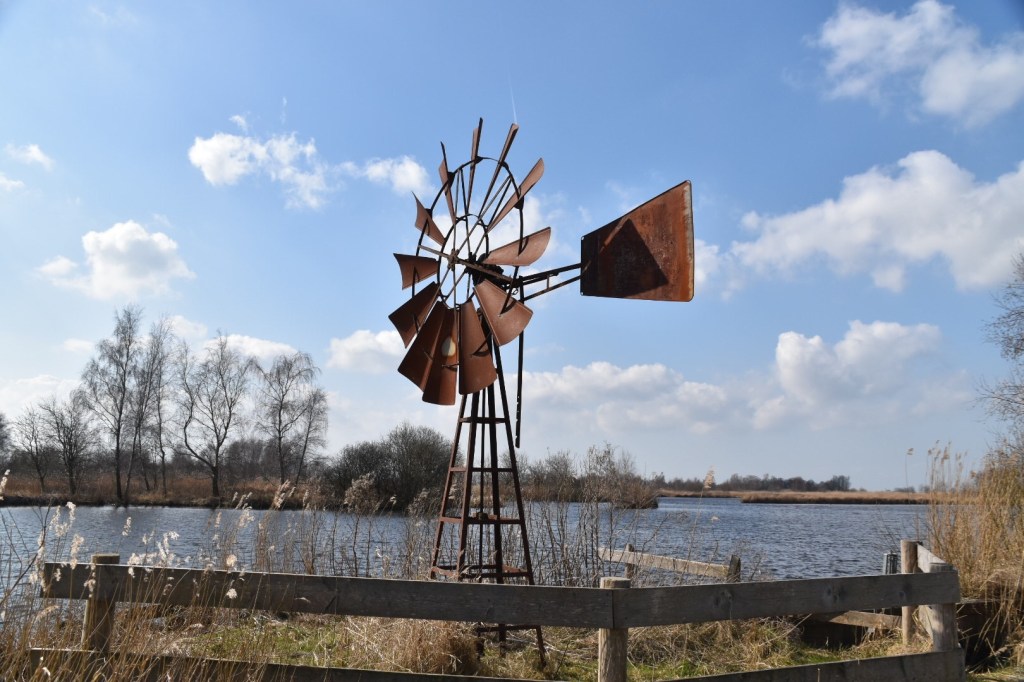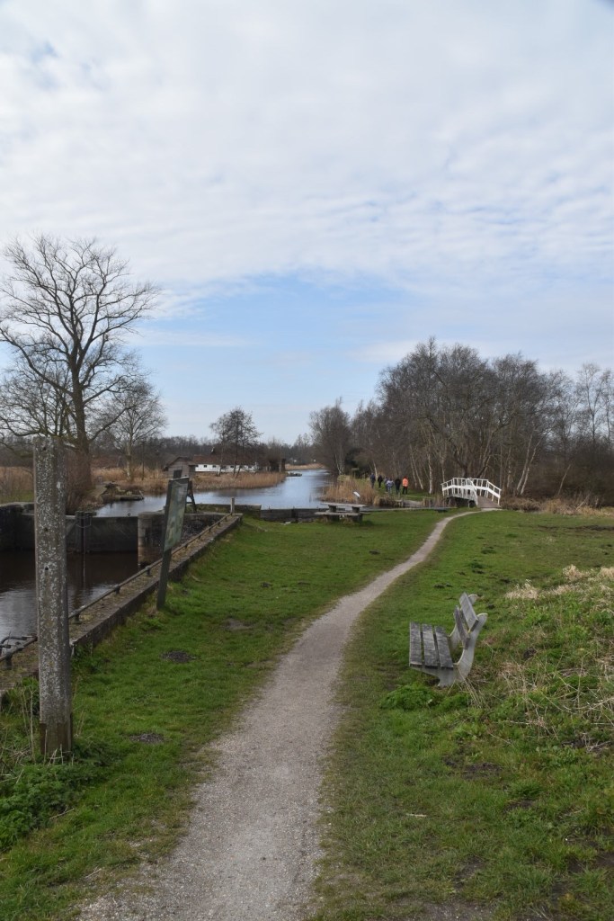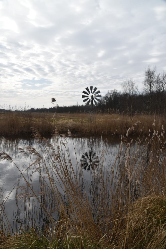 Het eerste stuk is prachtig. Het is wat moerassig. We lezen op staatsbosbeheer: Het gevarieerde landschap dankt zijn ontstaan aan turfwinning in de 19e en 20e eeuw, toen grote delen zijn vergraven tot petgaten en legakkers. Het huidige natuurgebied heeft hier zijn typische vorm aan te danken. Het is een waterrijk gebied. Allemaal slootjes die vol liggen. Het is koud maar helder. Dus het ligt er prachtig bij. Windmolens met reflecteren in het water. Het riet wuift mee. We spotten de eerste vogels. Prachtig. Op het volgende gedeelte bij het Brandemeer verwachten we nog veel meer te zien. We lopen over bruggetjes en zien een ooievaarsnest. Dan komen we bij de Schenesluis en het bijbehorende sluiswachtershuis. Het is gemetselde schutsluis – een sluis om schepen over te brengen van het ene naar het andere waterniveau – met een karakteristieke houten draaibrug uit 1914. De sluis werd gebruikt als verbindingsroute en voor de ontginning van de Rottige Meente. (van de website staatsbosbeheer).