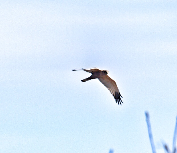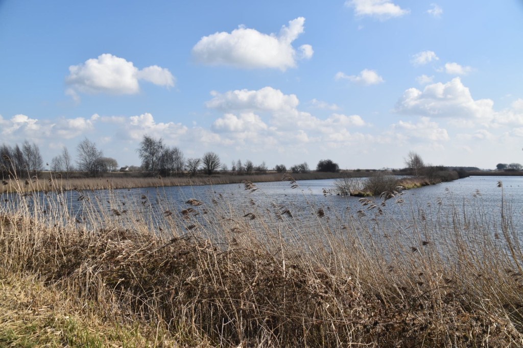 We lopen dan een kaal stuk langs het kanaal. Daar drinken we voor de eerste keer maar een bak koffie. Staand. Er zijn niet zo heel veel bankjes. Ondanks dat het kaal is (we lopen onder twee grote spanningsmasten) vinden we de omgeving niet vervelend. Dan komen we bij het natuurgebied Brandemeer. Nu op zoek naar de vogels. Verdorie we zien de smient, de kiekendief, rietgors, heel veel eenden man het is geweldig. Komt ook door de strak blauwe lucht waardoor alles er heel mooi uit ziet. We zitten nog even op een bankje met het uitzicht op de tsjonger. Tweede bakje koffie, dat verwarmt ons weer een beetje.