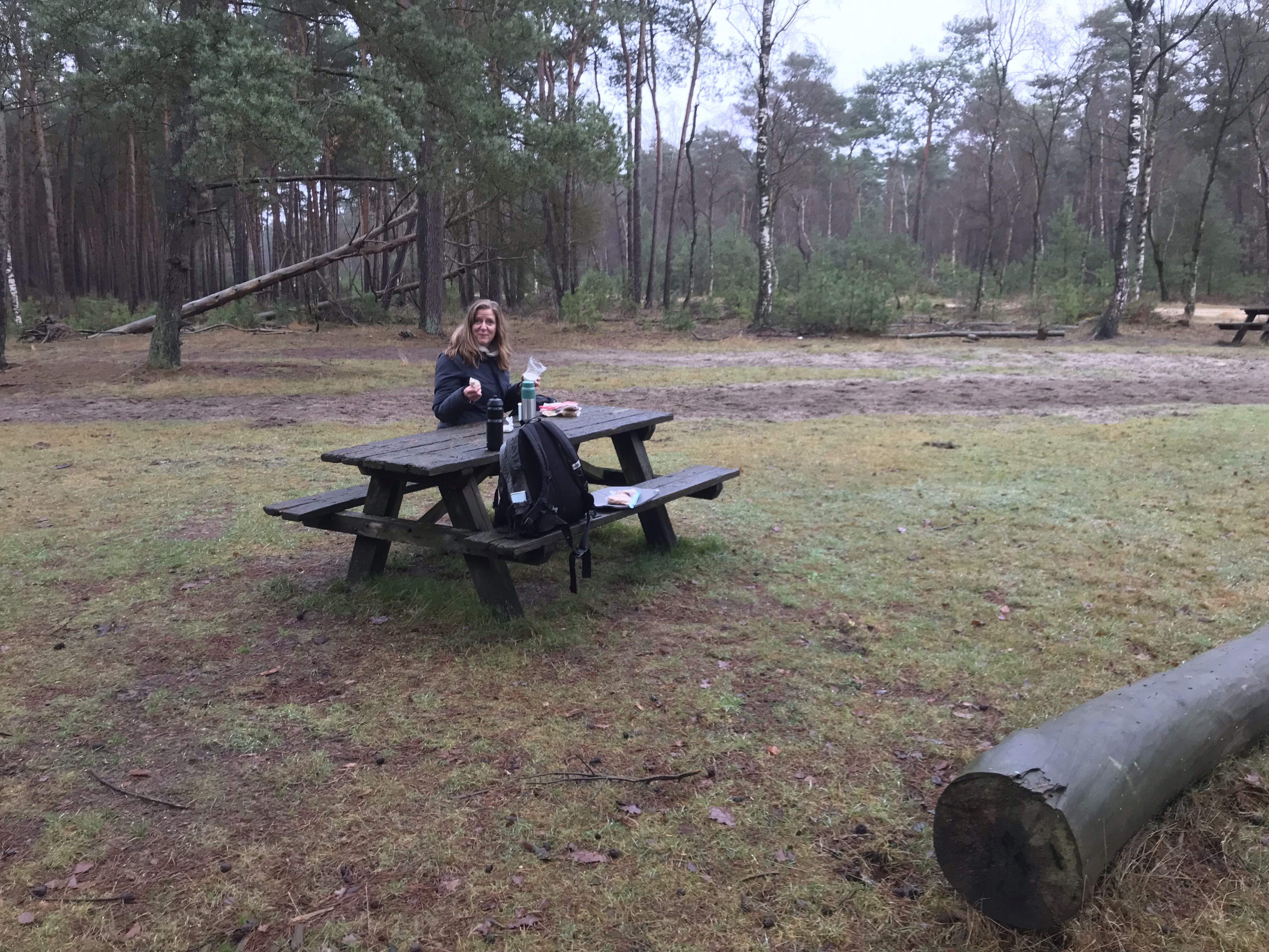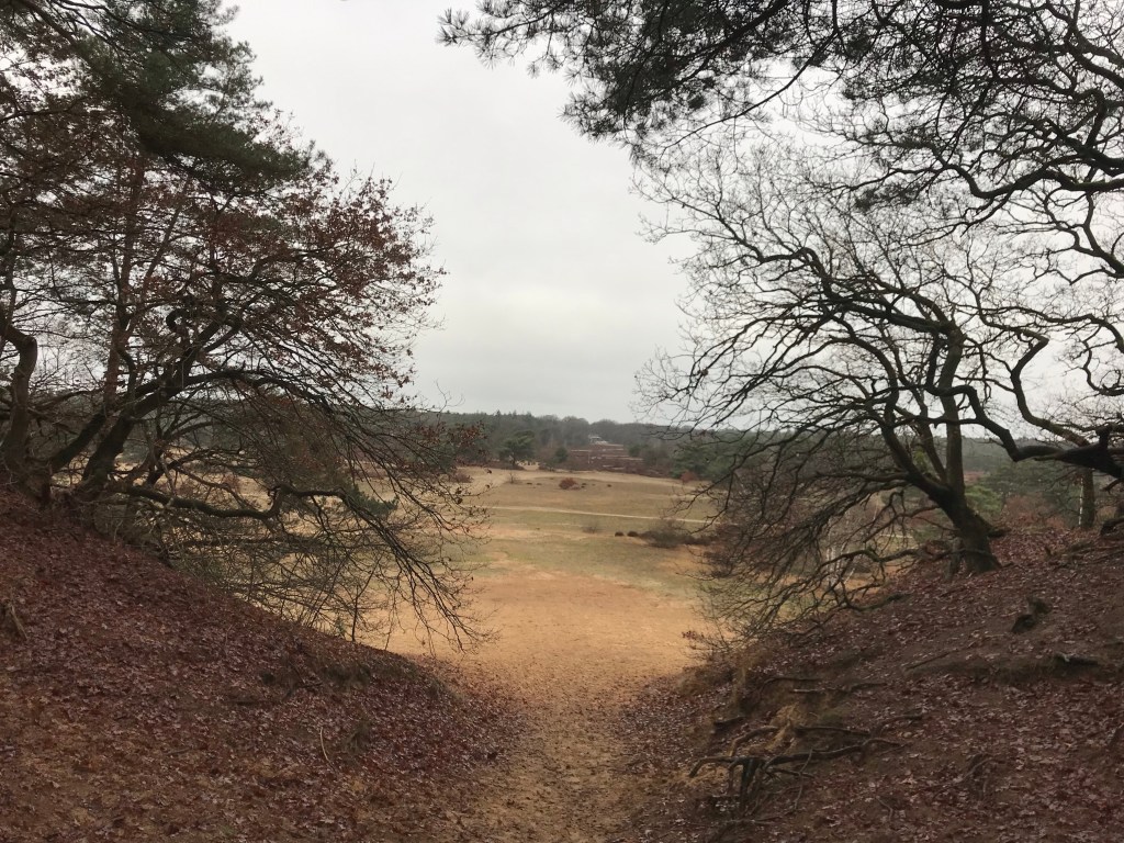 We hebben een mooi uitzicht op de zandverstuiving als we een bankje vinden. Even een bakkie koffie en genieten van het uitzicht. We zitten wel midden op de wind dus na het bakje koffie gauw doorlopen. We moeten dan de Arnhemseweg oversteken en komen bij de wije werelt uit. Laten we daar nu net vorig jaar in een huisje te hebben gezeten. Het pad vervolgt over het park. Dan komen we wat meer in de landerijen terecht. En wat accommodaties. Nu ik strava nog eens nakijk weet ik niet hoe we precies lopen maar we maken de verlenging. Maar dan gaat het mis. We lopen blijkbaar dezelfde kant weer terug. In het vervolg toch maar de app aan laten staan.