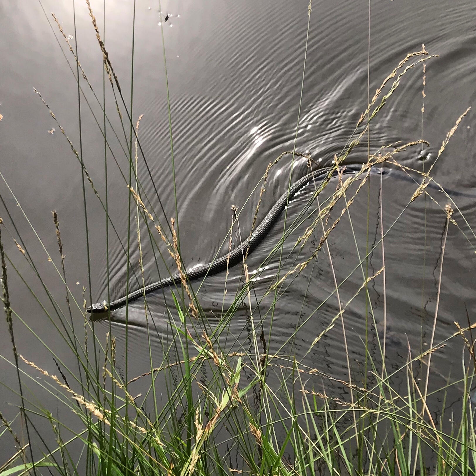 Na enkele kilometers komen we uit bij een vennetje. We willen ook wel even zitten. En daar zien we bankjes. Maar we zijn zo verbouwereerd dat we daar bijna niet aan toe komen. In het water zwemmen allemaal ringslangetjes. Die worden van links en rechts en van boven tot onder op de plaat vastgelegd. Ik ben er helemaal hyper van geworden. Volgens mij heb ik ze nog nooit eerder in het wild gezien. Manmanman wat een belevenis. We gaan toch maar weer verder. We hebben nl geen idee hoe ver we al op de route zitten. Ik heb te laat de strava aangezet.