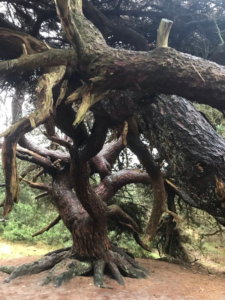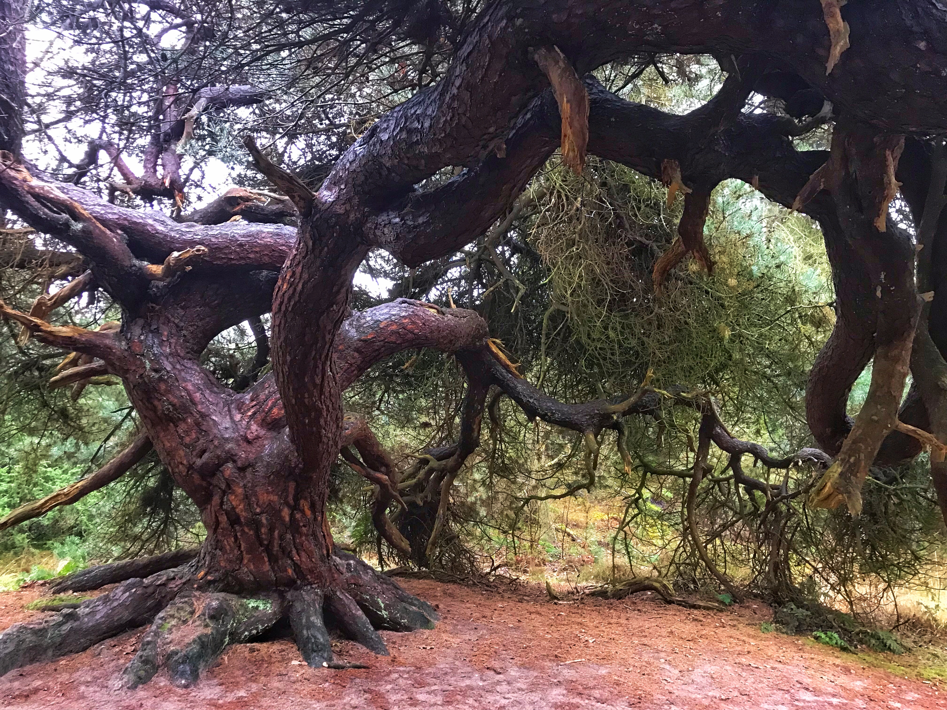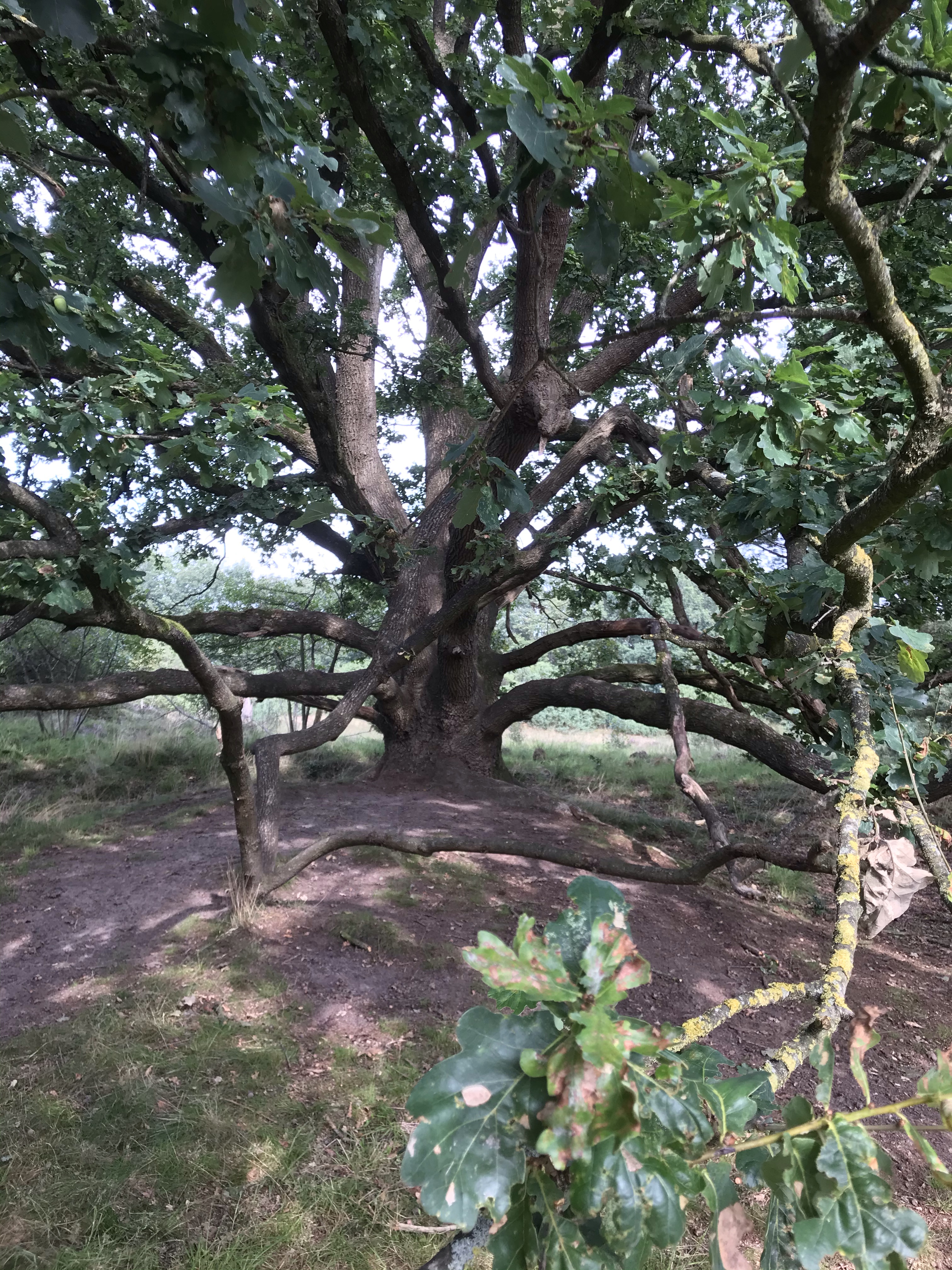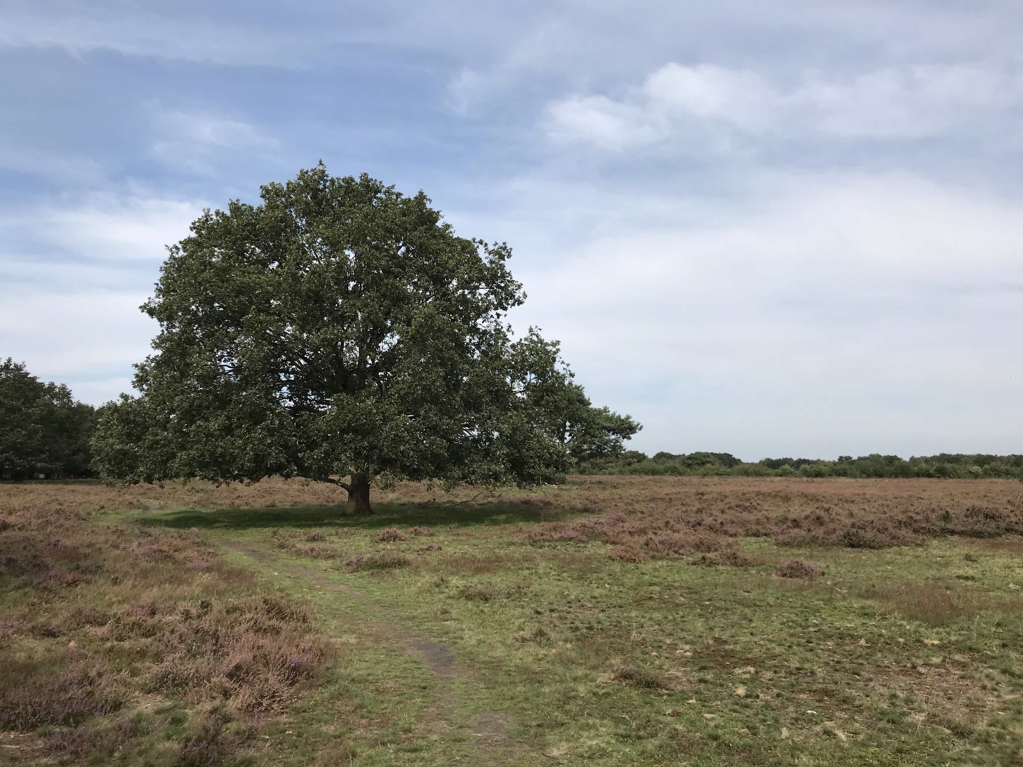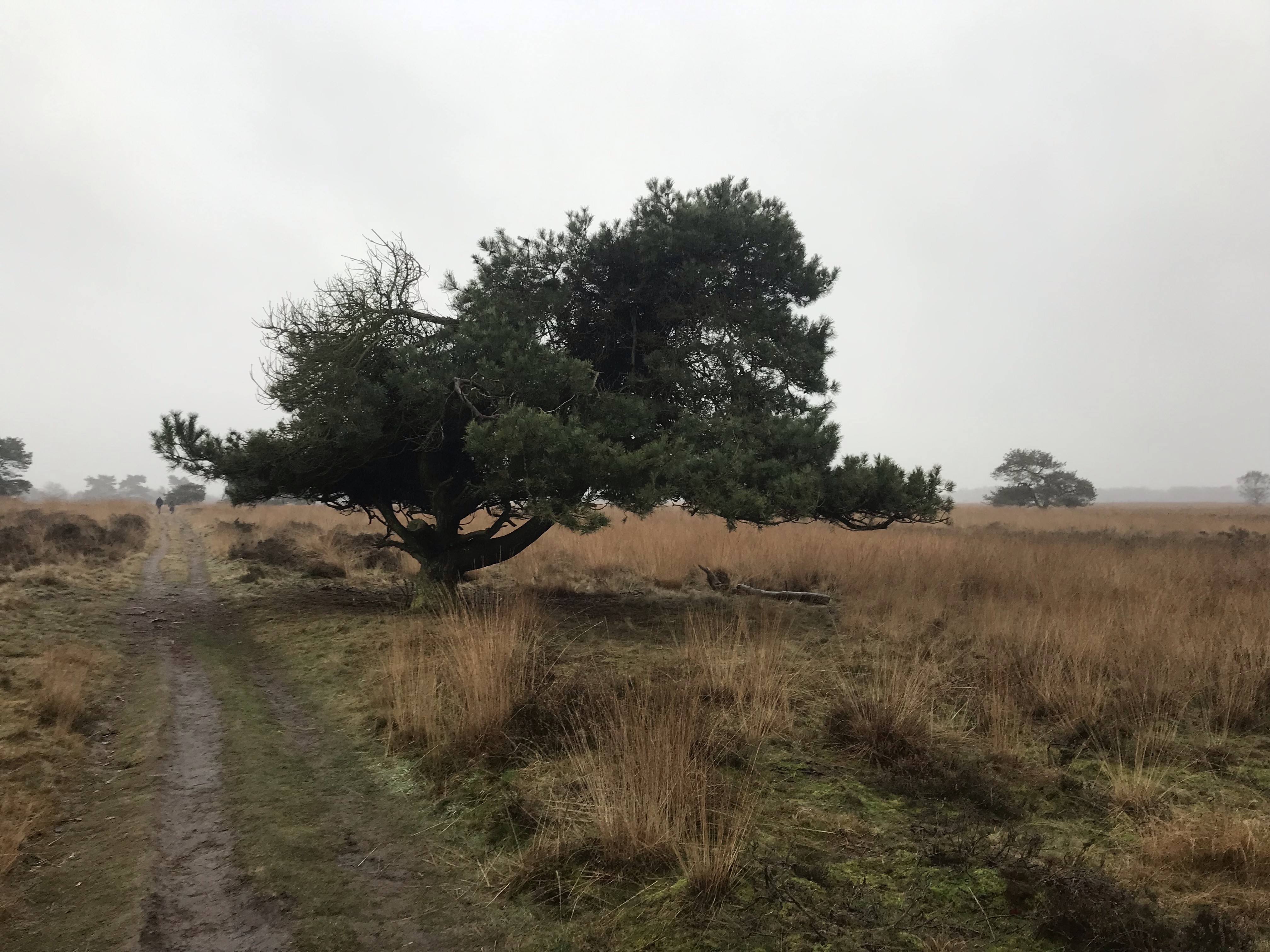 Het eerste stuk is ook prachtig om te lopen. Wel pittig. Omdat je door dat mulle zand loopt. Het is een beetje heuvelachtig. We lopen een “heuvel” waar we een prachtig vergezicht hebben. Ondertussen kletsen we er op los. Dan komen we langs een prachtige oude boom. De oude boom, grove den (Pinus sylvestris) is ruim 100 jaar geleden ook al gefotografeerd. Dus hij gaat al even mee. Het is dan ook een pracht.