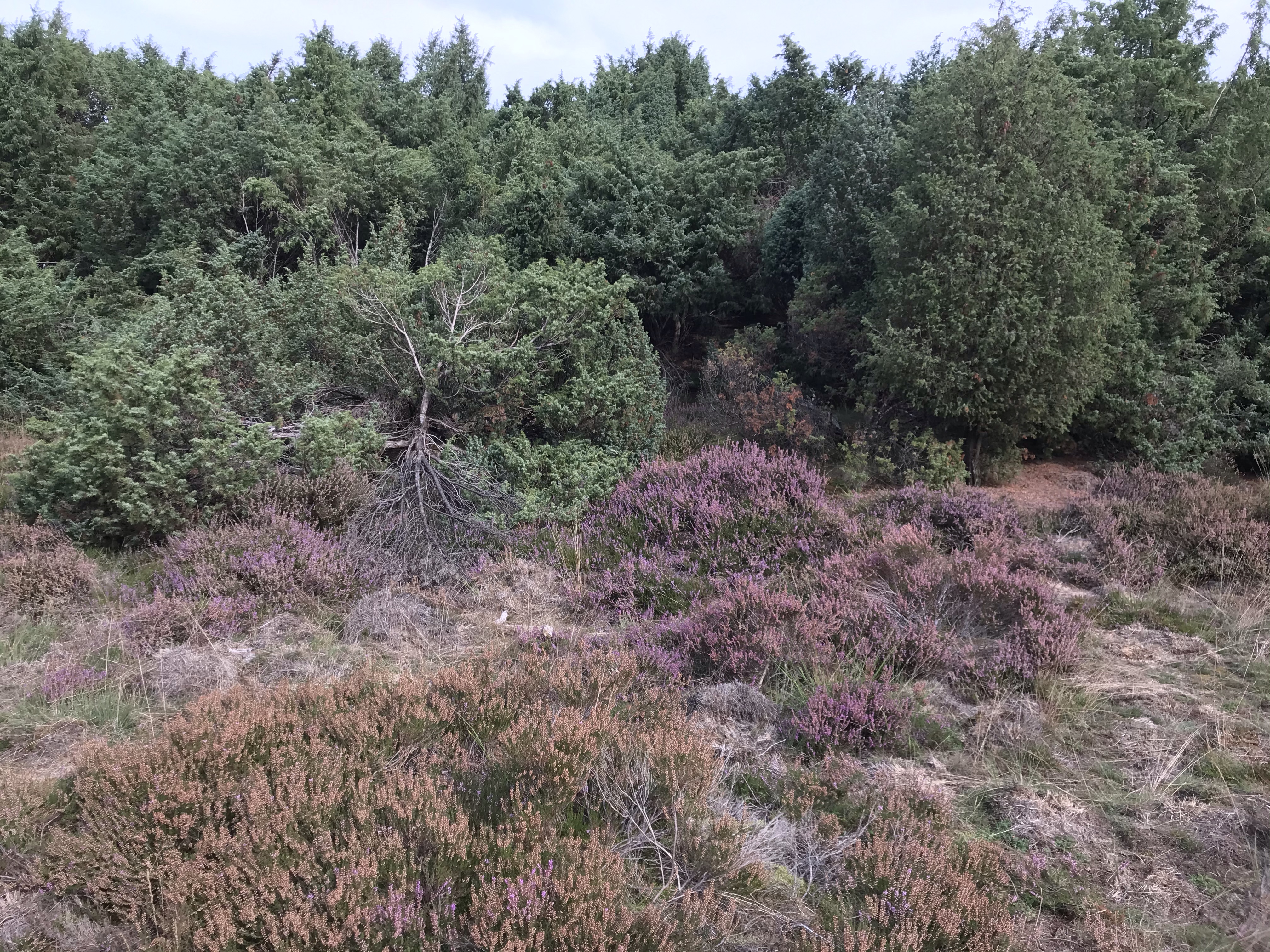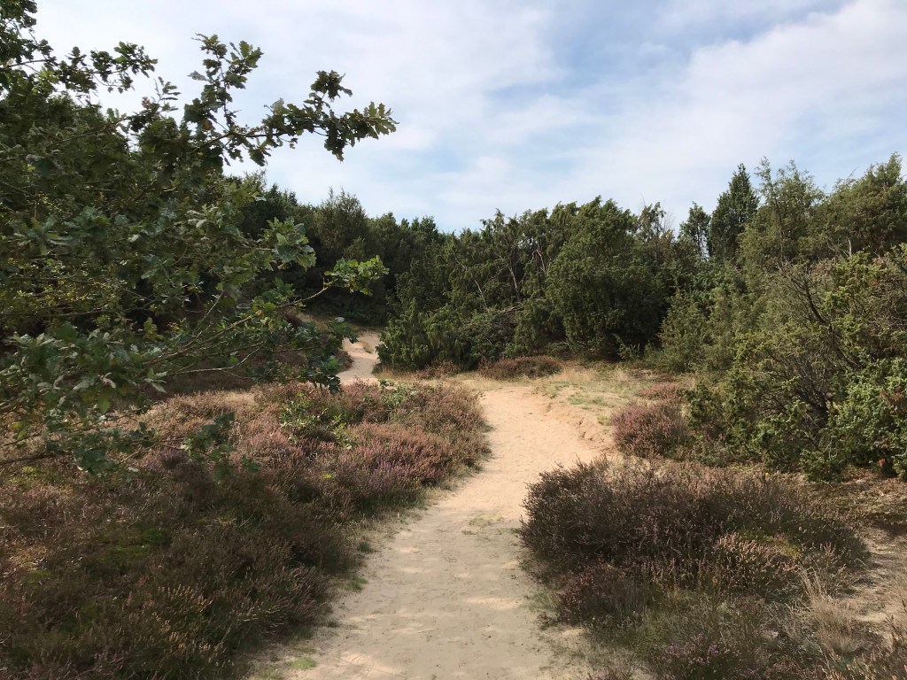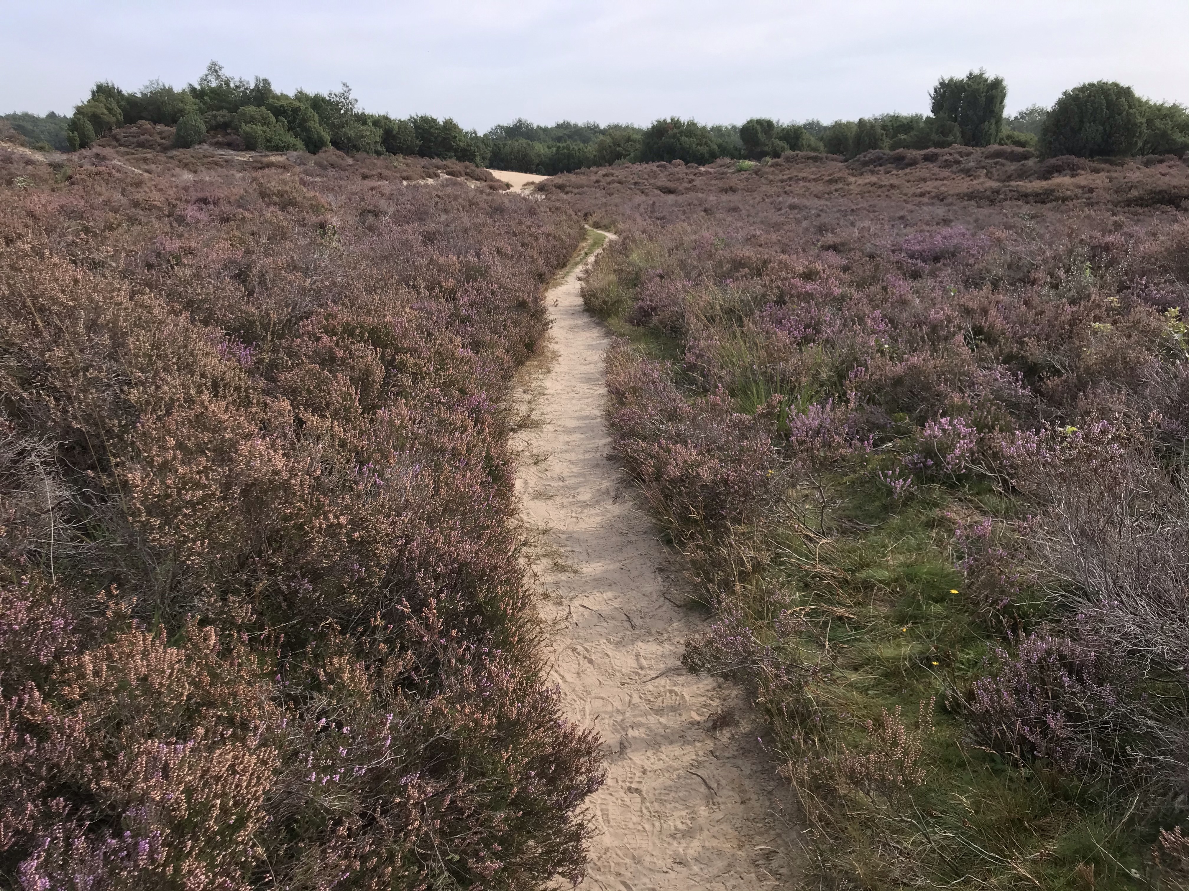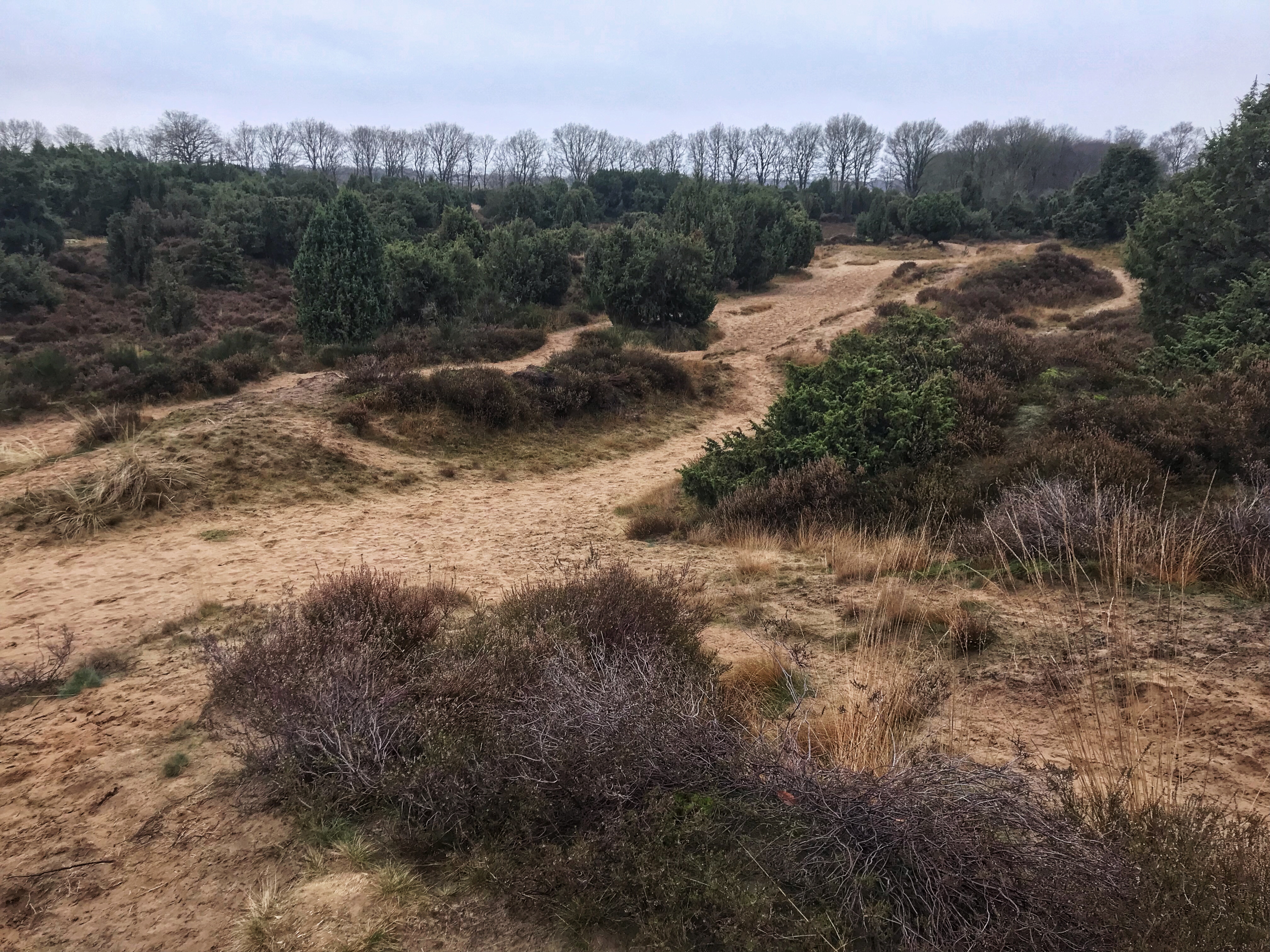 We starten. Je staat gelijk in het mulle zand en loopt langs de jeneverbesstruiken en tussen de heide. Een prachtig gezicht. Aangezien we in het najaar/winter lopen zien we donkere en groene bessen in de jeneverbes. De heide staat te wachten tot die weer mag shinen.