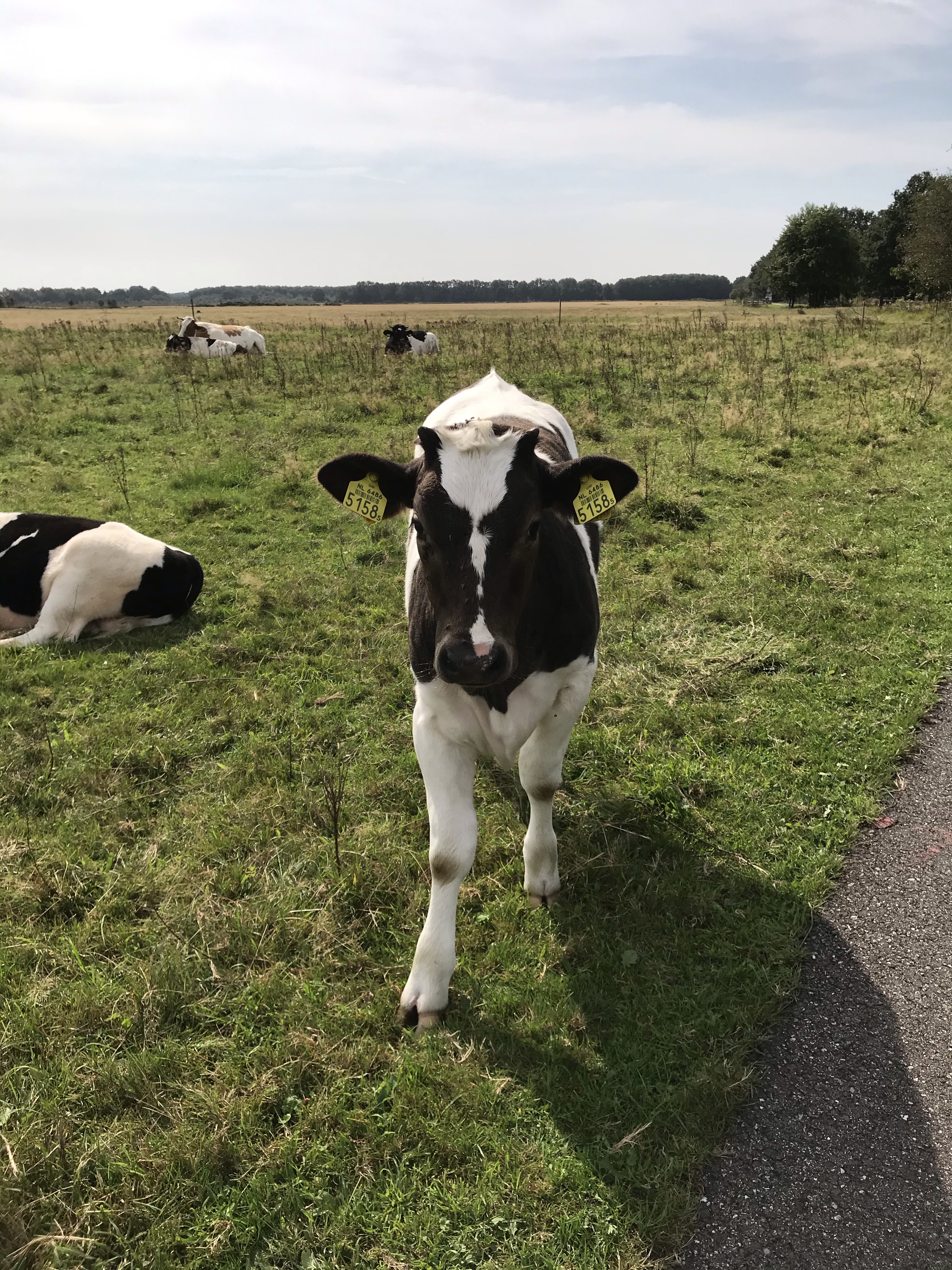 Op een mooie septemberdag loop ik met Harriët de Jeneverbesroute. Nu de 12 km. Er staat nog heide in bloei. De route is erg afwisselend en gaat langs het Balingerveld en Grooteveld. Het eerste gedeelte is hetzelfde als de kortere route. Dan lopen we over een stuk asfalt en komen we heidekoeien tegen. Ze liggen er prachtig bij. En ze blijven ook liggen. Ook niet onbelangrijk. Ze kijken eigenlijk niet op of om. We kunnen ze er dan ook mooi opzetten.