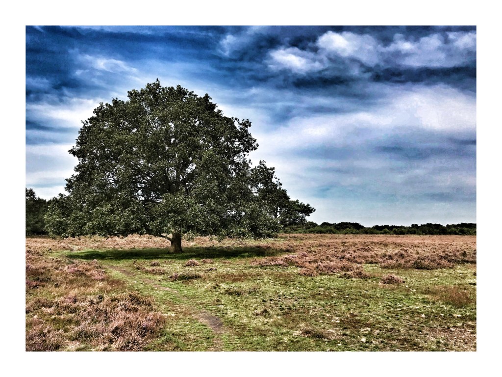 Dat is ook weer niet waar. Want we zien een prachtig gevormde boom midden op de heide. De lucht is blauw met wat wolken, de heide is nog wat paarsig en het gras is groen. Een echt kleurenpalet. Dan staan er ook nog wat Schotse hooglanders. We treffen het wel met al die dieren.