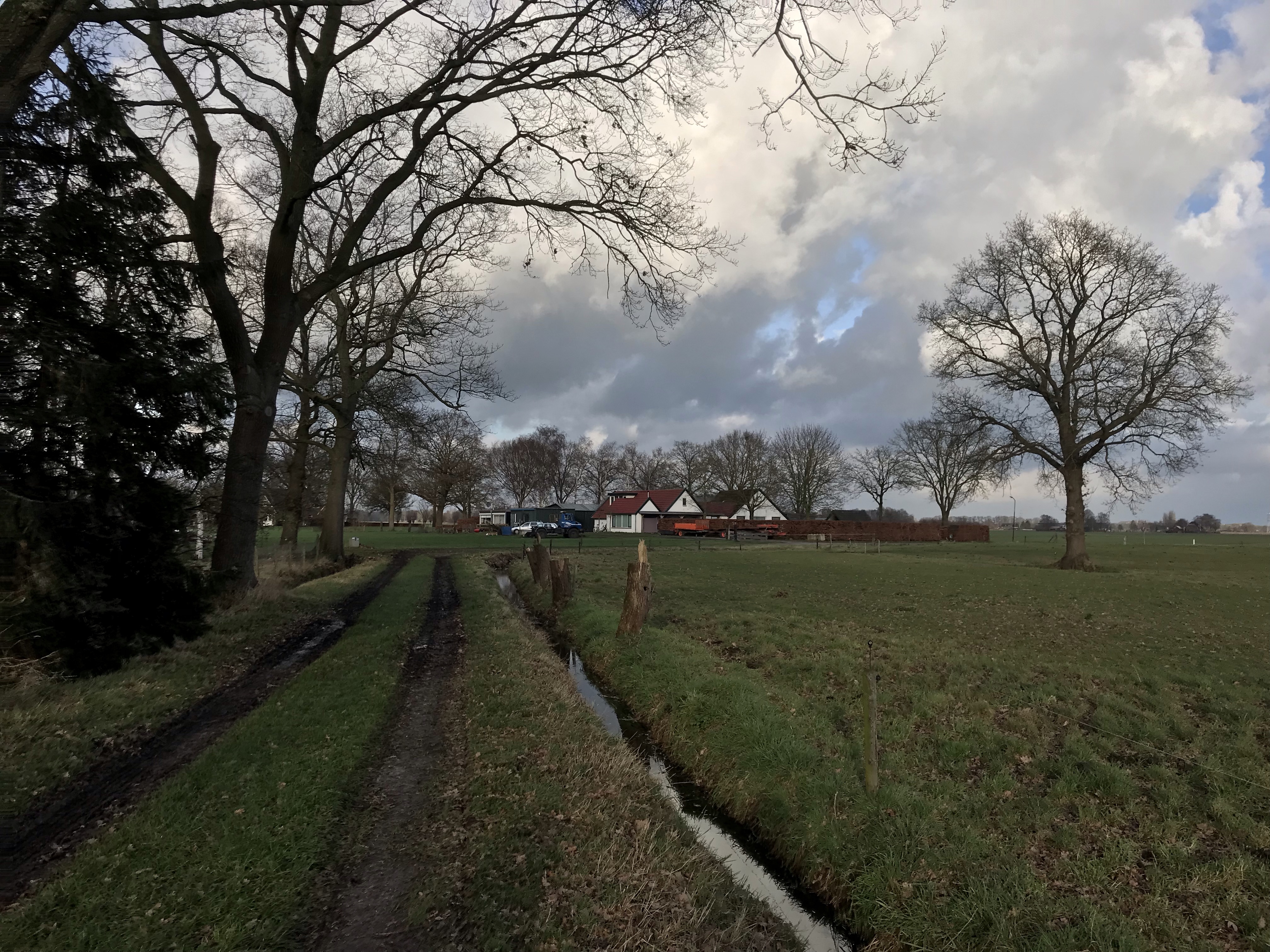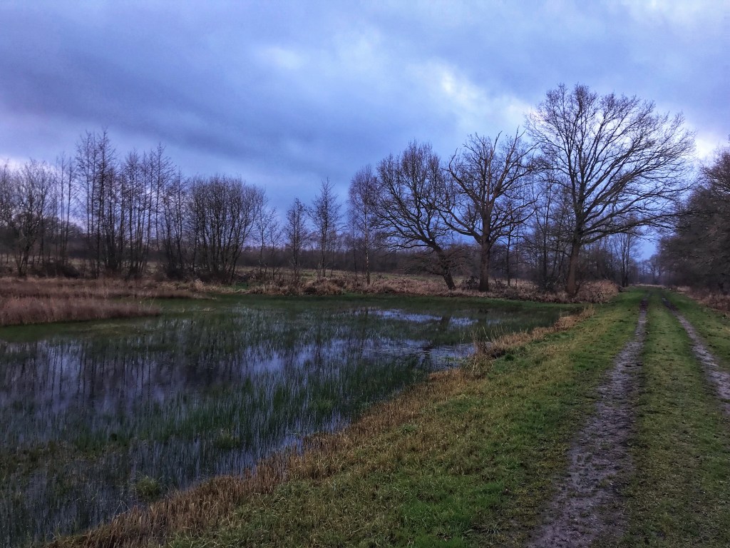 We lopen via landgoed Klarenbeek, wat ook gesloten is. We lopen langs de “vijver” De Wierd. Dan na een km of 3 (denk ik, maar kan ook wat anders zijn) komen we op een punt waarop de app signalen afgeeft. We kunnen de route verkorten of verlengen, net hoe je het ziet. Nou we gaan uiteraard voor de verlenging. Dan duiken we Lampenbroek in. Rond 1900 bestond het Lampenbroek uit orchideeënrijke blauwgraslanden, houtwallen, bosjes en vochtige heide. Als wij het lopen is het nat. Heel erg nat. Wel een prachtig gezicht. Maar wel heel erg drassig en zompig. We glijden regelmatig bijna uit en staan met de gehele schoen in het water. De eerste keer gillen we nog. En eigenlijk de derde, vierde en vijfde keer ook. De zesde keer vinden we het niet meer zo leuk. En of we nu links of rechts van het “pad” lopen het blijft nat. We zijn blij als we deze exercitie met minimale kleerscheuren doorlopen. De modderspetters zitten tot aan de onderbroek maar dat is een kwestie van wassen.