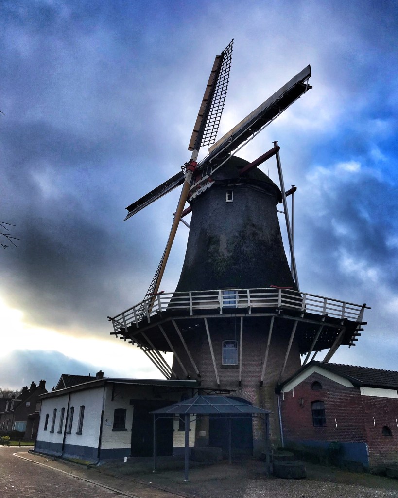 We lopen via de molen terug naar de parkeerplaats. En achteraf mooi op tijd. Want de eerste druppels vallen uit de lucht. Vlug schone schoenen aandoen en lekker warm worden in de auto.