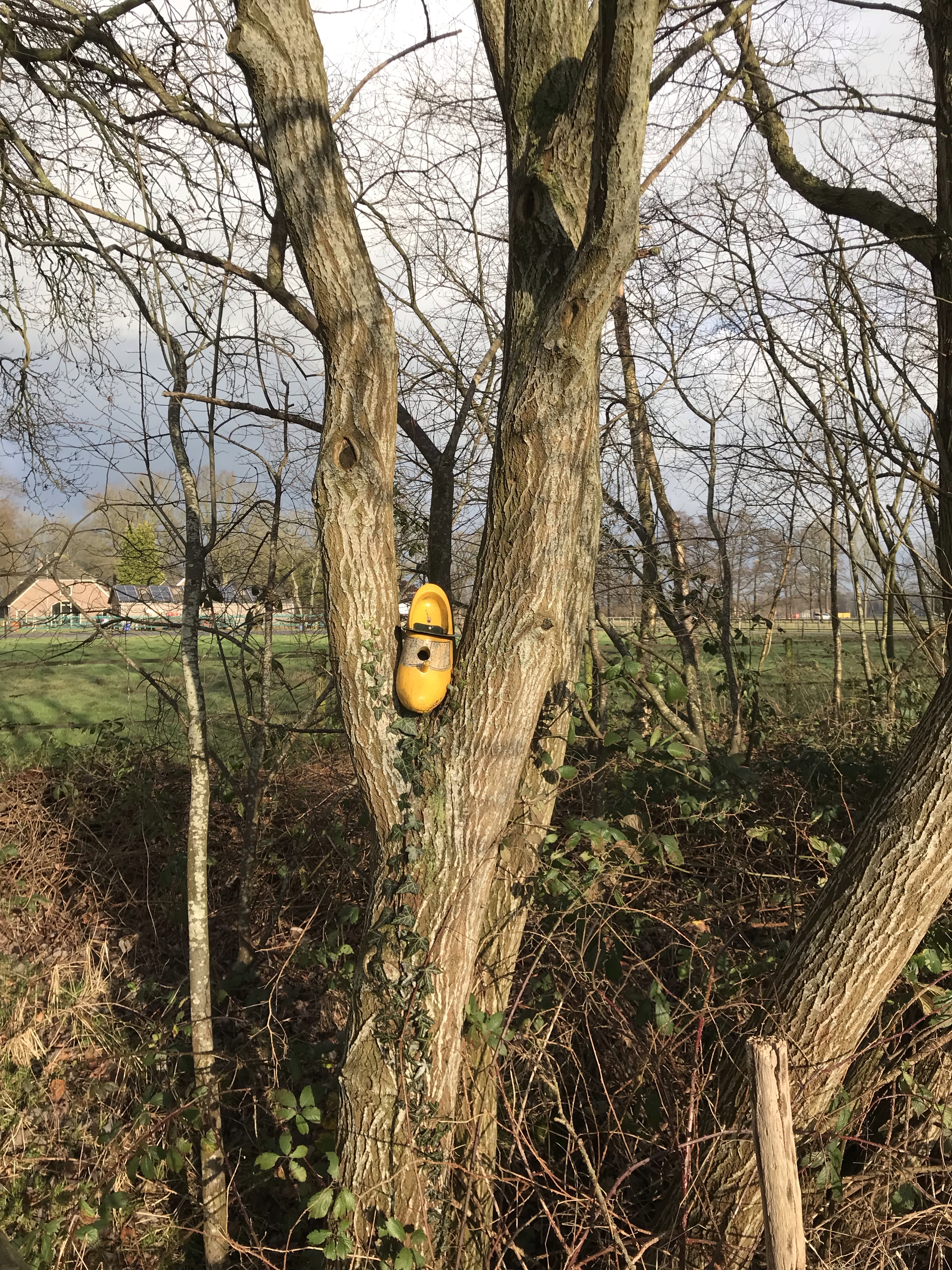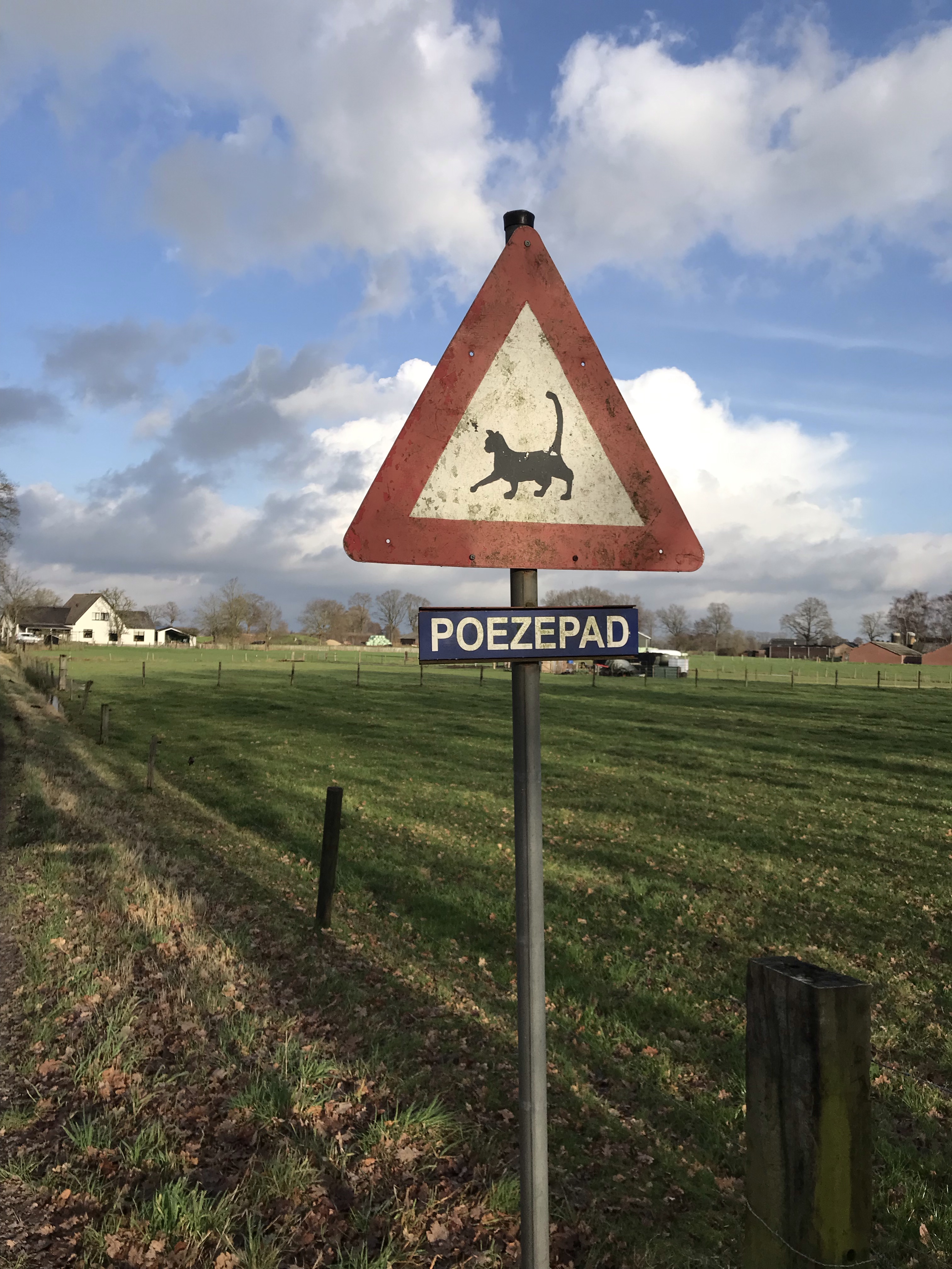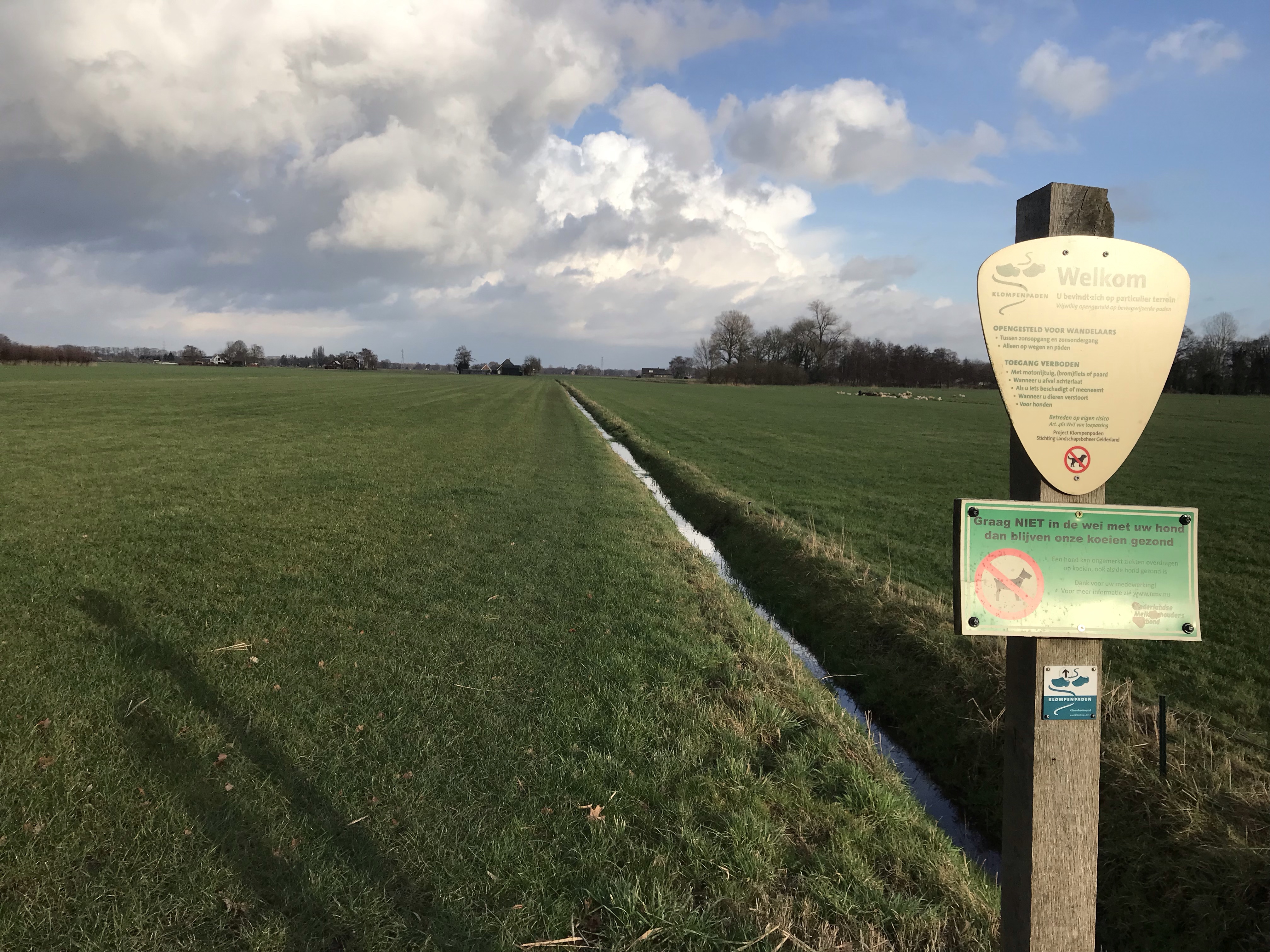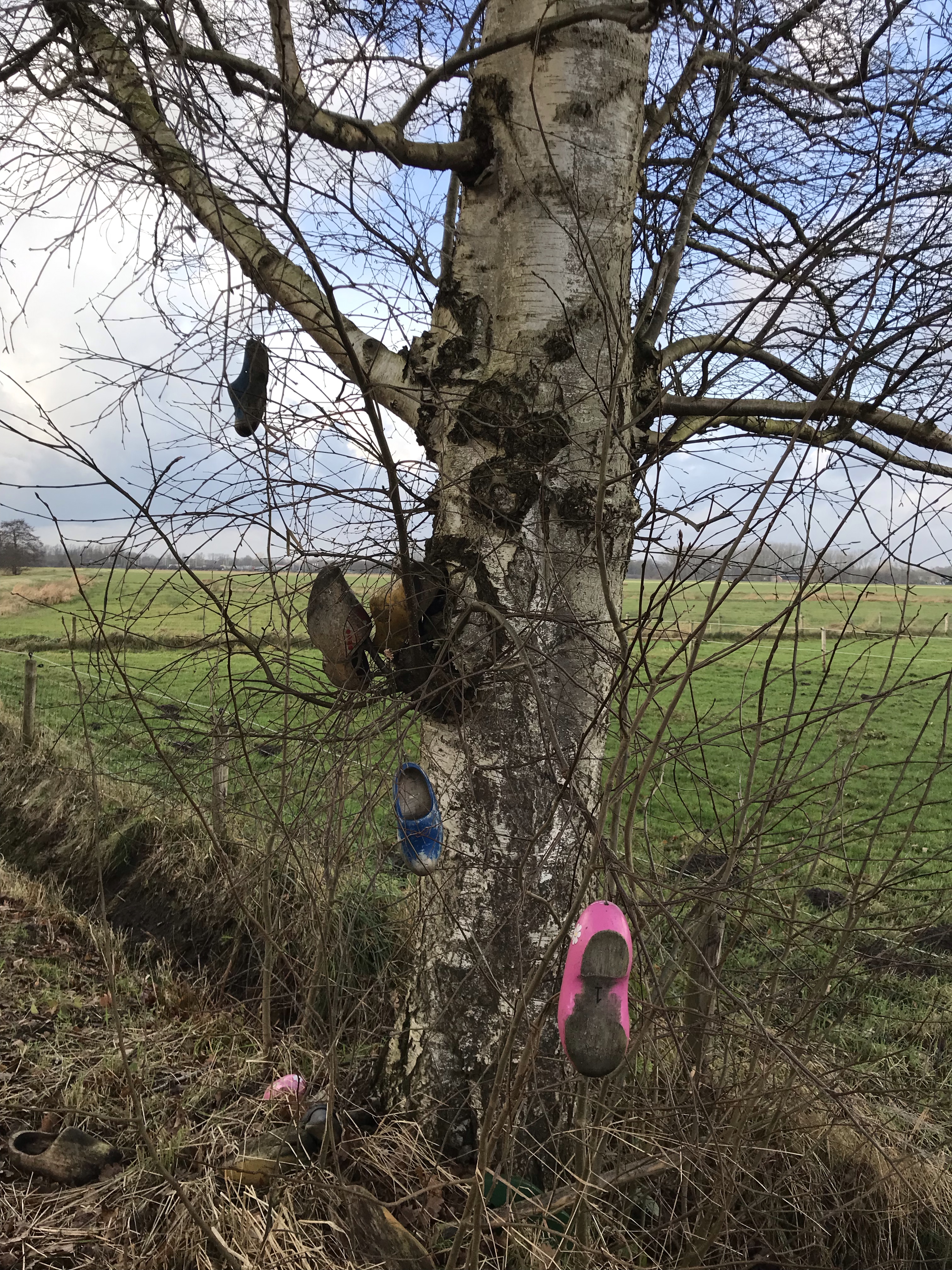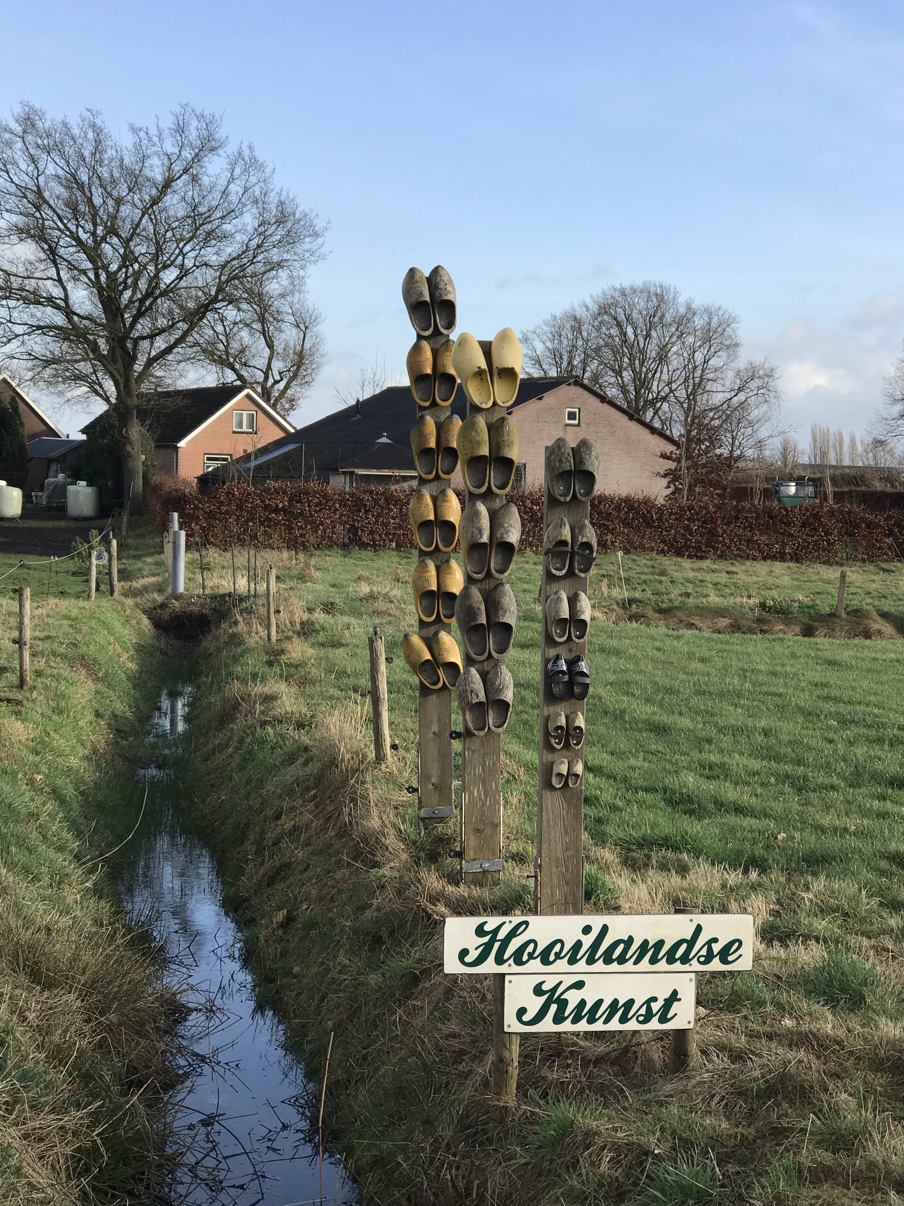 Over het algemeen loopt het nu wat makkelijker. Wel nog door de weilanden maar zo immens drassig als het eerste stuk wordt het gelukkig niet meer. Het is een hele open route. En op zich niet onaardig. Maar persoonlijk voor mij had er wel iets meer afwisseling in mogen zitten. Ze hebben het wel leuk aangekleed. We komen langs bomen met klompen en langs Hooilandse Kunst (ook klompen). We lopen langs het poezenpad, maar komen geen poes tegen.
