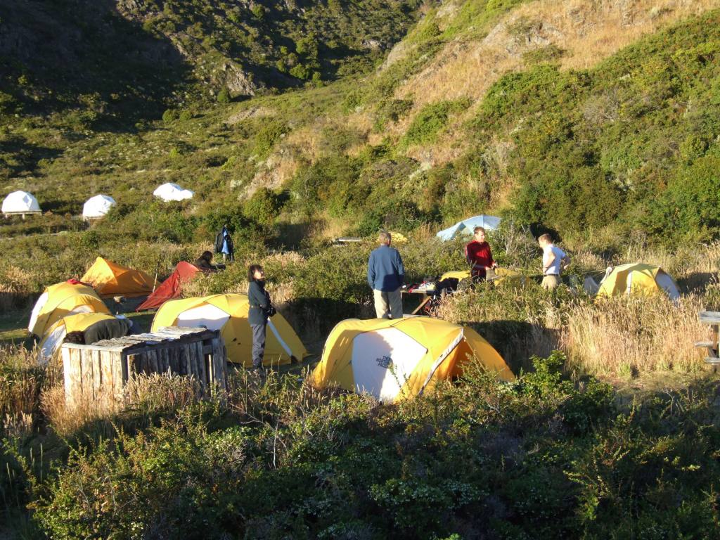 Maar tjonge wat was het een gedoe. En dit was nog maar dag 1 we gingen nog 2 dagen lopen….. Maar de andere dagen was ik weer aan de beterende hand dus ik heb gezellig mee gedaan. Het was zwaar maar heeeeel erg mooi. O ja en daar sliepen we dan in tentjes. Nou ik had een slaapzak waar ik dus van geen meter in paste. Een matje waar alleen mijn linkerbil op kon rusten en als ik languit in de tent ging liggen stak mijn kop buiten boord!!! Dus echt super (haha). Ik heb de 2e nacht van slaapzak gewisseld met Geertje die was een stuk ruimer en daar kon ik me in keren en zo en heb ik dan ook heerlijk geslapen, want je bent zo moe van het lopen en alle indrukken. De tweede dag van het lopen hebben we maar een kleine route gedaan naar de Grey gletsjer maar we zijn niet helemaal naar het eind gelopen. De 3e dag zijn we naar de French Valley gegaan. Na het eerste uitzichtpunt kon je nog verder, we zijn met 7 man doorgelopen. Wederom prachtig, maar ja we moesten ook weer terug…. denk dan aan 5 uur lopen over hellingen en dalen. We waren ´s ochtends om 8.30 uur weggegaan en we kwamen om 19.30 uur weer terug. Met de tenen los in de schoenen! Maar we hadden wel weer een prestatie neer gezet.