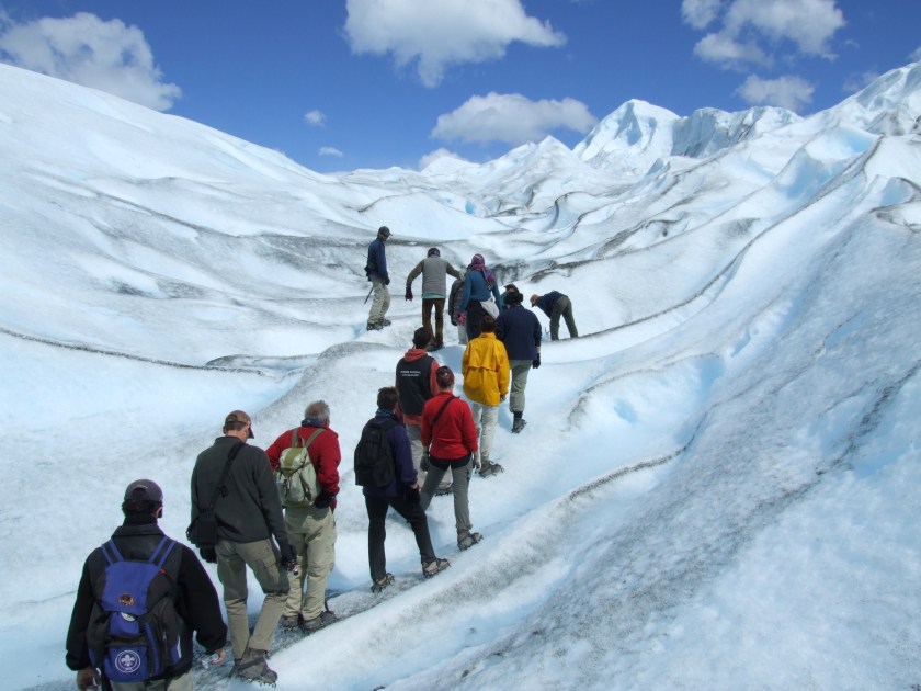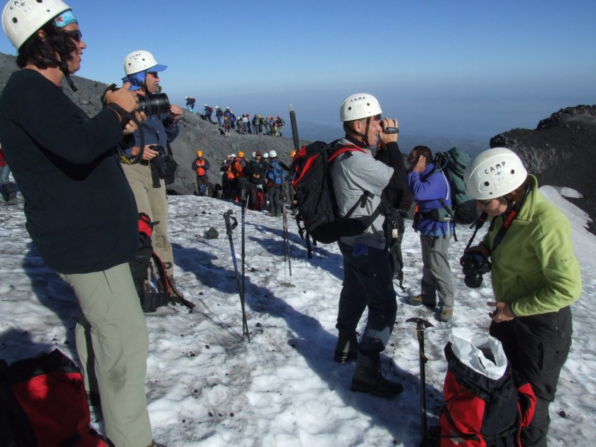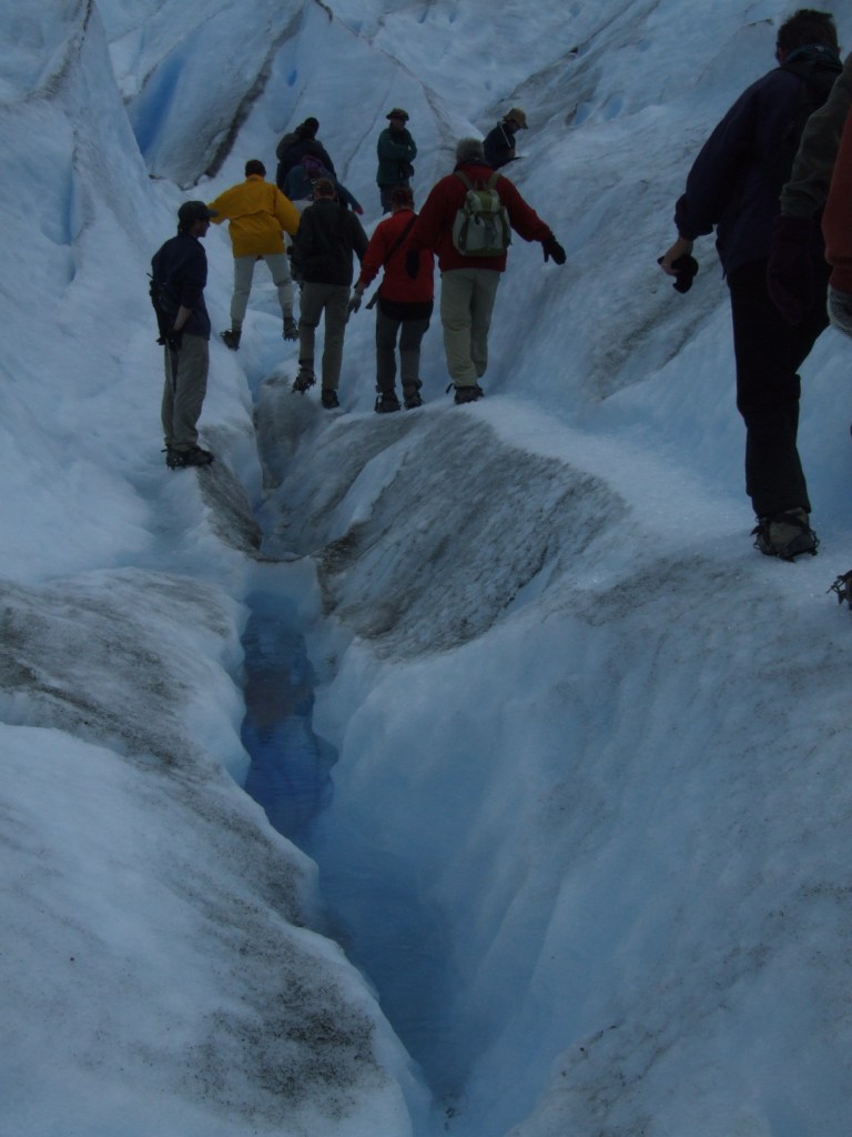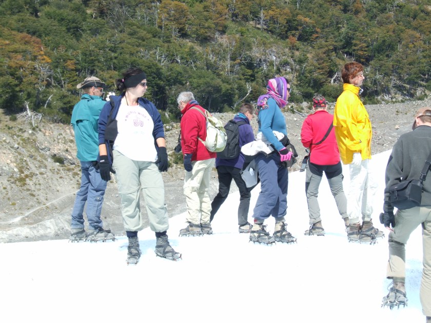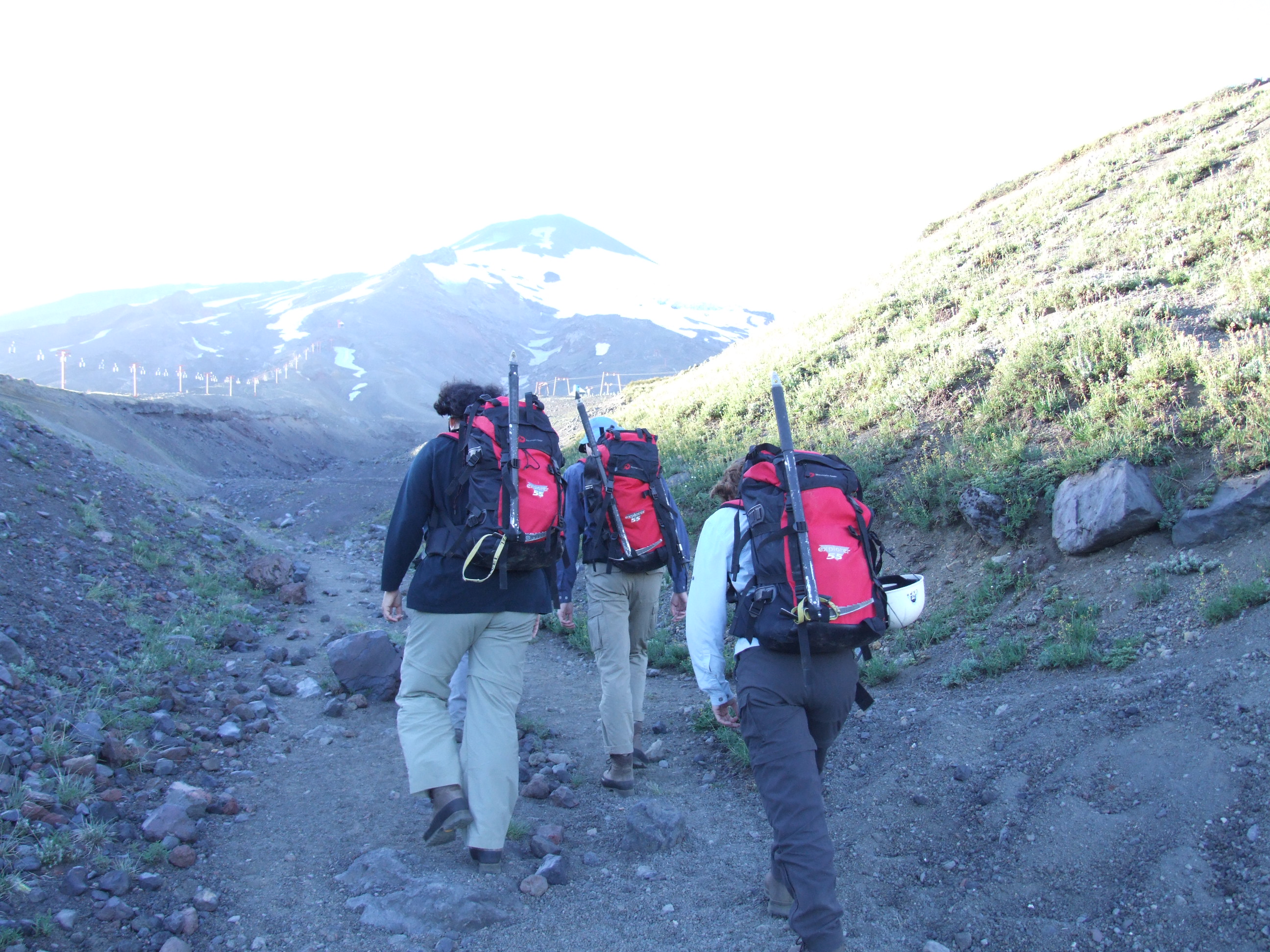 Om 6.45 uur aan t ontbijt… is hier goed. Dit keer geen broodje met jam, maar zowaar een pannenkoek en broodje kaas. In Argentinië is al het eten zoet… de broodjes, de koffie je kan het zo gek niet bedenken of er zit suiker in. De yoghurt is gezoet. Maar hier in Chili is het duidelijk anders. Maar goed we vertrokken dus om 7.15 uur, nou ja iets later. Want Geertje had de klok verkeerd gezet, in Chili is het tijdsverschil een uurtje minder dan in Argentinië… die lag dus nog heerlijk te ronken. Maar uit bed getrommeld en onze hele uitrusting mee bestaande uit: een paar schoenen (die waren ietsjepietsje te groot), een windjack, handschoenen, een kol, een broek, beenbeschermers, ijzers met scherpe punten, een zitvlakbeschermer (zal vast anders heten, maar dat weet ik niet….) ik geloof dat ik alles zo wel heb. De rit die ons naar de vulkaan bracht duurden ongeveer een half uurtje. We zijn met zn 5-en, Geertje, Annemarie, Hub, Gertjan en ik. >Eerst gaan we met een kabelbaantje naar boven (scheelt een uurtje of 1,5 om te lopen) Kabelbaantje wordt onder je gat geduwd dan word je als het ware gelanceerd en dan gaan met die banaan. Ik zat naast Gertjan en wij maar keuvelen…. vastgeklemd aan de zijpaal, en de rugzak die je voor moest houden, geen touwtje voor je buik en dus vooral niet naar beneden kijken, want we hangen denk ik toch wel zo´n meter of 10 boven de grond. Achteraf vond iedereen eigenlijk de kabelbaan toch wel een ietsjepietsje eng… maar ja dat is achteraf 🙂
