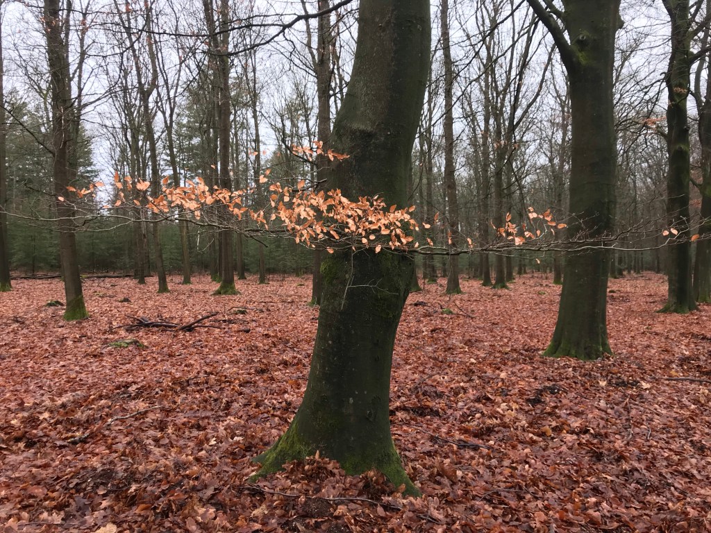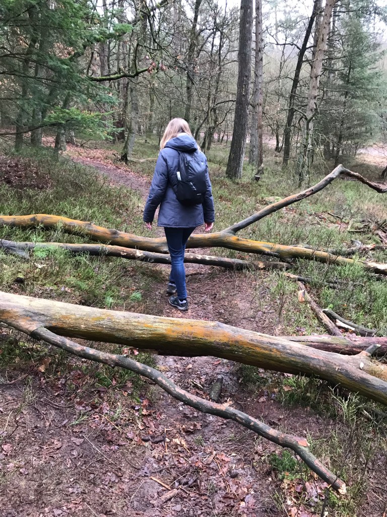 We wandelen vrij snel langs de douglassen die zijn aangeplant in 1918 en het zijn de oudste douglassen van de Loenermark. De naaldbomen zijn minstens 30 meter hoog. Ze zijn majestueus. Blijkbaar wroeten hier veel zwijnen maar die komen wij niet tegen. We lopen langs grafheuvels en trimbanen. Ik zag overigens alleen de picknicktafel. Maar we liepen zo snel dat ik de attributen om te trainen niet heb gezien. Waarschijnlijk zal dit selectieve waarneming zijn 😊.