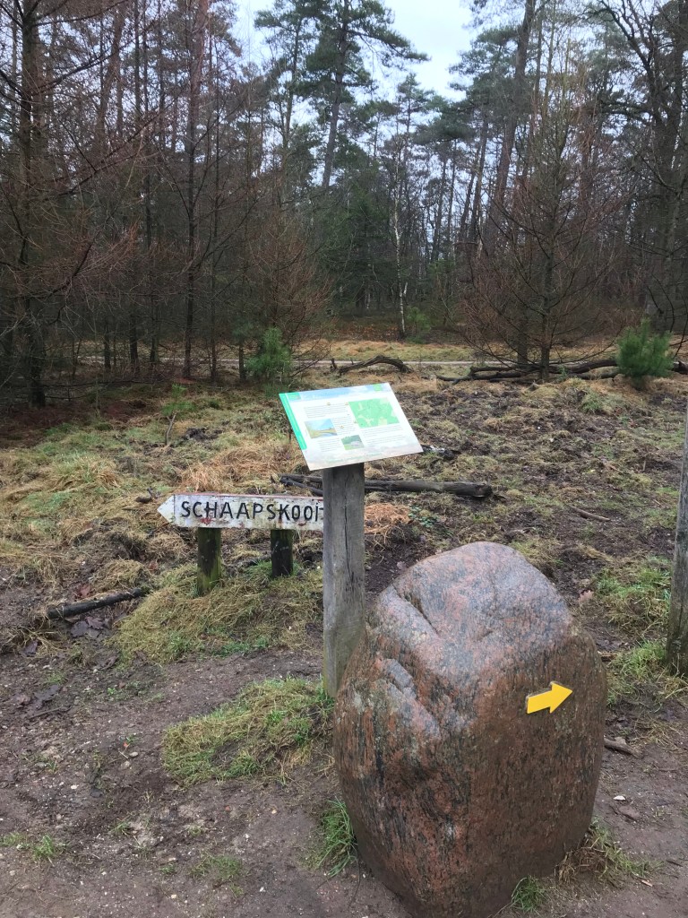 We komen onderweg niet zo heel veel mensen tegen. Op de parkeerplaats was het best wel druk. Maar eenmaal in de bossen zie je ze niet meer. Dat komt waarschijnlijk ook dat we voor de langere route hebben gekozen. Want als we bijna bij het einde van de route komen, wordt het ook drukker. De gele en de witte route komen samen en gaan richting de Schaapskooi. Hier overnacht een grote kudde Veluwse heideschapen, die overdag met de herder naar de heidevelden van de Loenermark trekt. Deze oude traditie is na een onderbreking van een aantal jaren in 1993 in ere hersteld. Jaarlijks worden er in de schaapskooi vele lammetjes geboren. Uiteraard geen lammetje gezien. Niks was op stal en de route was deze dag niet langs de onze.