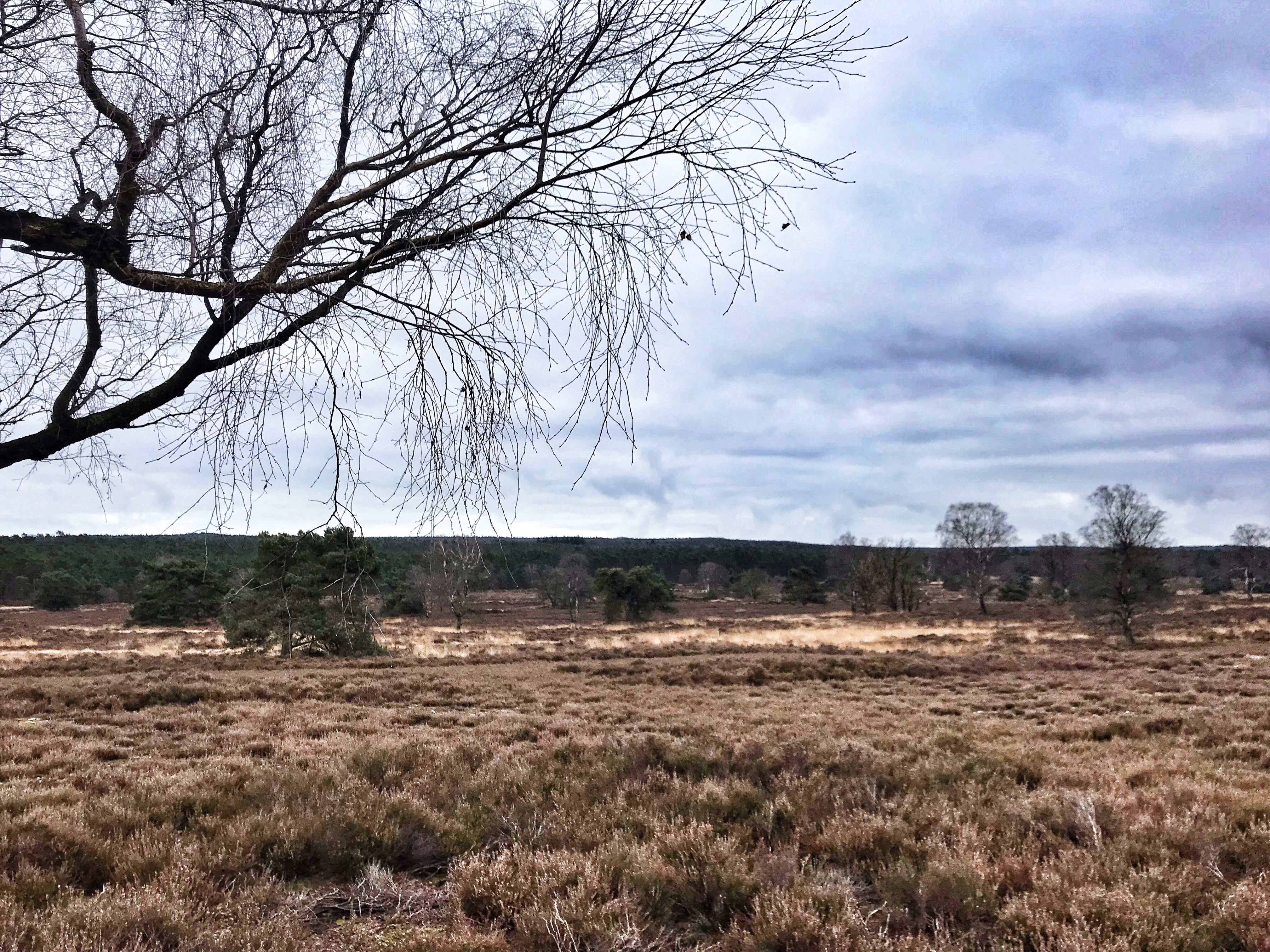 Deze keer heb ik ook weer wat meer foto’s genomen. Want ondanks de saaie luchten zijn er prachtige (ver)gezichten. Dan staat er een boom alleen op de heide te pronken. Of een boom met een soort afdakje van bladeren. Ook de bomen die naast het vennetje staan weerkaatsen mooi in het water. Kortom overal moois op ons heen.