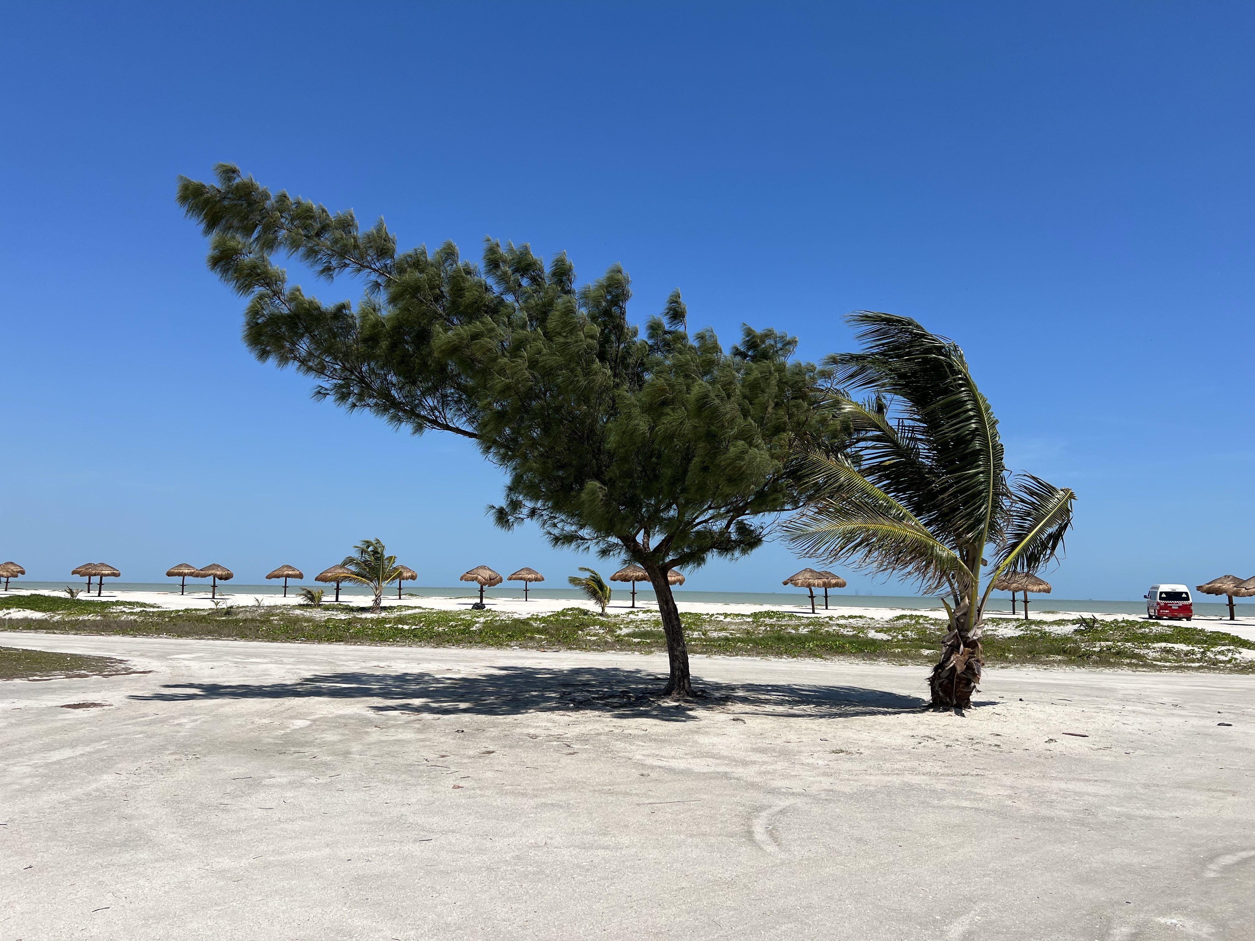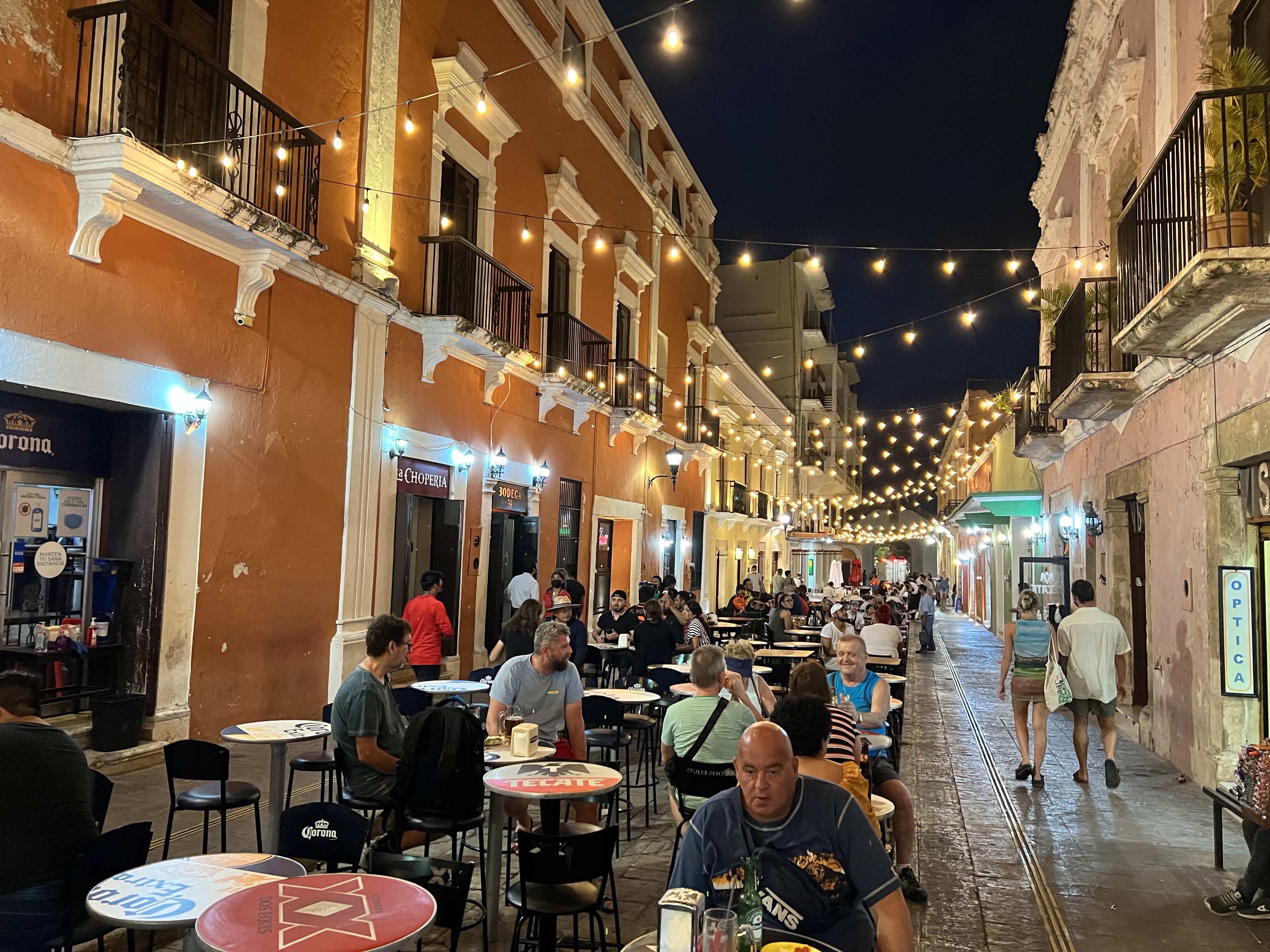 De andere dag gaan we wandelen langs de boulevard. Toen we gisteren Campeche binnen reden zagen we aan het begin wat restaurantjes zitten. Het doel was om daar naar toe te lopen. Vol goede moed beginnen we te lopen. Iet al te snel want het is immers warm. De malecón, zoals de boulevard hier heet, is prachtig aangelegd. Fietsers en wandelaars, ieder heeft z’n eigen baan. De laan meandert langs de kust. Echter … je komt voor de rest ook niks tegen. Behalve zo hier en daar een standbeeld. Maar je kan niet even ergens uitrusten of even een watertje kopen. Naast de boulevard is de autoweg, 4 baans, en daarnaast zijn dan wel winkels. Of een heel winkelcentra. Maar daar ga je voor je gezelligheid ook niet zitten. Na een km of 4 wordt het leuker. Er liggen bootjes, heel veel pelikanen en ander gevogelte. Dus volop fotograferen en dan loop je zo heel wat meters verder. Uiteindelijk is het bijna 6 km voor we bij de tentjes zijn. En dan wil iedereen je natuurlijk hebben. We pakken de eerste de beste. Eerst de dorst lessen want we hebben een leren lap gekregen. Het is hier minder gezellig. Dan nog even 3 etablissementen verder. Ik neem limonada. Die kun je in verschillende smaken krijgen. Normaal is met limoen (soms wel heel erg zure bek) maar nu neem ik naranja. Prima! We laten ons met de taxi terugbrengen en duiken het zwembad in! ‘S avonds weer naar calle 59 om daar wat te drinken en te eten.