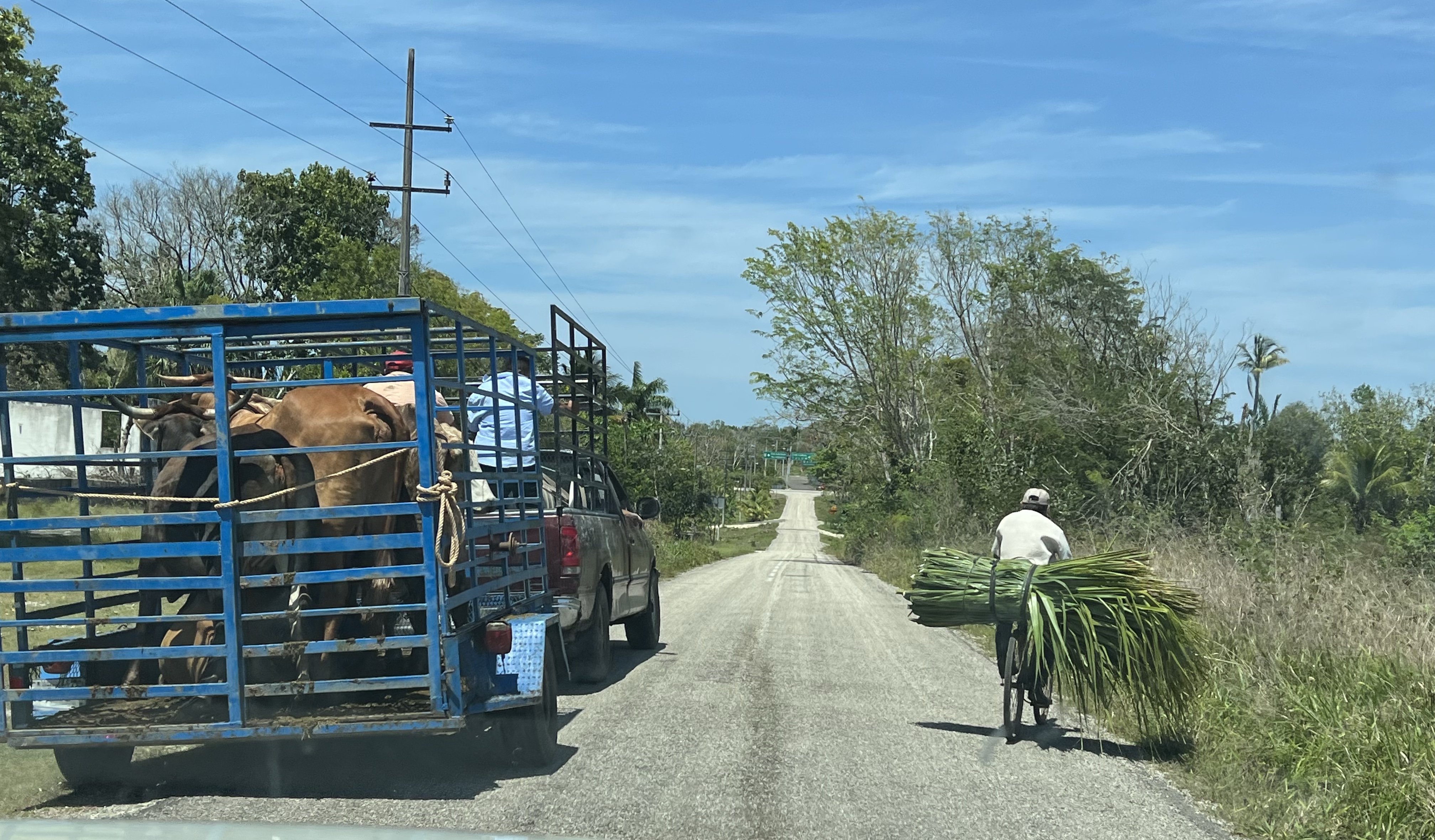 Ik wil graag naar de ruïnes. En het zou een donkere dag worden. Dus dat komt goed uit. We doen dan ook niet al te snel. We ontbijten op ons gemak. En rijden dan naar het noorden. Daar waar we gisteren van vandaan kwamen. Gisteren kwamen we er nl al langs. Ik wil naar Dzibanche en Kohunlich. Bij die laatste ben ik de vorige x ook geweest. En ik ben daar zeer benieuwd naar. De andere moet ook een mooie site zijn. Daar gaan we als eerste heen. Als we van de ‘grote’ weg afgaan wordt de weg smal. Maar is wel mooi. Het is nog wel een kwartier rijden om er te komen. We hobbelen over de topes heen en moeten dan. Og 1 keer afslaan. De weg werd al steeds slechter. Maar hier hield het eigenlijk gewoon op. Ik zie een paar mexicanen naar een touw rennen. En die spannen ze zooger de weg. Het zijn een stuk of 4 mannen en een vrouw. Een meneer is het opperhoofd. Of we willen betalen. 100 peso voor de weg. Jaja. Voor de weg. Dat gaat gewoon in hun zakken. Nee dat doen we niet. Het is niet veel geld maar het gaat om het principe. Ze laten het touw niet zakken. Ik dacht bekijk t even lekker. En R dacht daar hetzelfde over. Nog wat heen en weer gepraat en we vertrokken weer. Immers Kohunlich lag op ons te wachten. Tenminste als ze daar ook niet van die malle fratsen hebben. Met Ingrid destijds in Mexico spanden ze ook steeds touwen over de weg maar toen wilden ze nog fruit verkopen. Wat we overigens ook nooit deden. Maar dan deden ze wel het touw naar beneden.