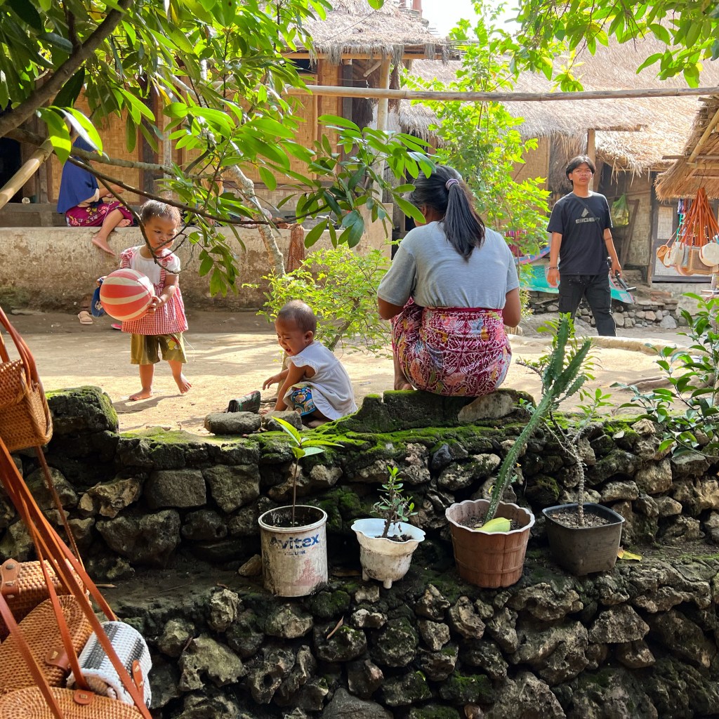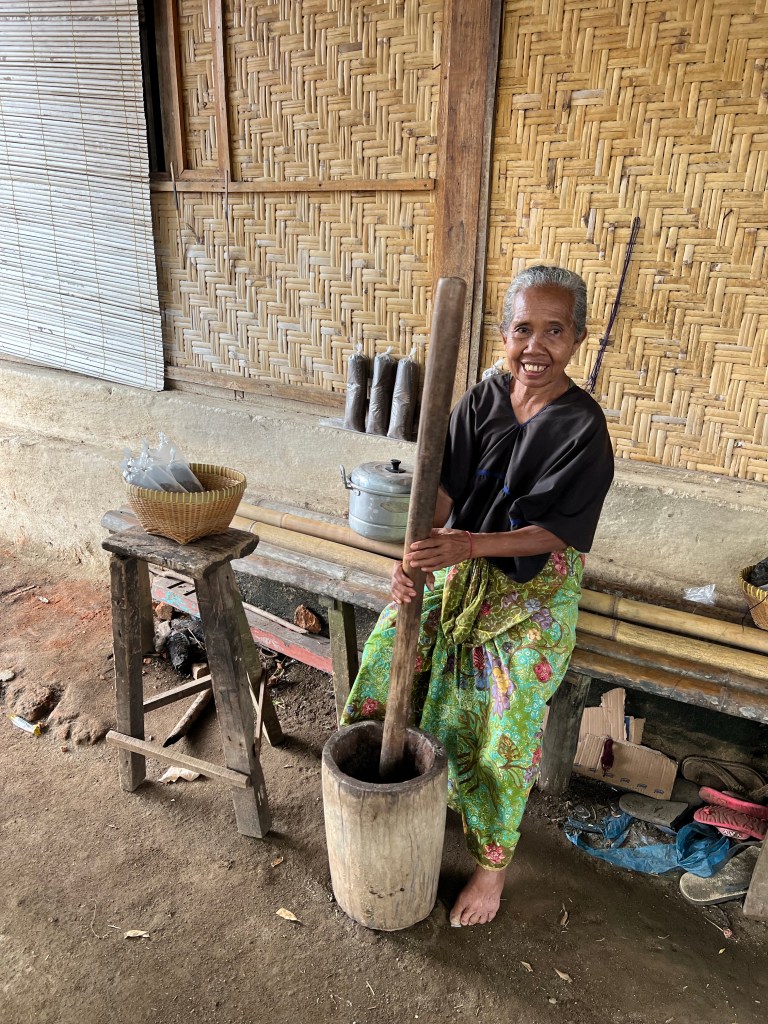 Er loopt een man en een vrouw. De man spreekt wat Nederlands en is beperkt. Hij vraagt zeker 5 keer of we een wandeltocht willen maken, wat we willen drinken maar hij is erg gastvrij. We mogen ook nog even het huis bekijken. De man weet alles van de omgeving. Wijst me een cacaoplant aan. Inmiddels ga ik naar het toilet. Dan hoor ik mississ mississ. Ik dacht even dat ie me achterna kwam in de wc. Maar dat was niet zo. Hij staat met de cacaovrucht in de hand. En of ik er van hou. Ik zie jaaa ik hou erg van chocola. Ja zegt ie. Dat doen alle vrouwen. Nou dan ben je klaar. Maar goed we willen wat drinken. Ze hebben niet zoveel. En het is allemaal lauw. En M wil aan de wandel. Dus uiteindelijk wordt ze de velden ingestuurd. En veel succes! Ik had me toch iets anders voorgesteld. Maar glibberglabber ga ik naar beneden en stort me op de rijstvelden. Tis wel weer een avontuur. Nadat ik in de bananenbomen heb gehangen, over slootjes ben gesprongen, geschrokken ben van een kikker en verder veel foto’s heb gemaakt kom ik bezweet weer terug. En stort me gelijk op de 1,5 liter fles water. Kleiner hadden ze niet. De volgende stop is Kuta. 1,5 uur verder. Mooi aan het strand gelegen het dorp dan. Wij niet. We eten met uitzicht op zee. Het is er wel wat uitgestorven. En als laatste stop hebben we Sade. Een dorp met inwoners van de stam Sasak. De oorspronkelijke bewoners van Lombok. Het hele dorp is een toeristische attractie geworden. Je ziet wel hoe ze leven maar door alle verkoopwaar zie je het bijna niet meer. Jammer. Zo de dag zit er op. En eigenlijk Lombok ook. Morgen trekken we weer verder. In die paar dagen hebben we veel gezien en gedaan. Lombok is zeker een bezoek waard!