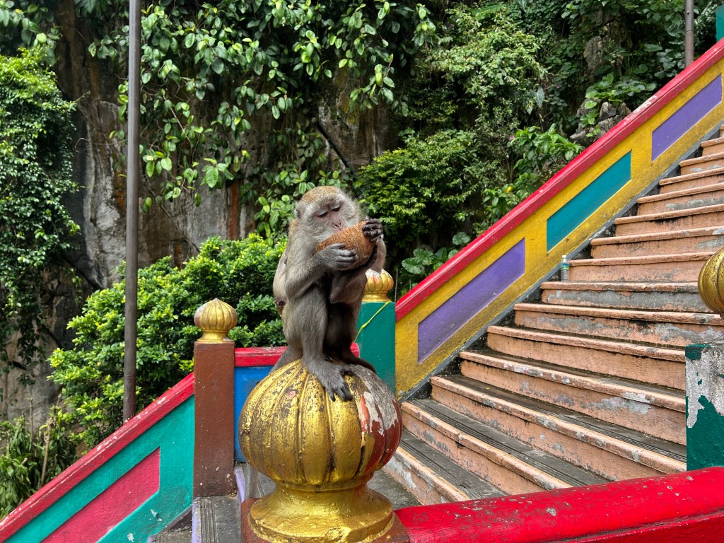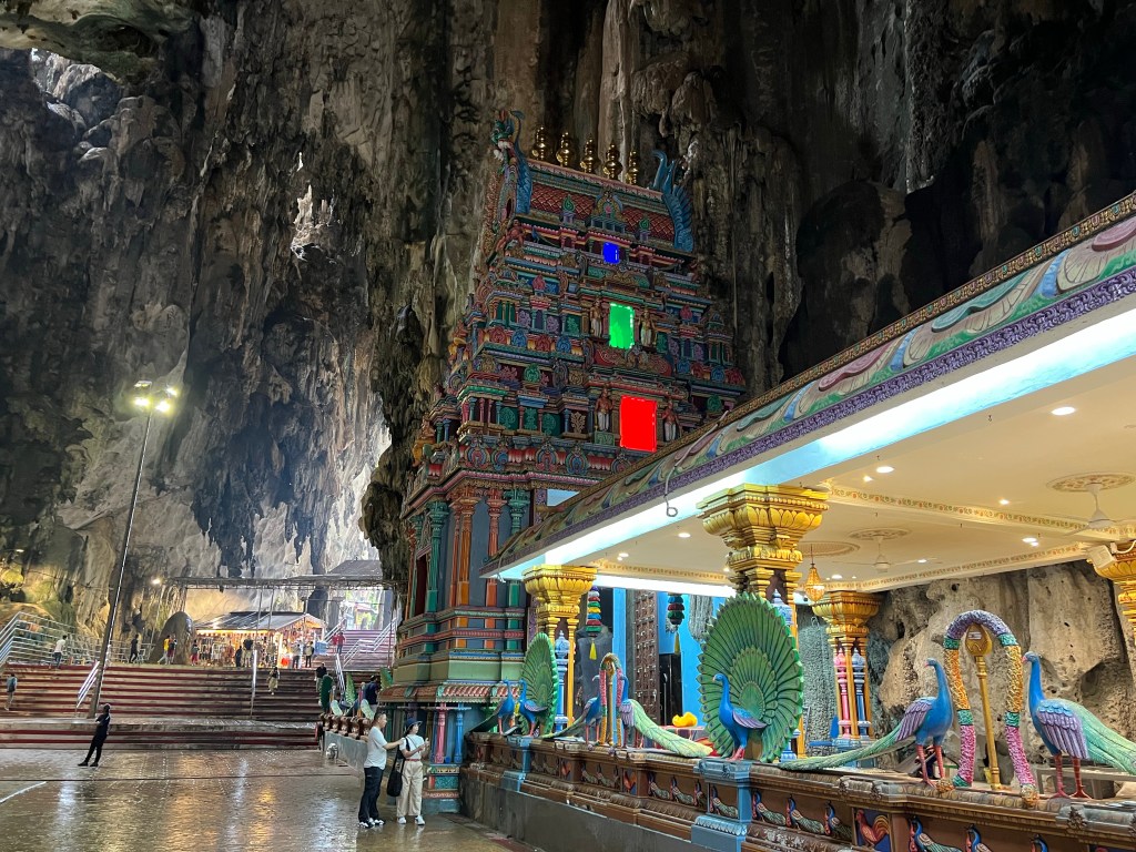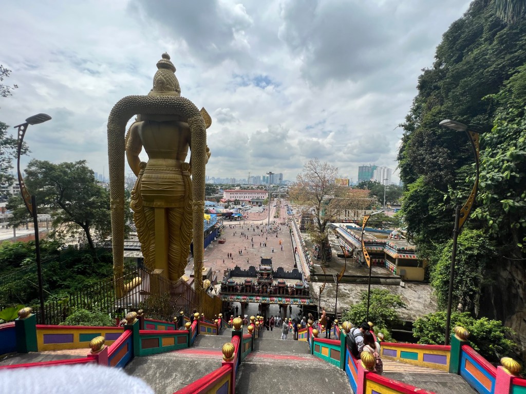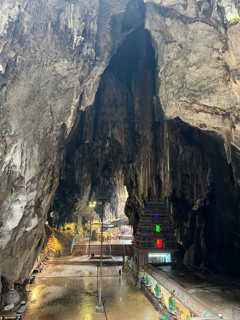 En dan de Batu Caves. Van Wikipedia: De grootste grot, de Tempel- of Kathedraalgrot, is 400 meter lang en 100 meter hoog en bereikbaar via een hoge trap met 272 treden. Onder aan de trap staat een groot beeld van de oorlogsgod Murugan. Het is een heilige plaats. In de grot wordt het jaarlijkse hindoeïstische Thaipusamfestival gevierd.