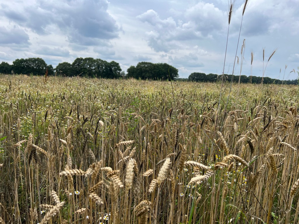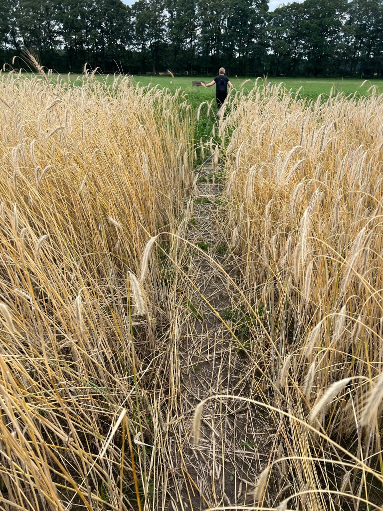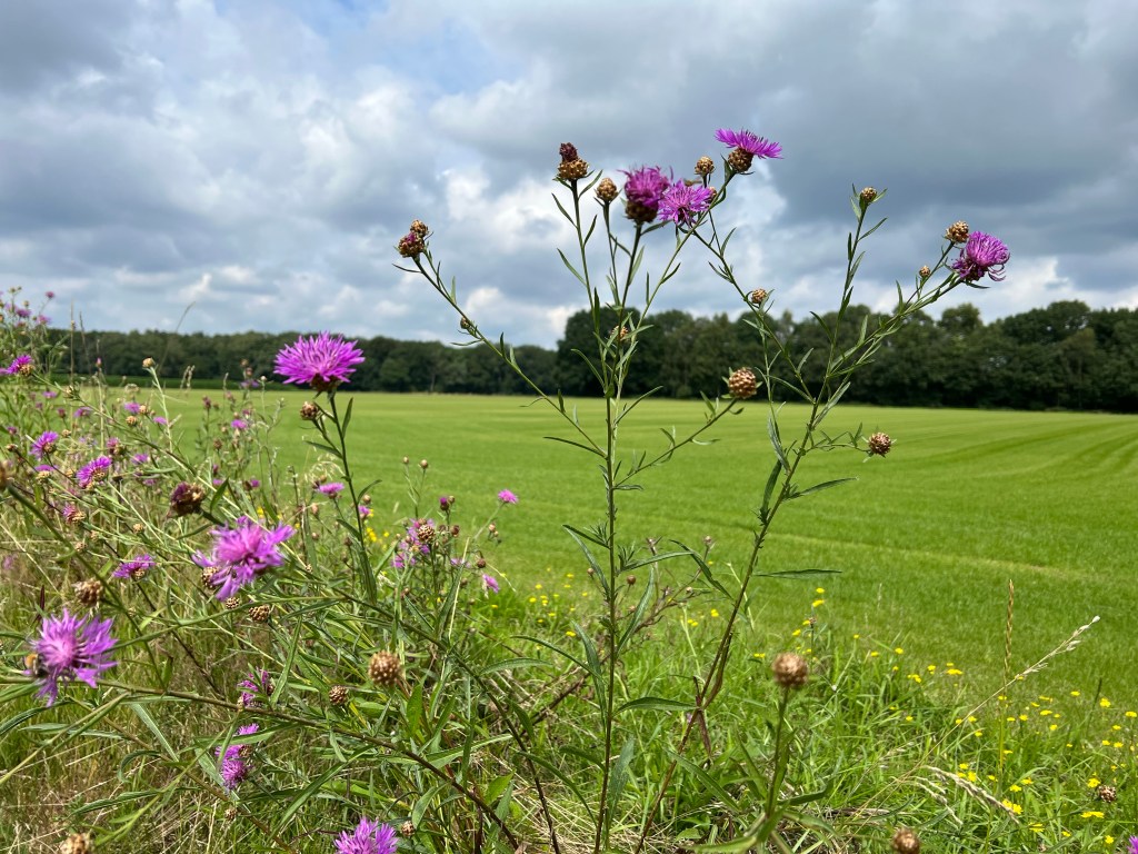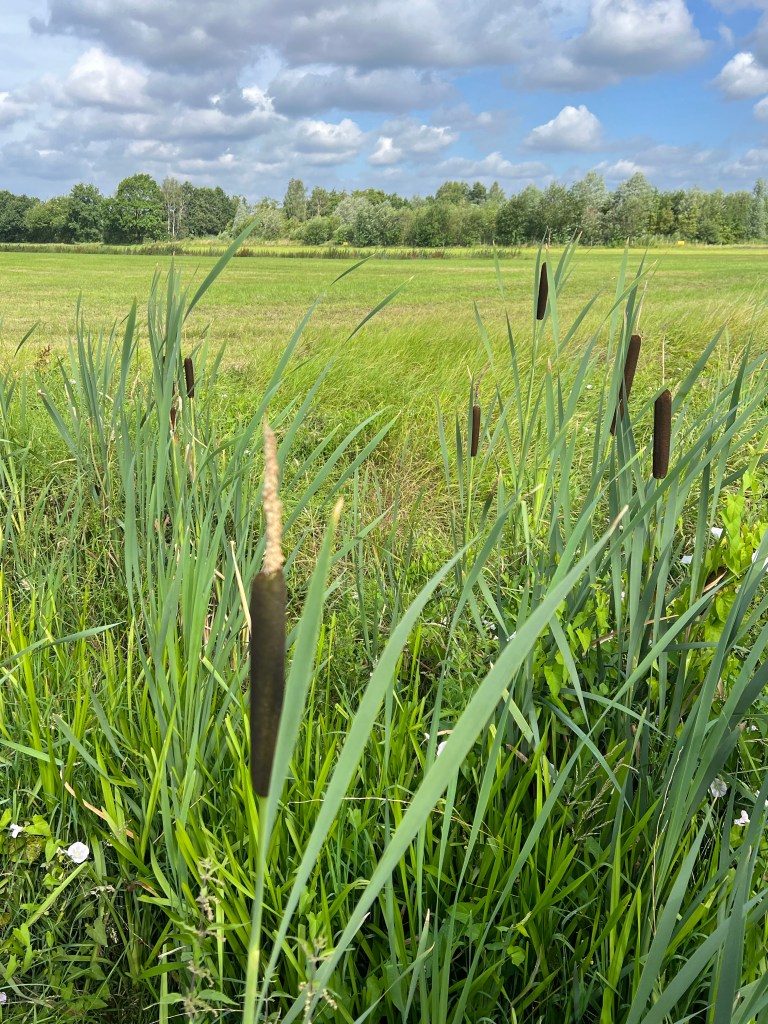 Lekker vroeg afgesproken dan hebben we de hele dag (nou ja dat is niet de bedoeling) de tijd. We lopen de route rechtsom. Met de klok mee. We lopen gelijk door de maisvelden en de grote lisdodden staan fier aan de kant. En zien het Bleeke Meer liggen. Daar wordt regelmatig een ijsvogel gezien. Wij helaas niet. De app geeft altijd meer informatie. Kijk daar dan ook regelmatig even op. Als je het goed instelt krijg je een waarschuwing. We lopen afwisselend langs boerderijen, zandpaden, kleurige bloemen en bos. We doen de verlengde route, want zoals ik meestal zeg: voor een korte route komen we ons bed niet uit. Dat is natuurlijk niet waar want in mijn woonplaats lopen we regelmatig een kort ommetje. Maar zo met mijn vriendinnen gaan we voor wat verder. We komen door het bosgebied van het Kroondomein Het Loo. Donkere wolken pakken zich soms samen. Maar tot nu toe houden we het droog. We wandelen langs een berm met allemaal weidebloemen. Een prachtig gezicht. Dan waden we ons door een pad met aren, we gaan dwars door een aardappelveld en we gebruiken de echte klompenpaden klimmetjes om van het ene veld in het andere te komen.