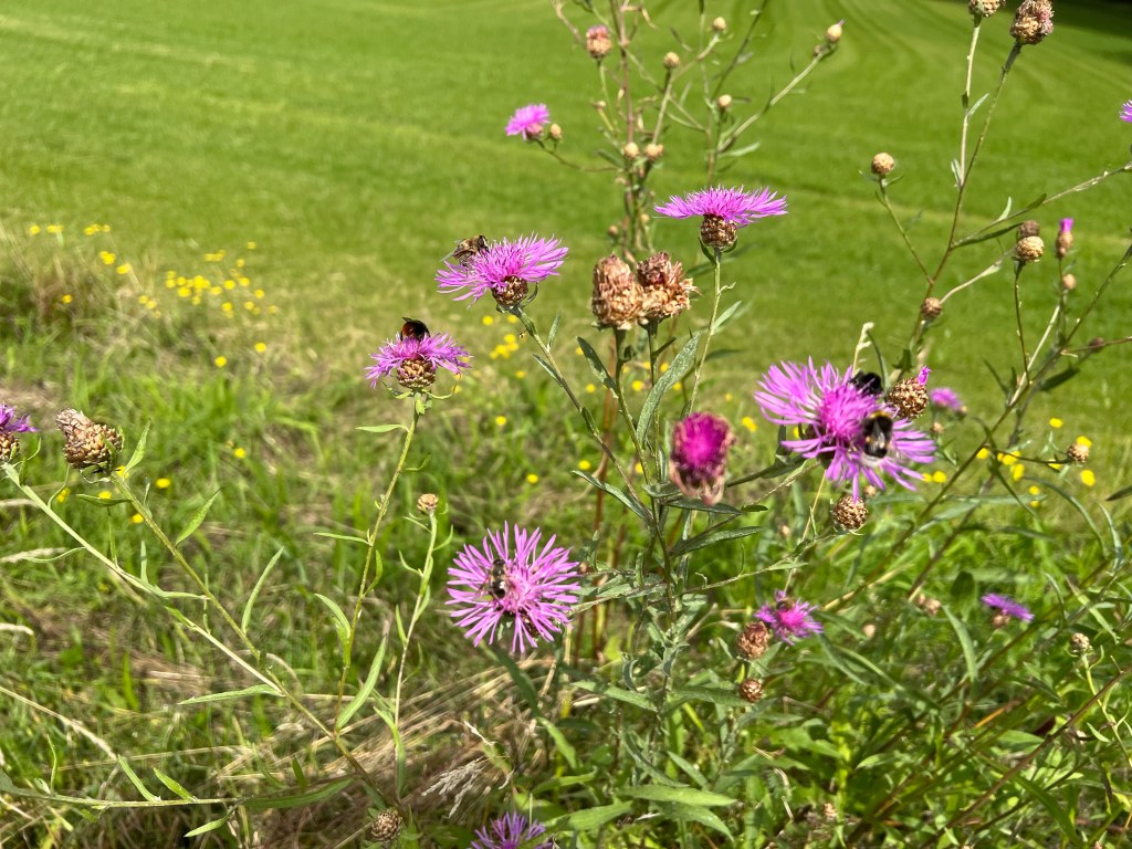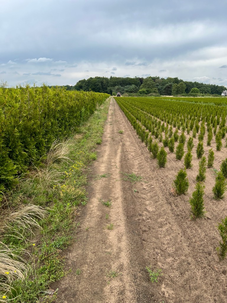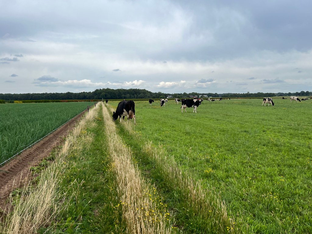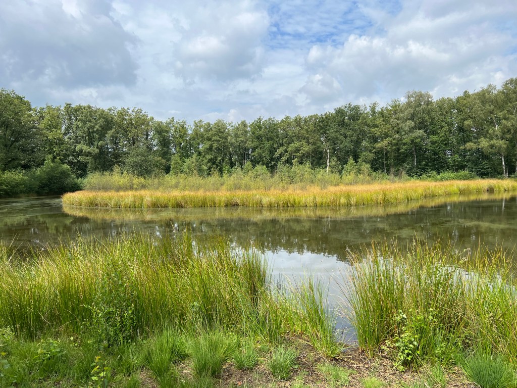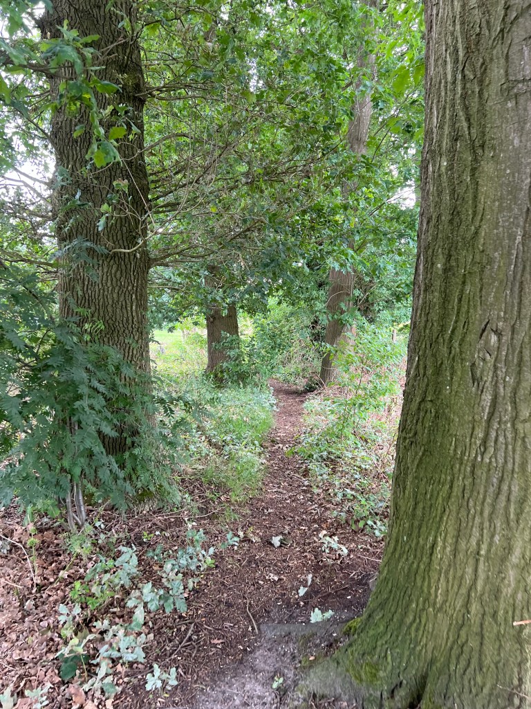 Lekker vroeg afgesproken dan hebben we de hele dag (nou ja dat is niet de bedoeling) de tijd. We lopen de route rechtsom. Met de klok mee. We lopen gelijk door de maisvelden en de grote lisdodden staan fier aan de kant. En zien het Bleeke Meer liggen. Daar wordt regelmatig een ijsvogel gezien. Wij helaas niet. De app geeft altijd meer informatie. Kijk daar dan ook regelmatig even op. Als je het goed instelt krijg je een waarschuwing. We lopen afwisselend langs boerderijen, zandpaden, kleurige bloemen en bos. We doen de verlengde route, want zoals ik meestal zeg: voor een korte route komen we ons bed niet uit. Dat is natuurlijk niet waar want in mijn woonplaats lopen we regelmatig een kort ommetje. Maar zo met mijn vriendinnen gaan we voor wat verder. We komen door het bosgebied van het Kroondomein Het Loo. Donkere wolken pakken zich soms samen. Maar tot nu toe houden we het droog. We wandelen langs een berm met allemaal weidebloemen. Een prachtig gezicht. Dan waden we ons door een pad met aren, we gaan dwars door een aardappelveld en we gebruiken de echte klompenpaden klimmetjes om van het ene veld in het andere te komen.